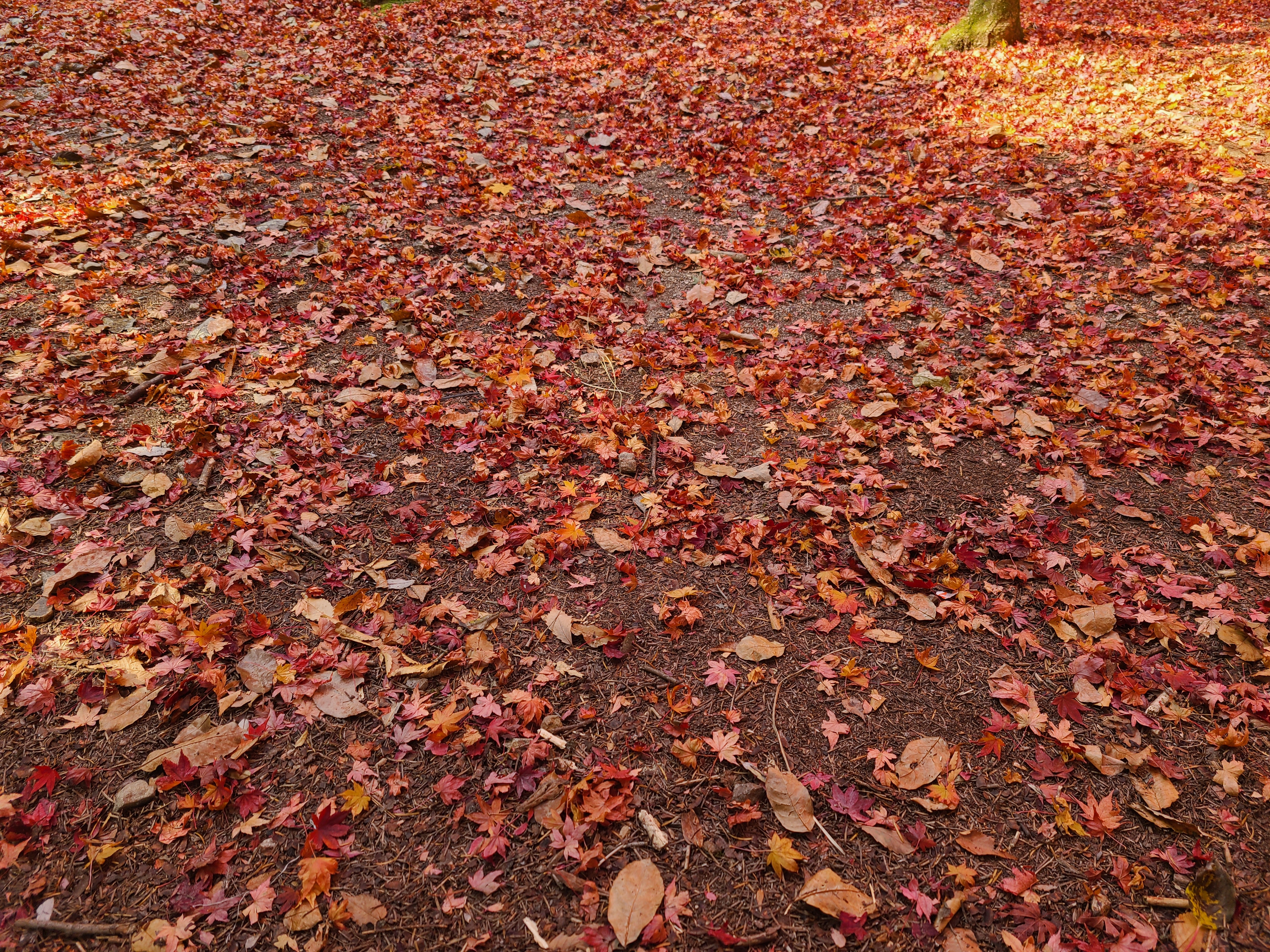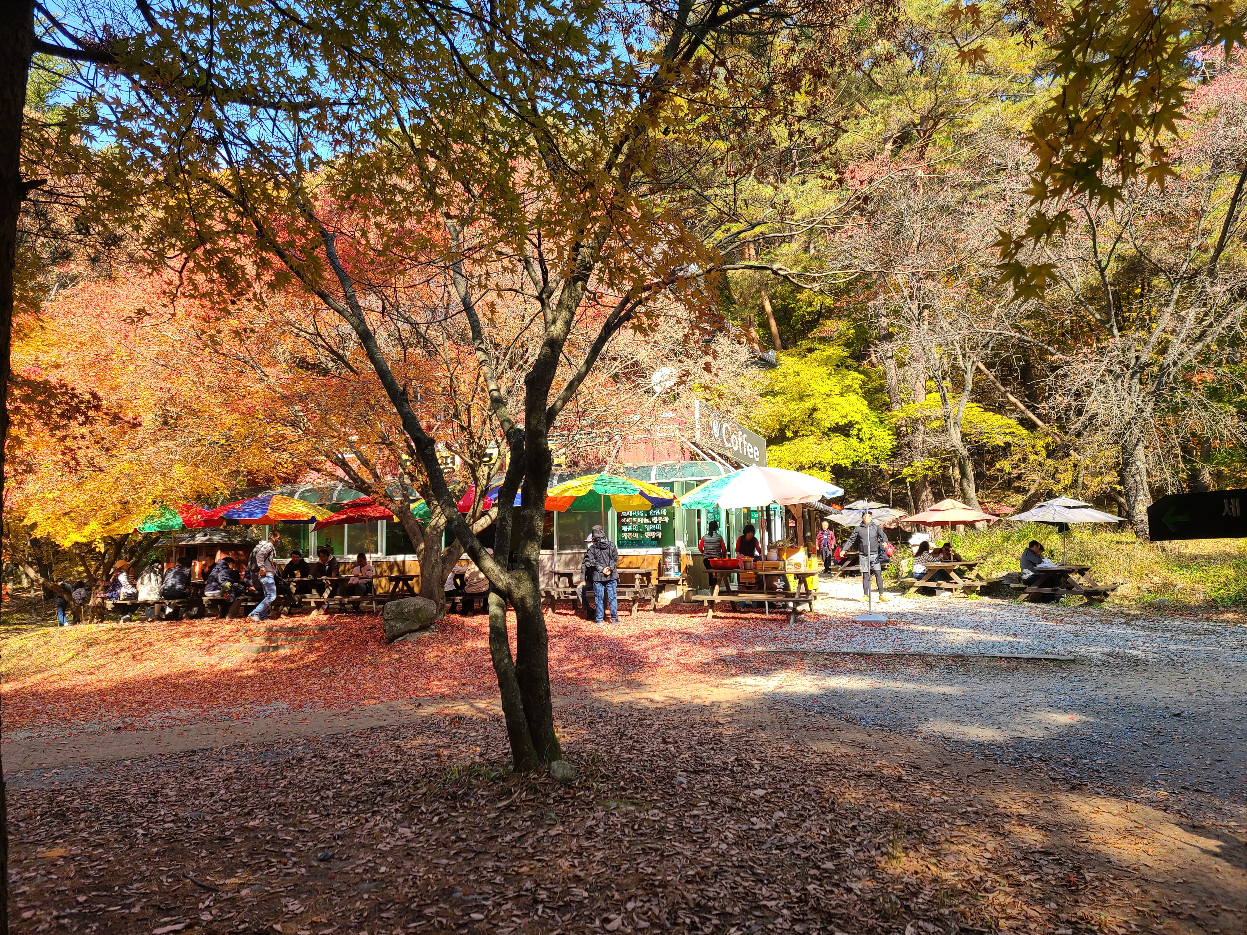 문장대와 천왕봉 갈림길 길목에 있는 태평휴게소 앞에는 붉은 낙엽들이 쏟아져 내려 융단을 깔아놓은 듯하다.