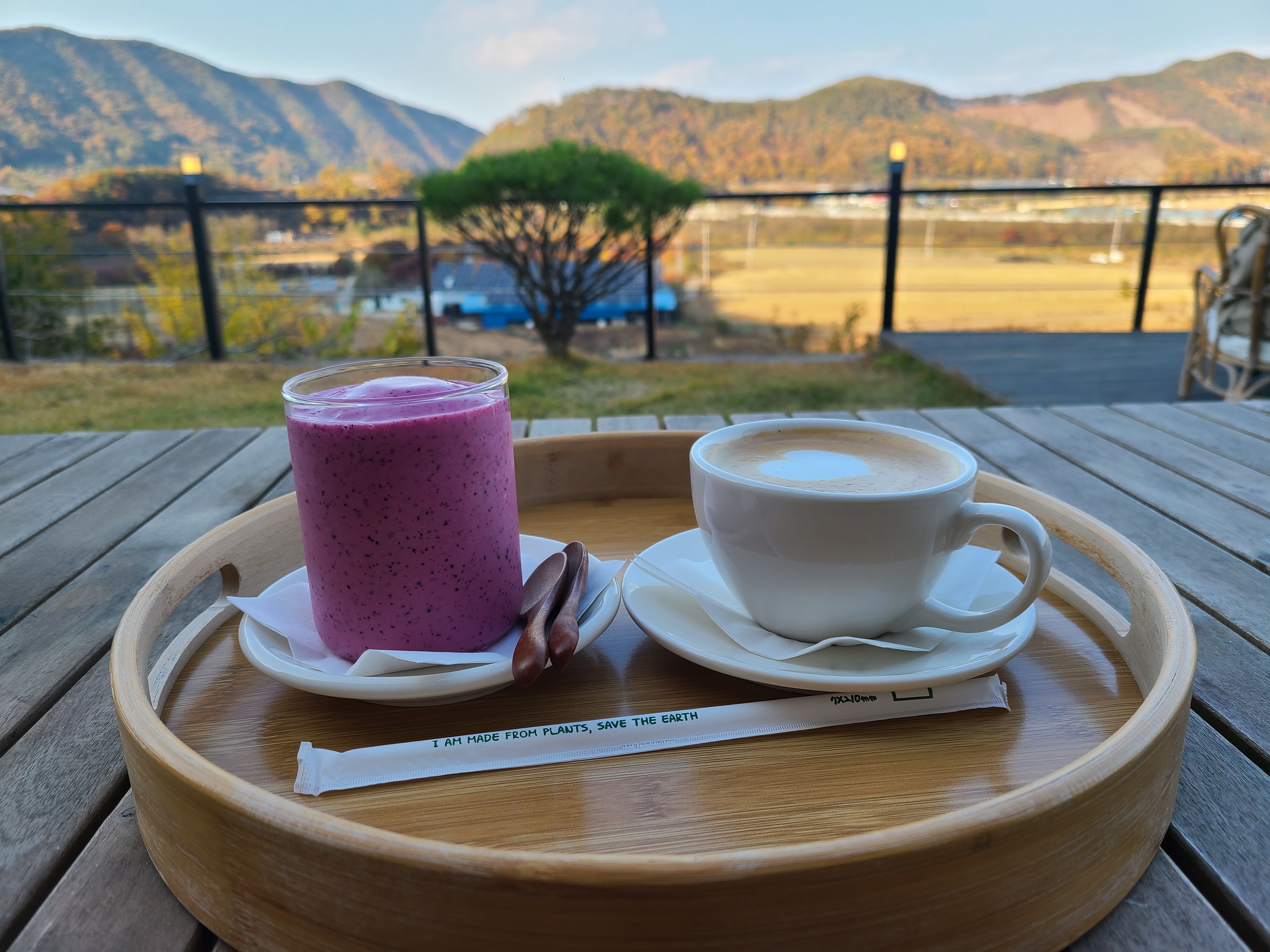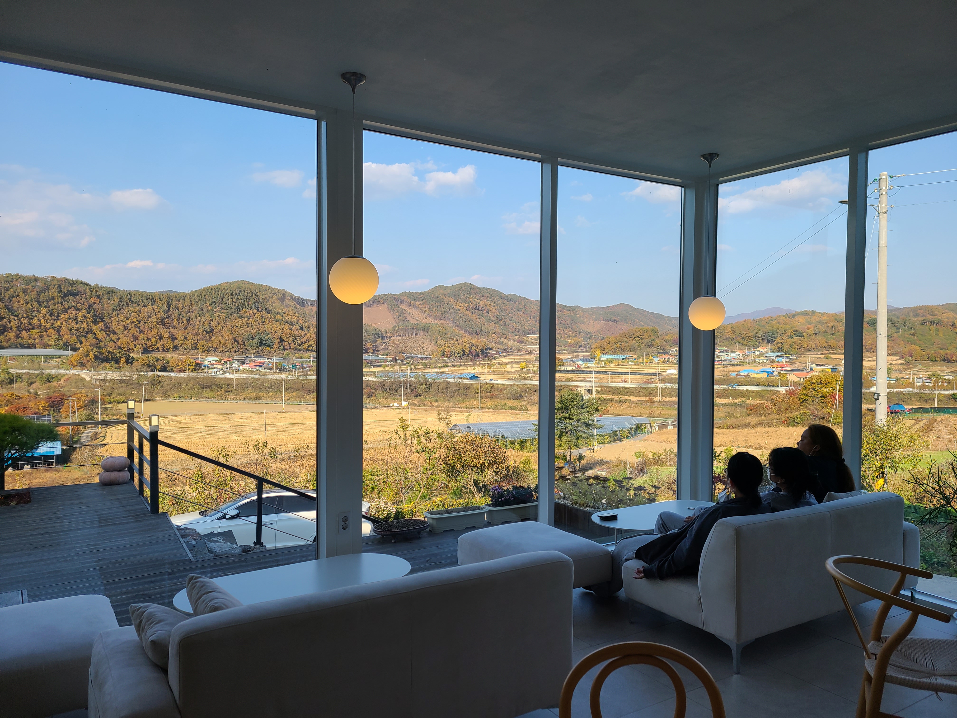 실내는 그리 넓지 않지만 통유리를 통해 황금빛으로 물든 들판을 내다볼 수 있었고 야외에는 테이블과 그네가 있어 한적하게 시간을 보내기 좋은 곳이었다.