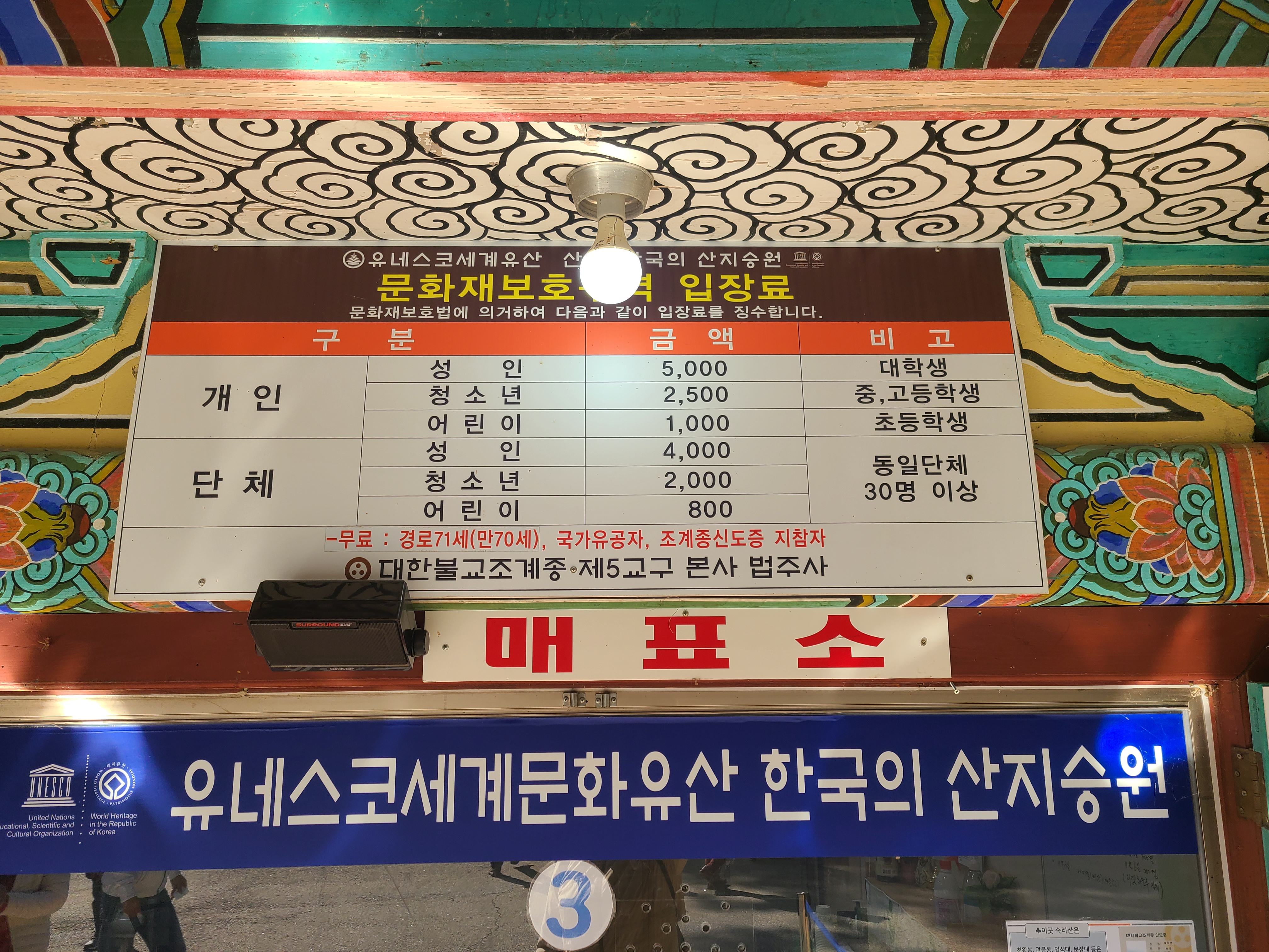 법주사 매표소 입장료는 성인 1인 기준 5,000원이다.