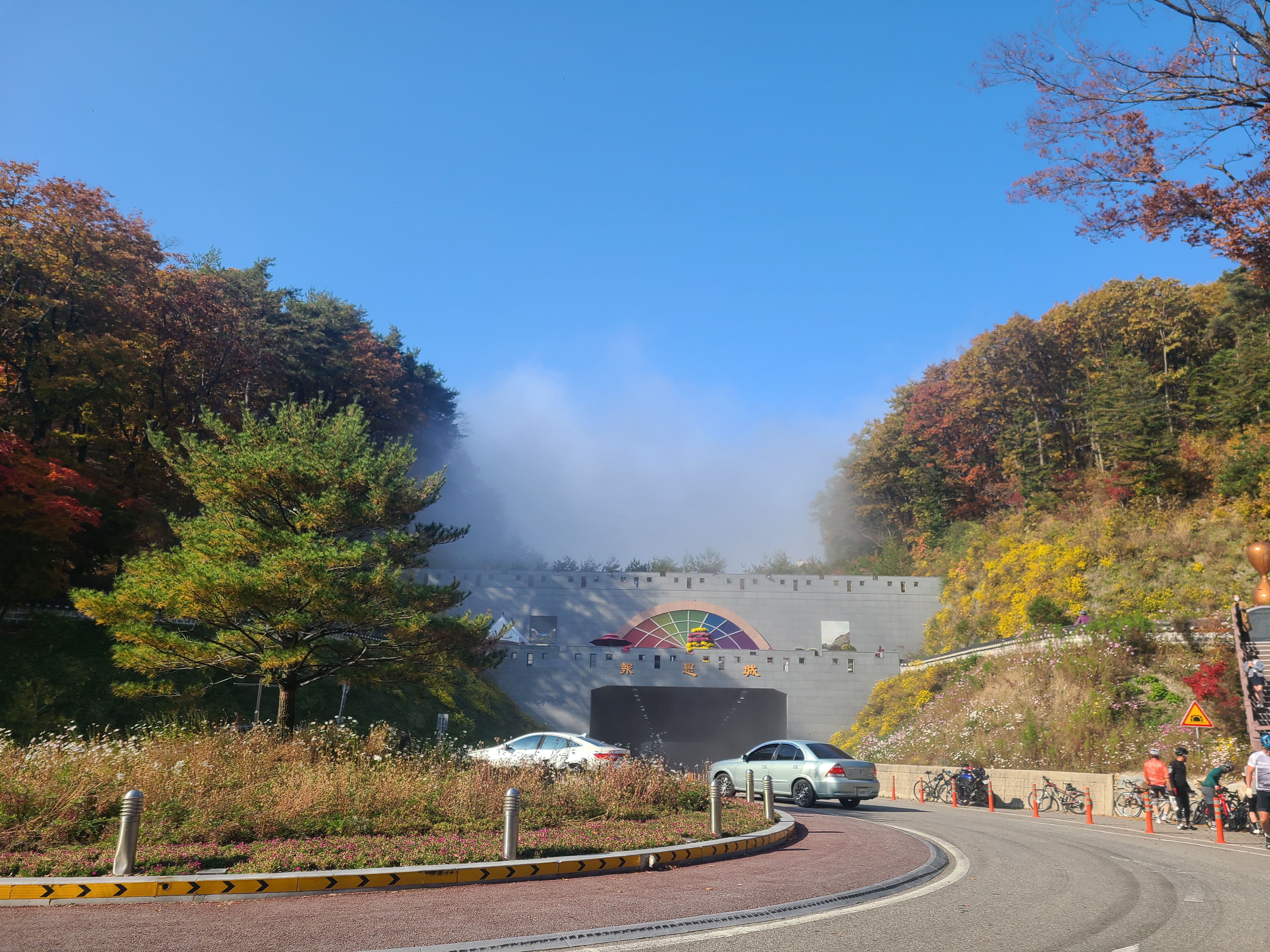 말티재 전망대를 향해 올라가는데 터널 너머로 안개구름이 피어오르는 모습이 보인다.