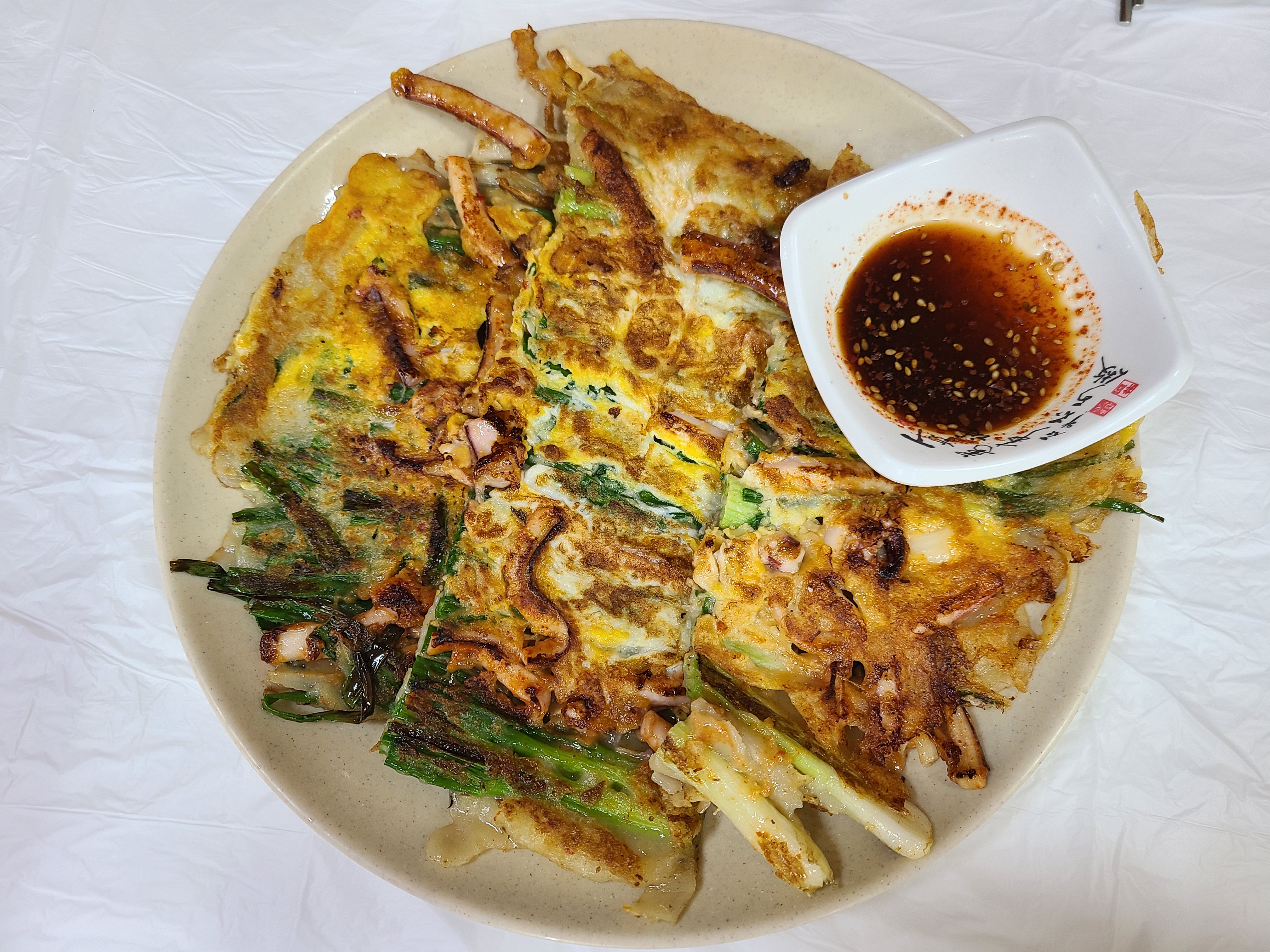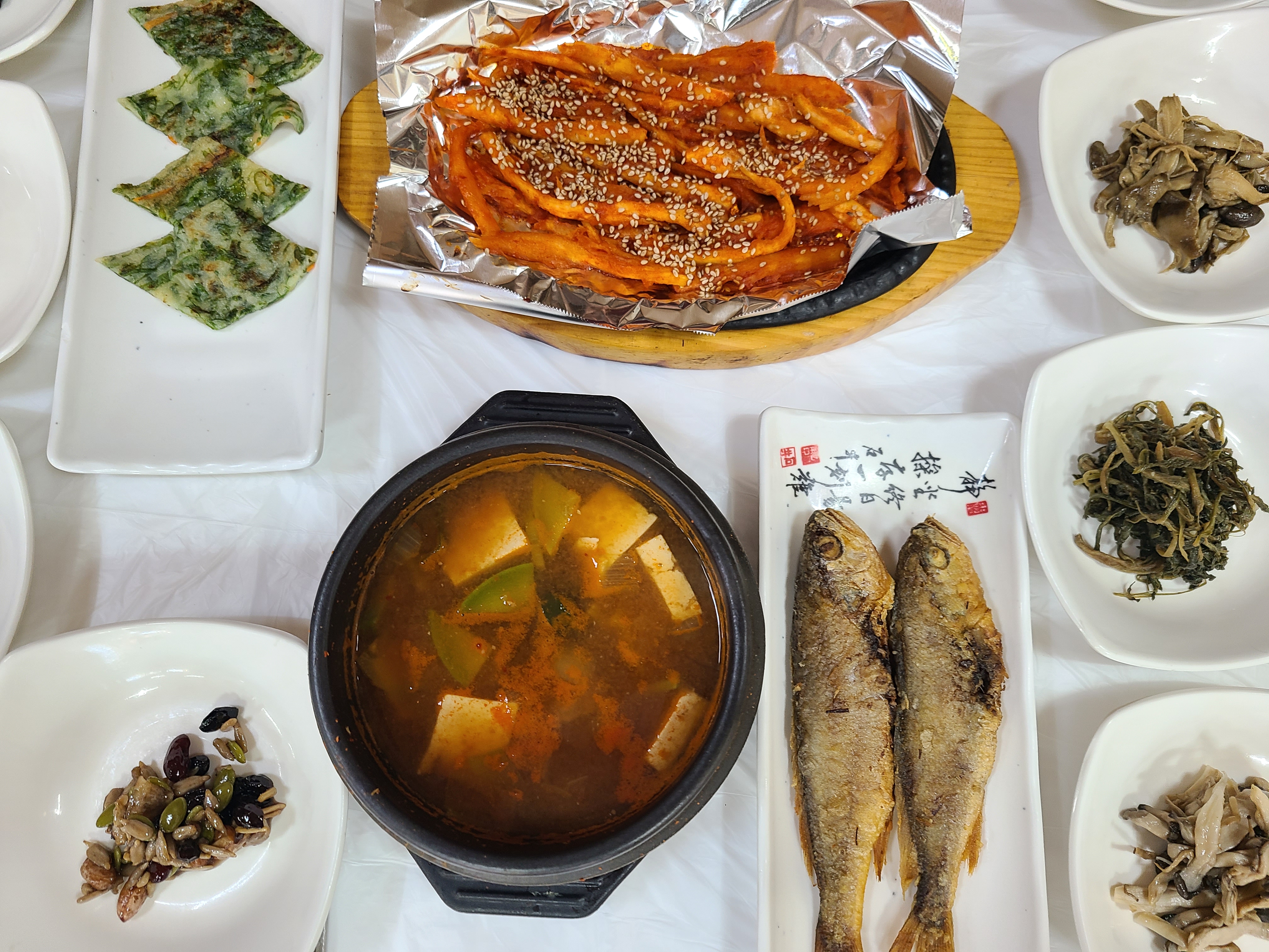 상점들을 지나고 나면 도로 양쪽에 음식점이 줄지어 있는데 그중 사람이 많아 보이는 집으로 들어가서 더덕 정식과 파전을 주문했다.