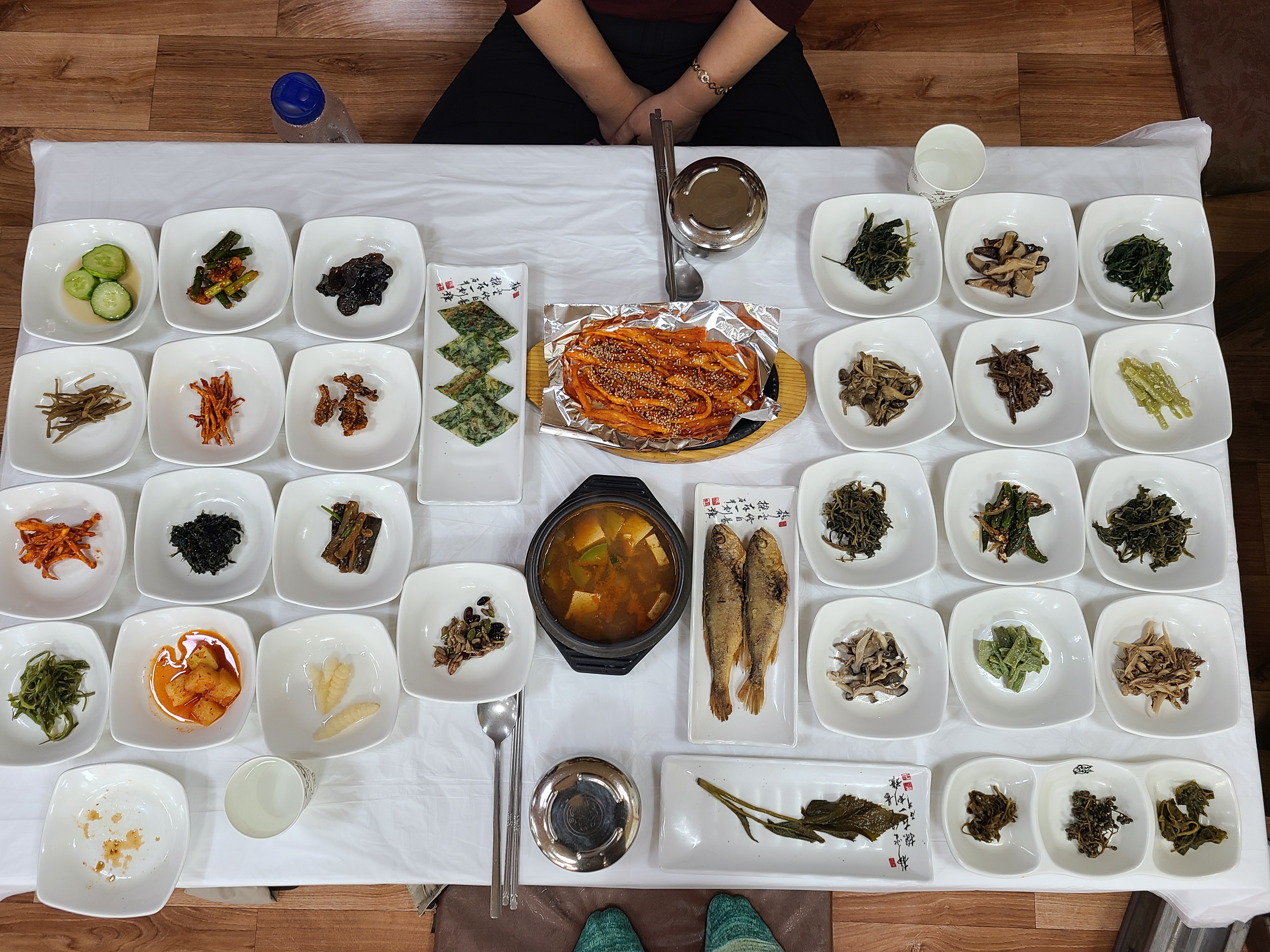 맑은 공기를 마시며 단풍구경을 하느냐 걸었더니 음식이 더 맛있는 듯하다. 반찬이 상위에 하나 가득 나왔는데 더덕구이와 된장찌개가 가장 맛있었다.