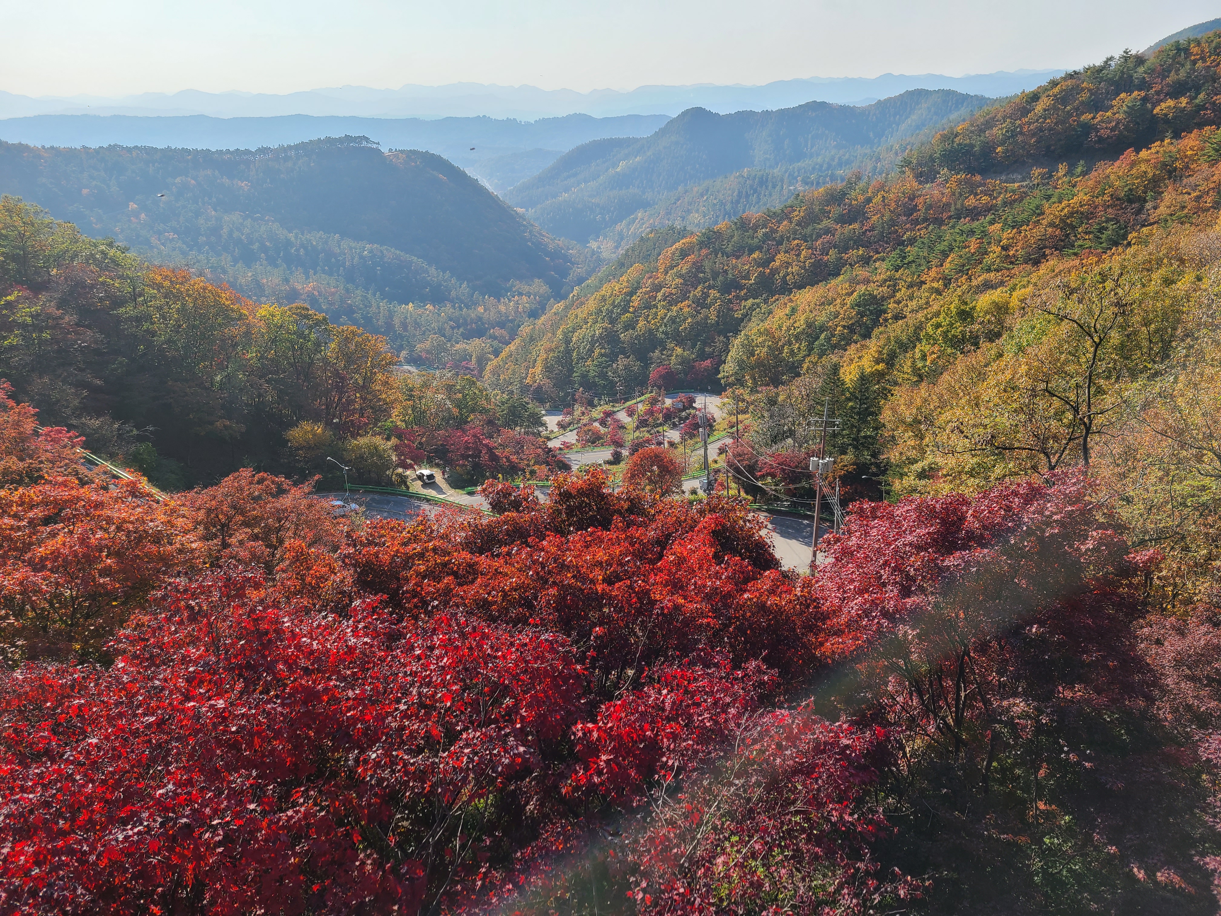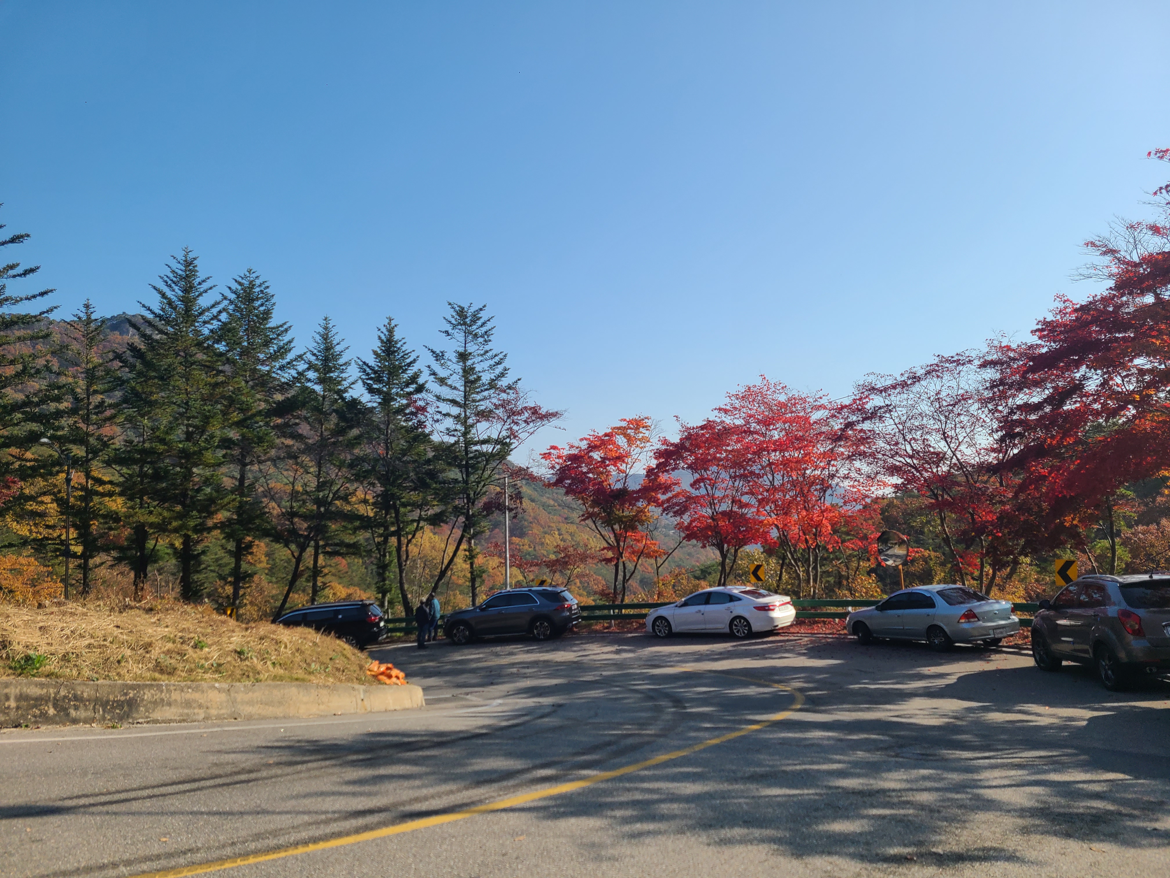 속리산 법주사에 있는 세조길을 걷고 돌아오는 길에 말티재 전망대에 도착하니 오후 3시가 되었고, 12 굽이 꼬부랑길에 단풍이 물든 모습을 한눈에 볼 수 있었다.