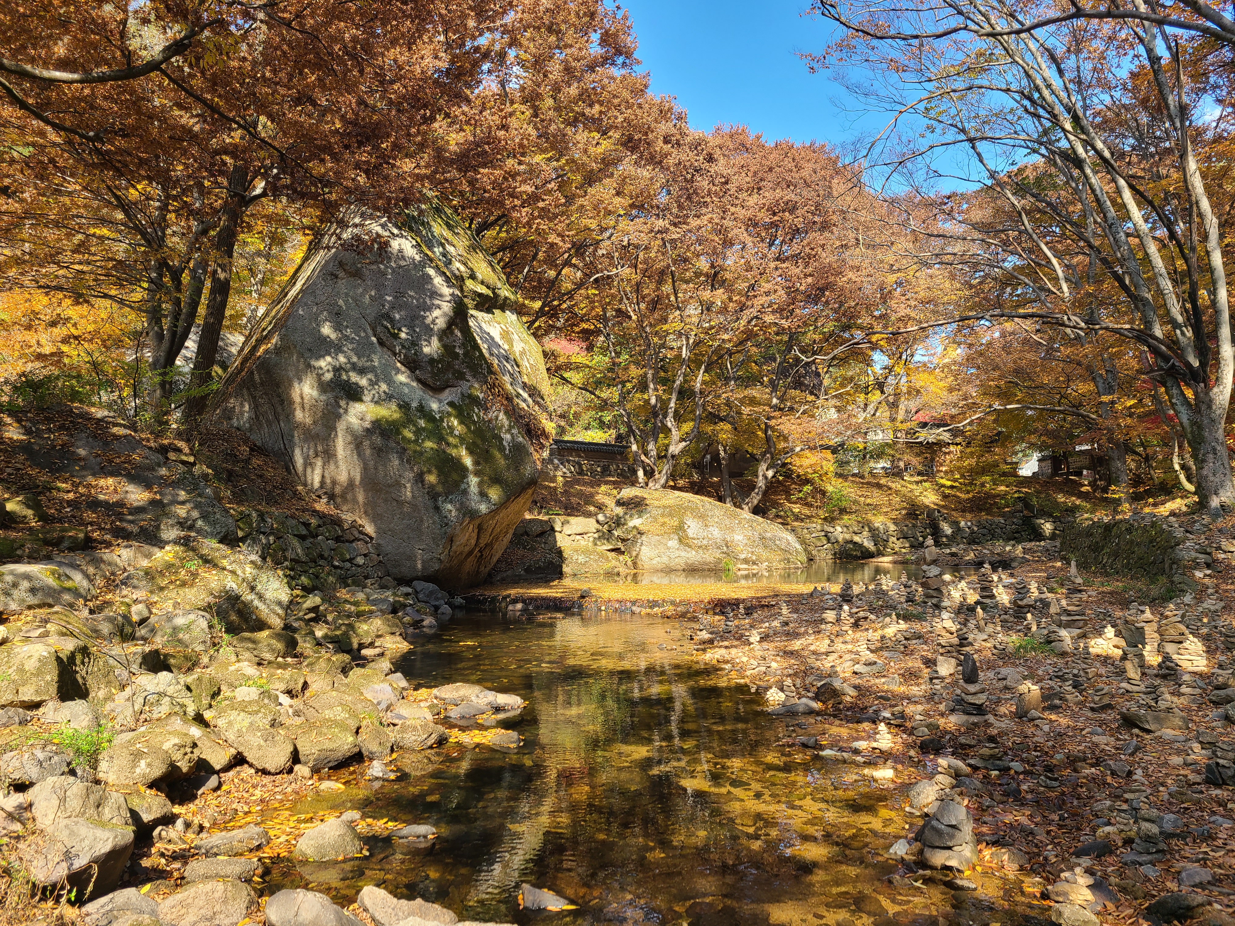 법주사를 둘러보고 나오는 길에 계곡을 건너는데 물가에 돌탑들이 늘어선 모습이 보인다.