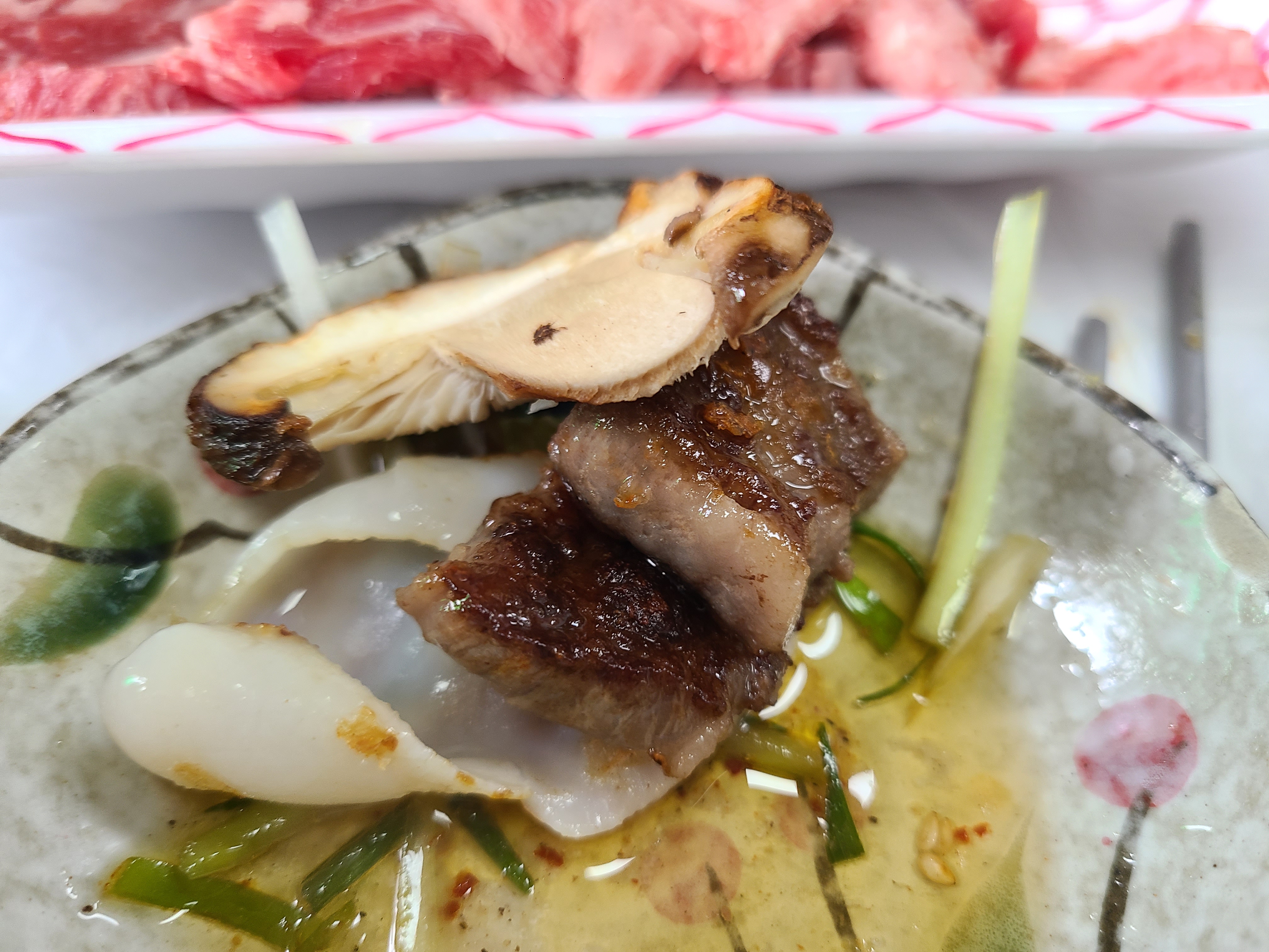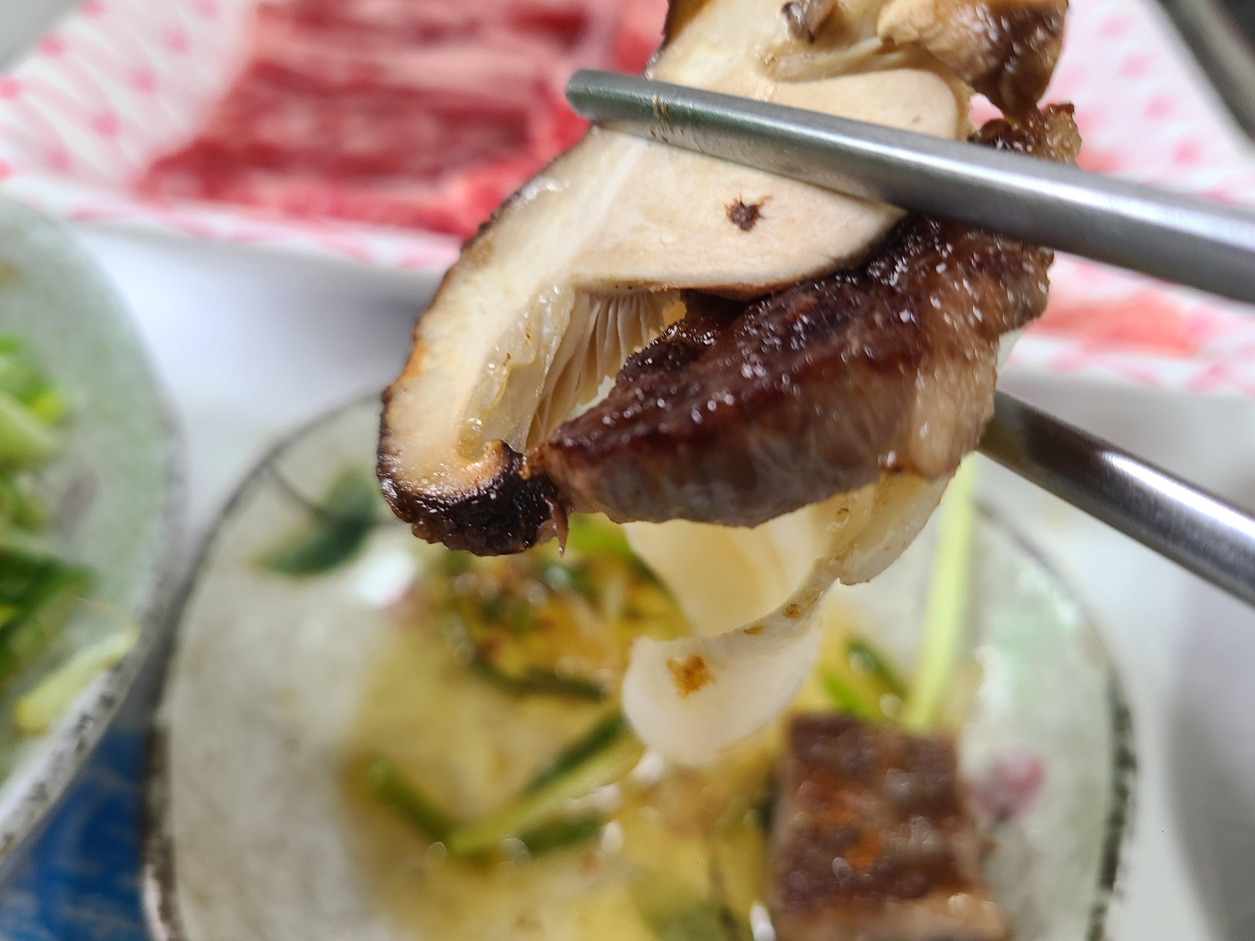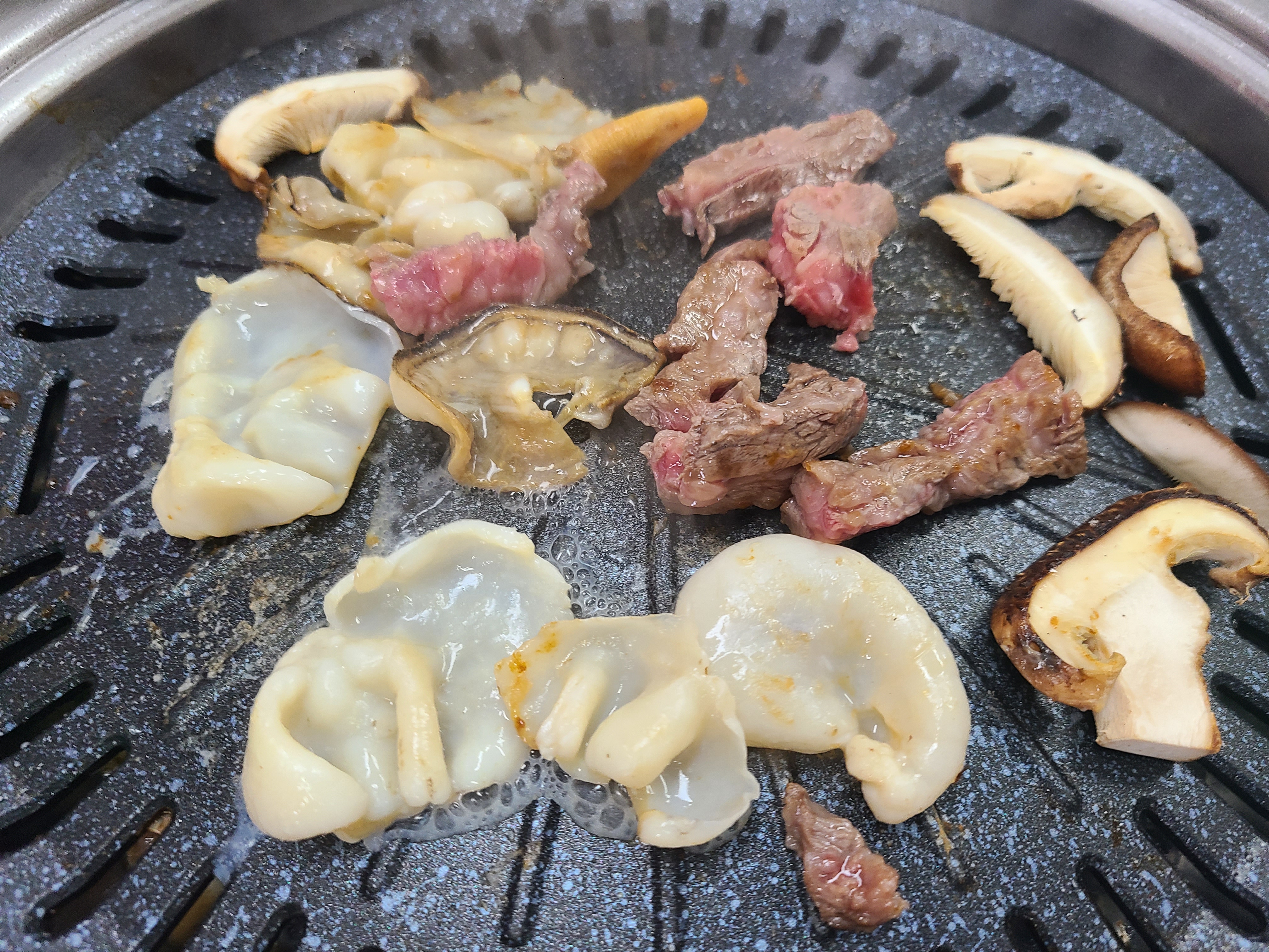 소고기와 관자 그리고 표고버섯이 구워지기 무섭게 먹느냐 불판에 처음 고기를 얹은 사진은 없다.