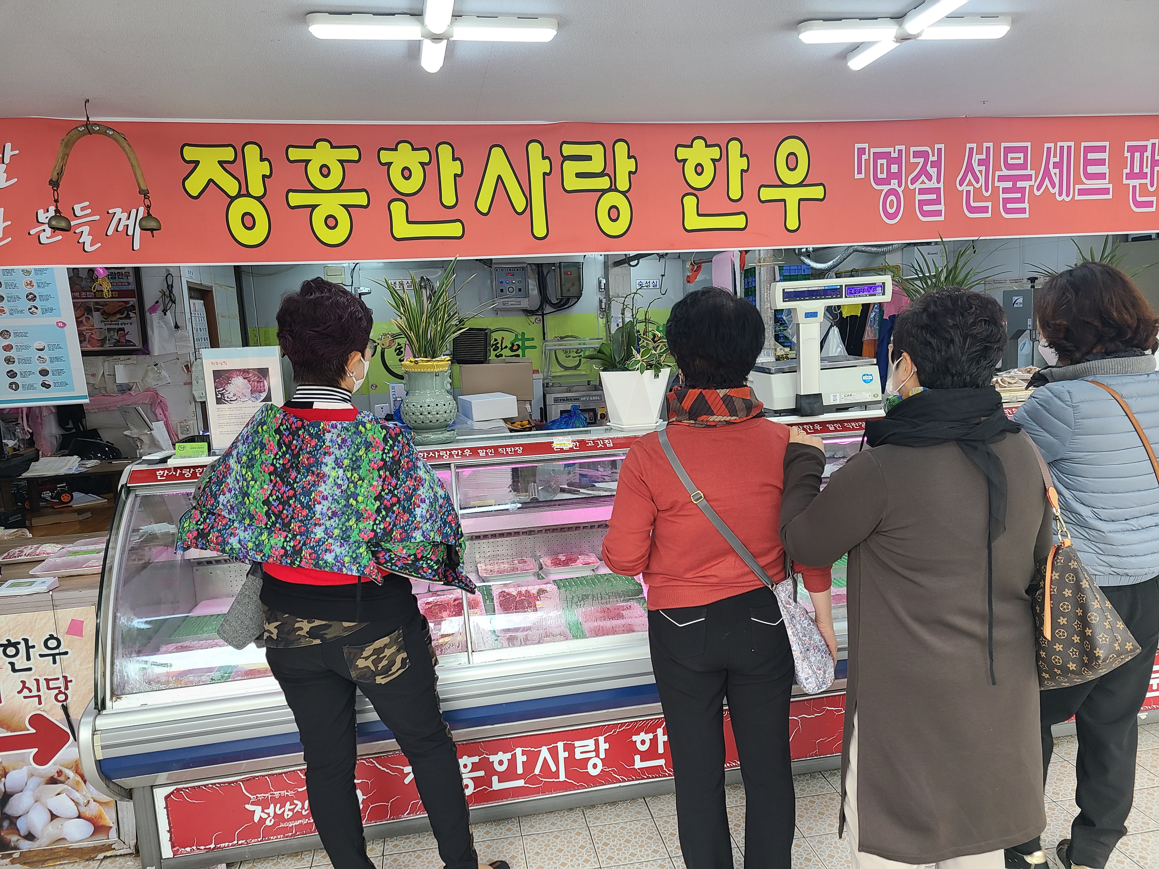 장흥 토요시장은 한우와 키조개 그리고 표고버섯을 함께 구워 먹는 삼합이 유명하다.