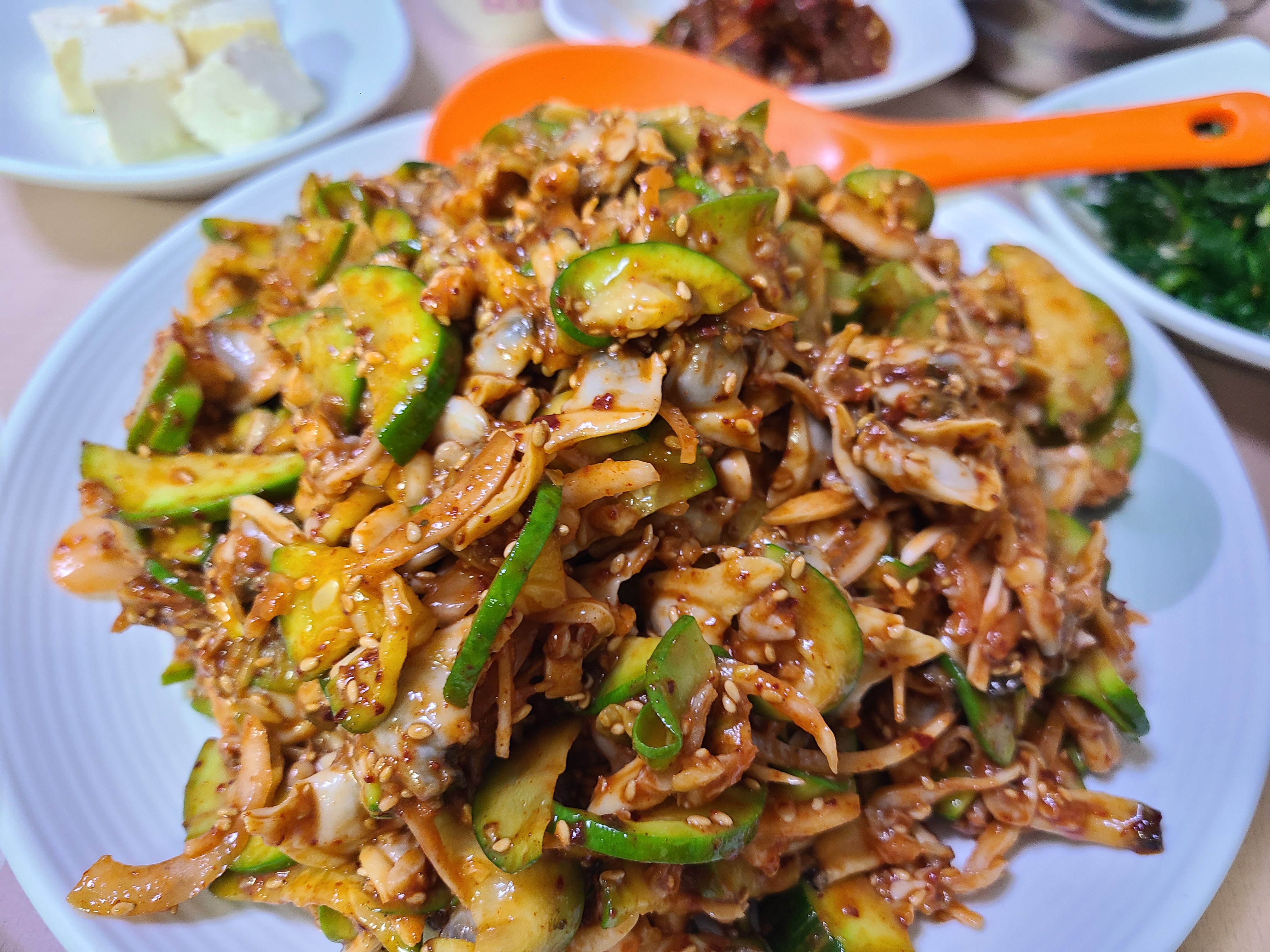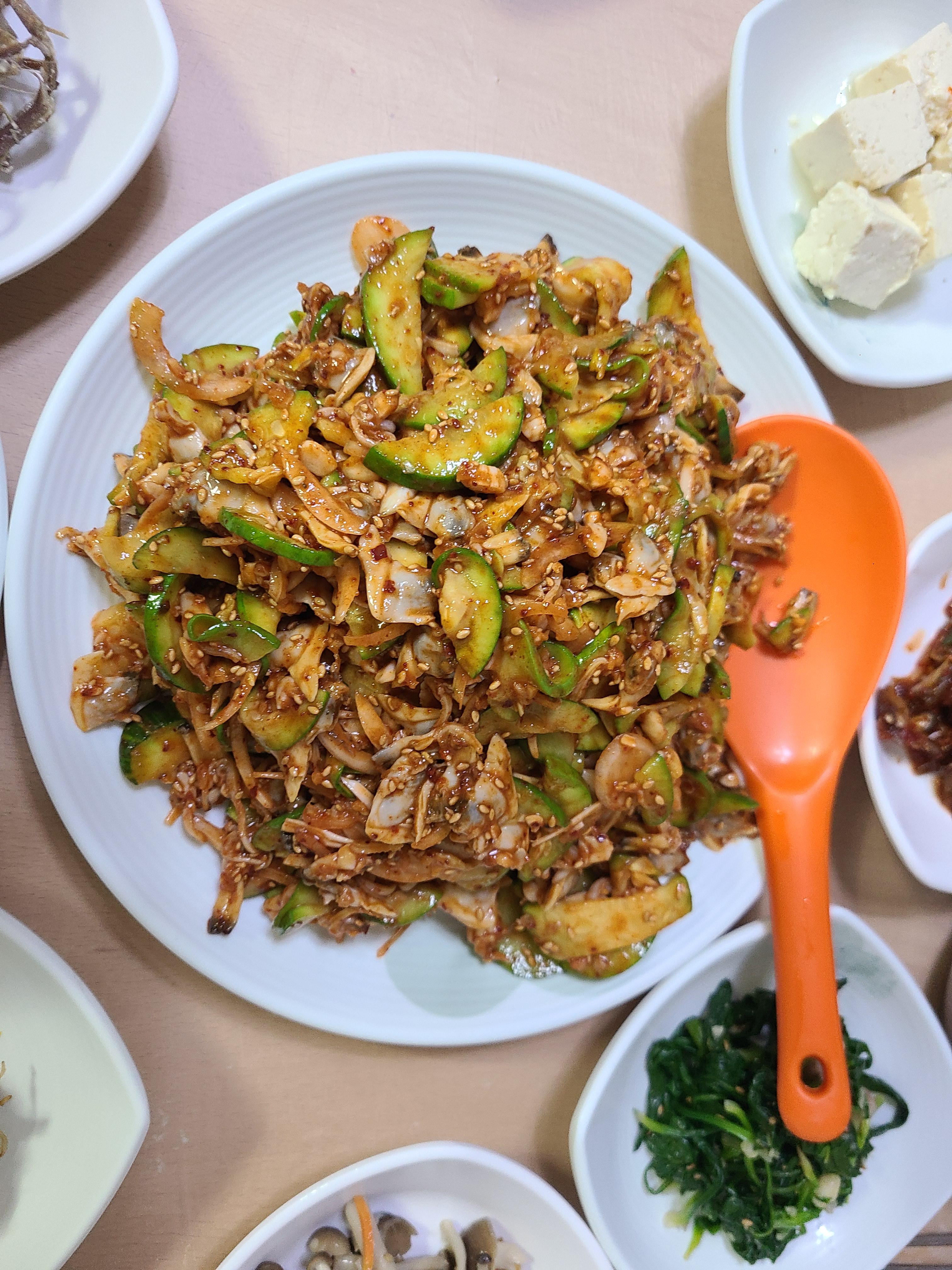 일행 중 바지락 회무침이라는 말에 거부감을 느껴 자신은 백반을 먹겠다고 했는데 익혀서 초무침한 거라고 하니 안심하고 먹었다.