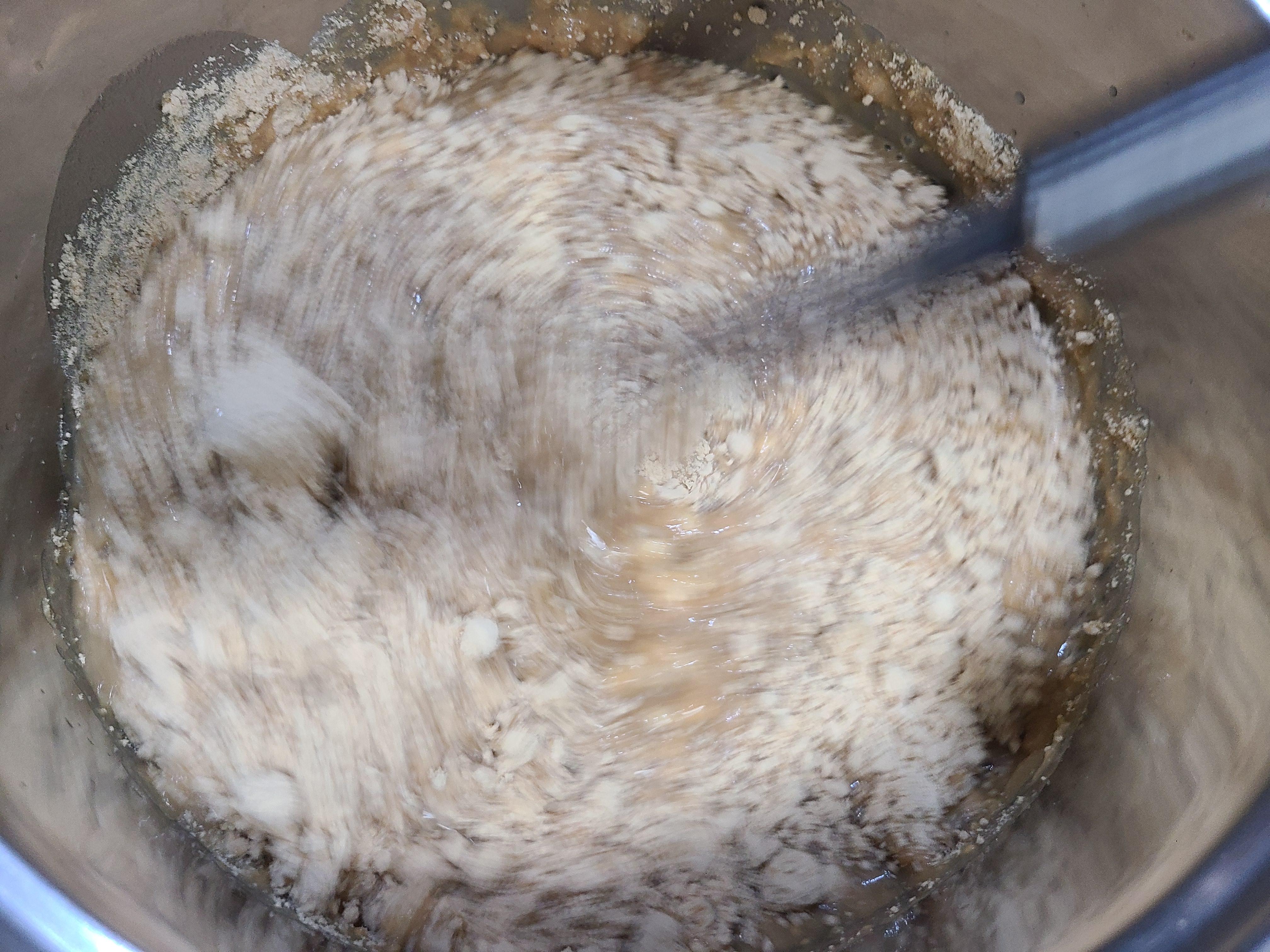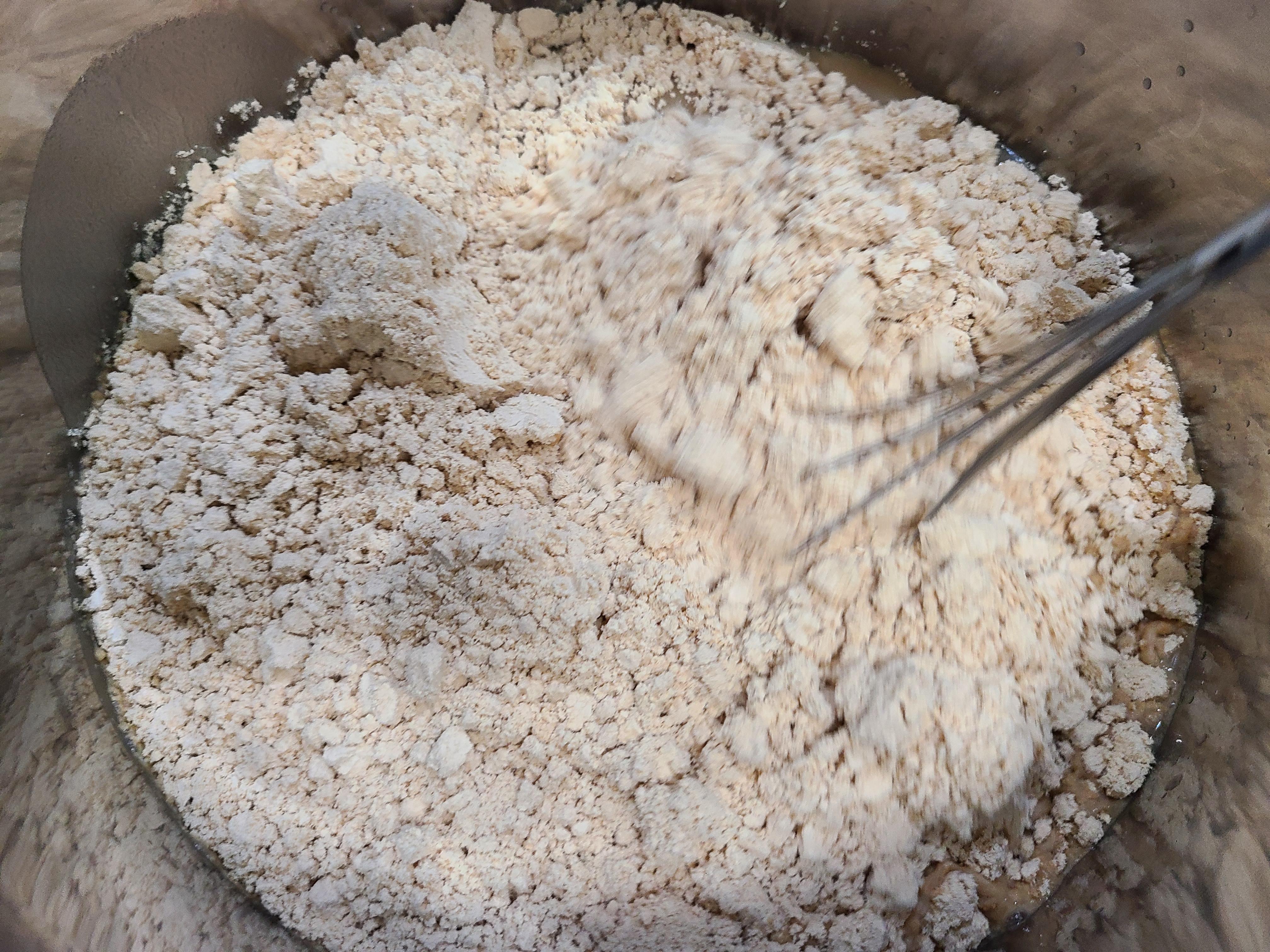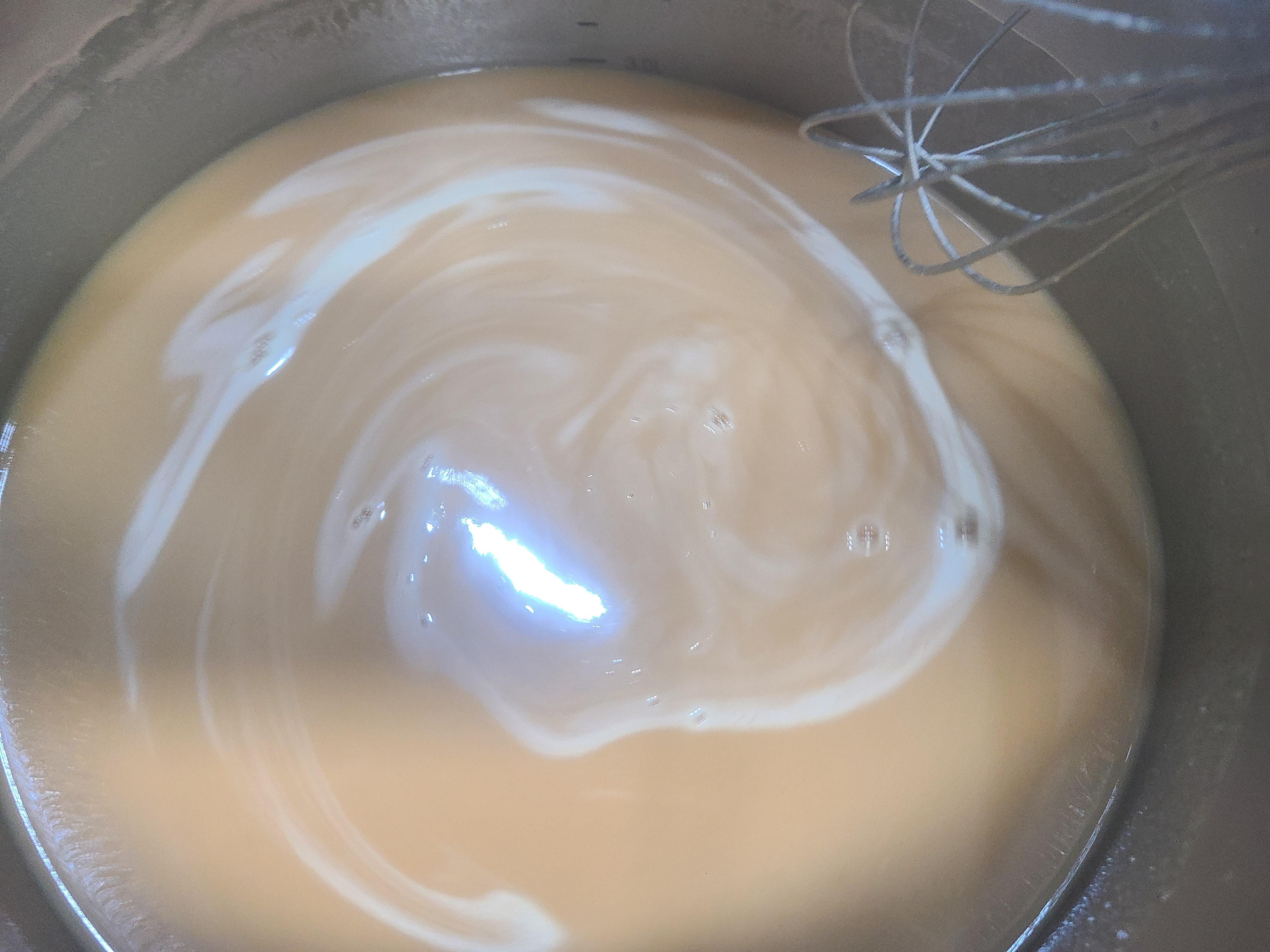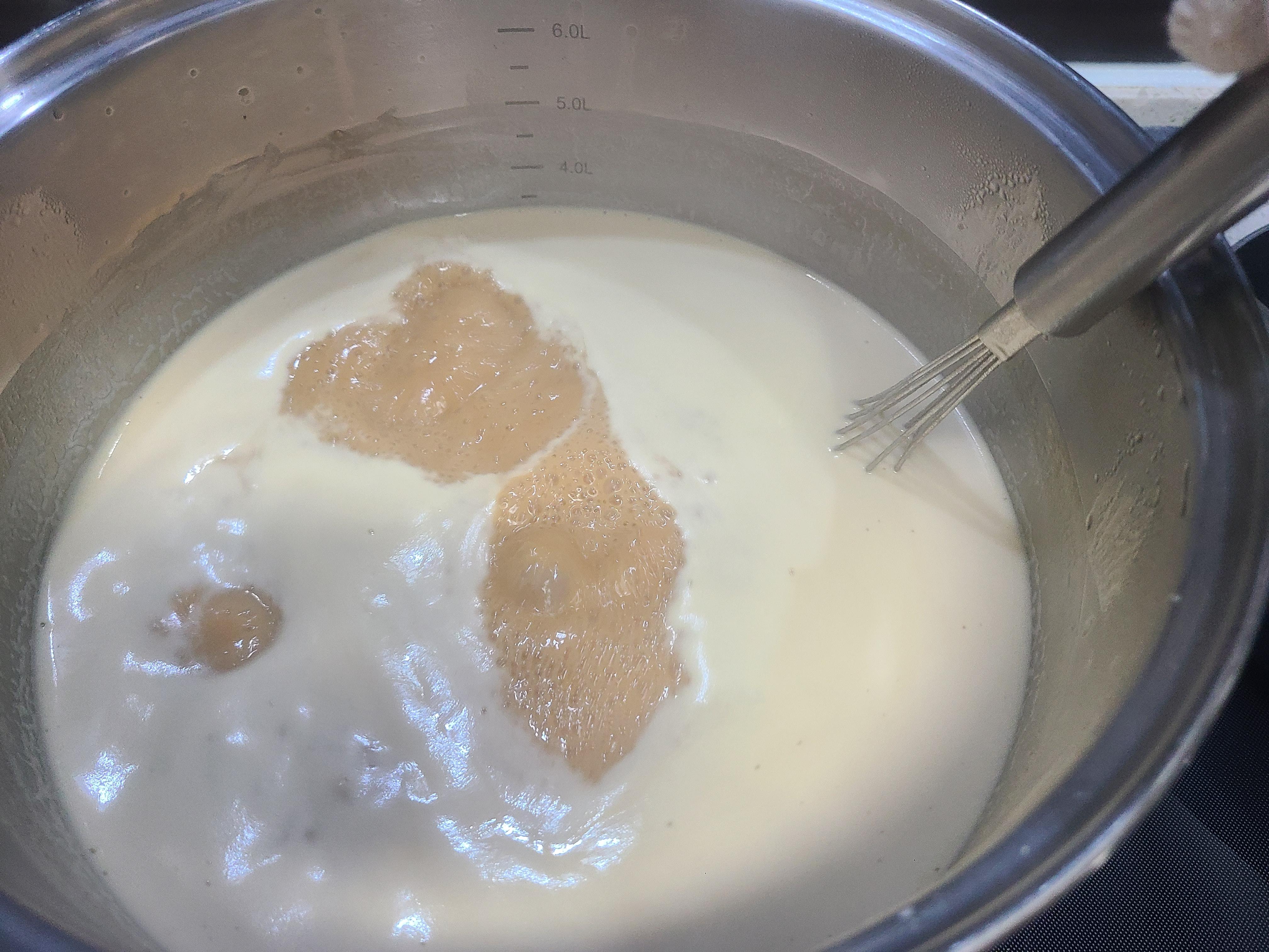 3. 찹쌀 달인 물에 메주가루 200g을 붓고 거품기로 서로 잘 섞이게 풀어준다. 메주가루 덩어리가 남지 않게 오래 저어주어야 한다.