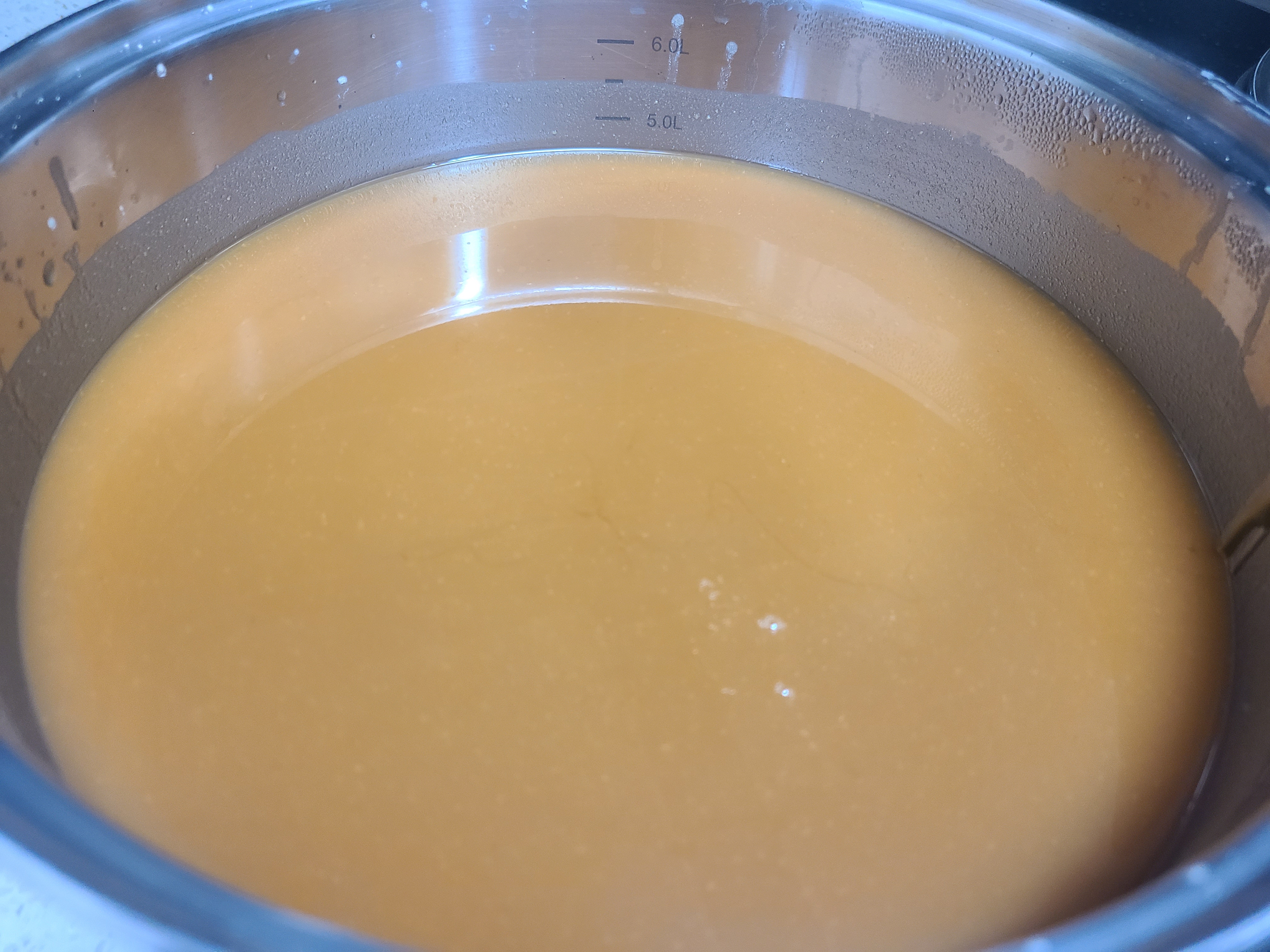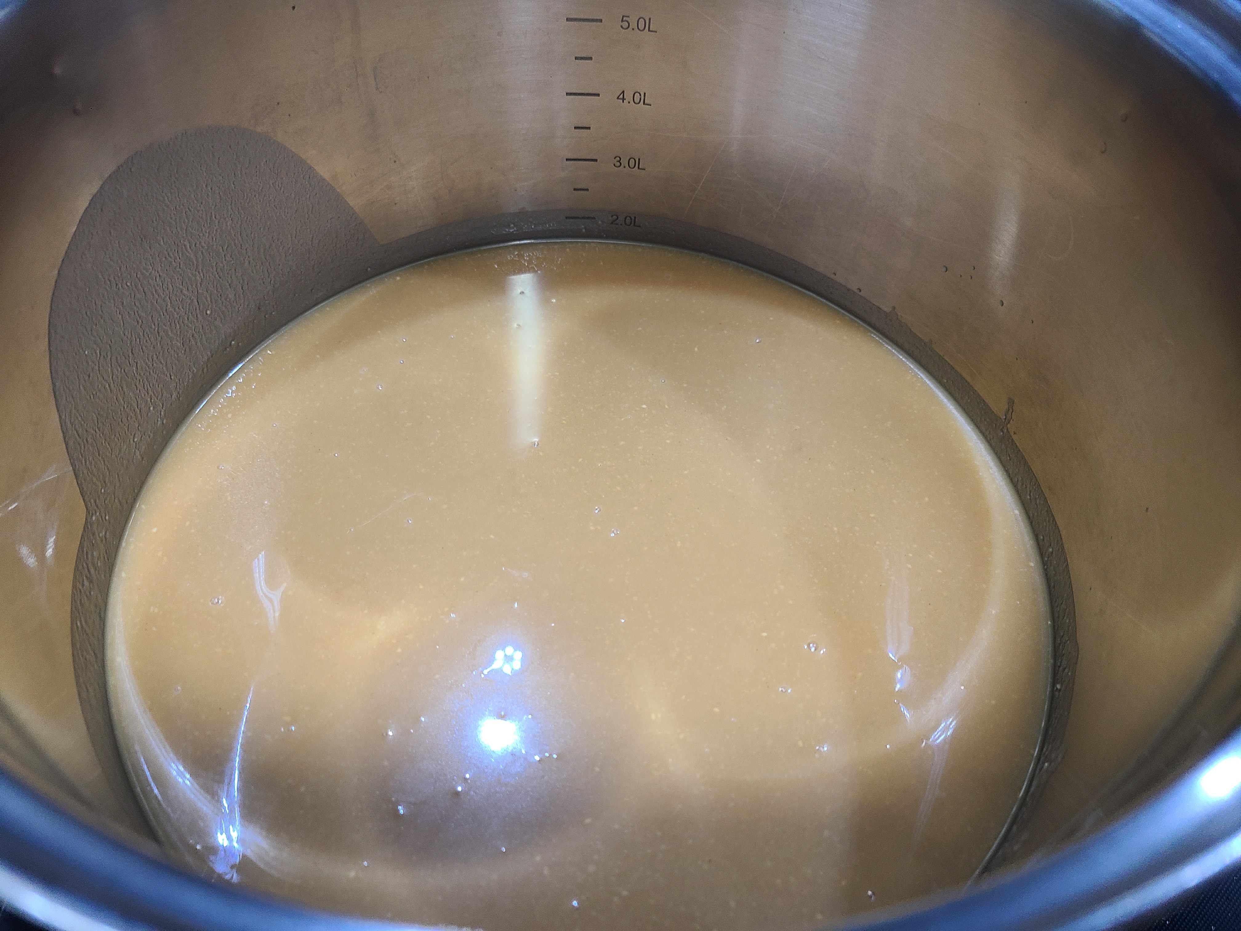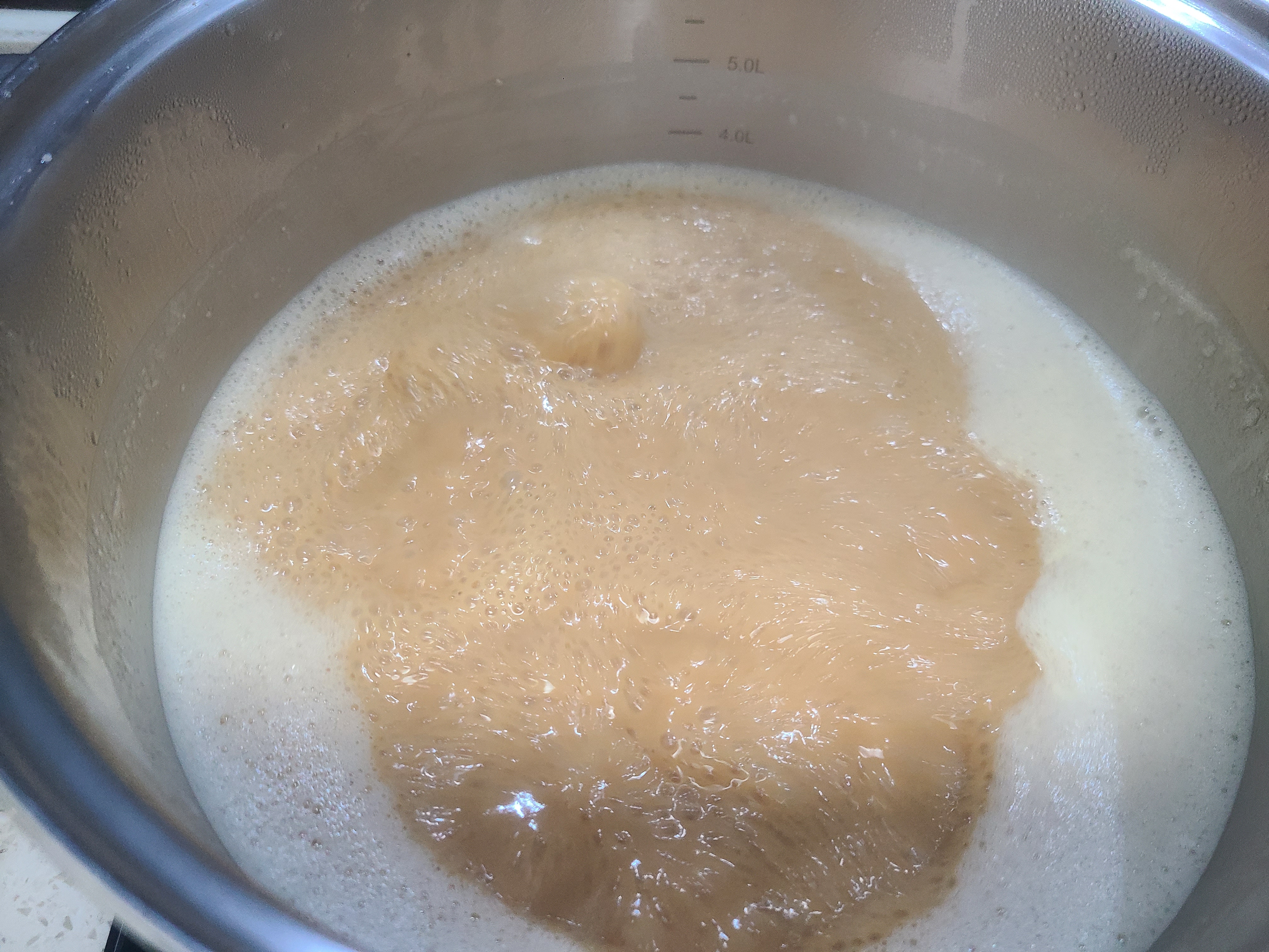 6. 찹쌀 달인 물이 따뜻해서 조청이 잘 녹아 골고루 혼합이 잘 된다. 이제 찹쌀 달인 물은 4리터가 넘는다.