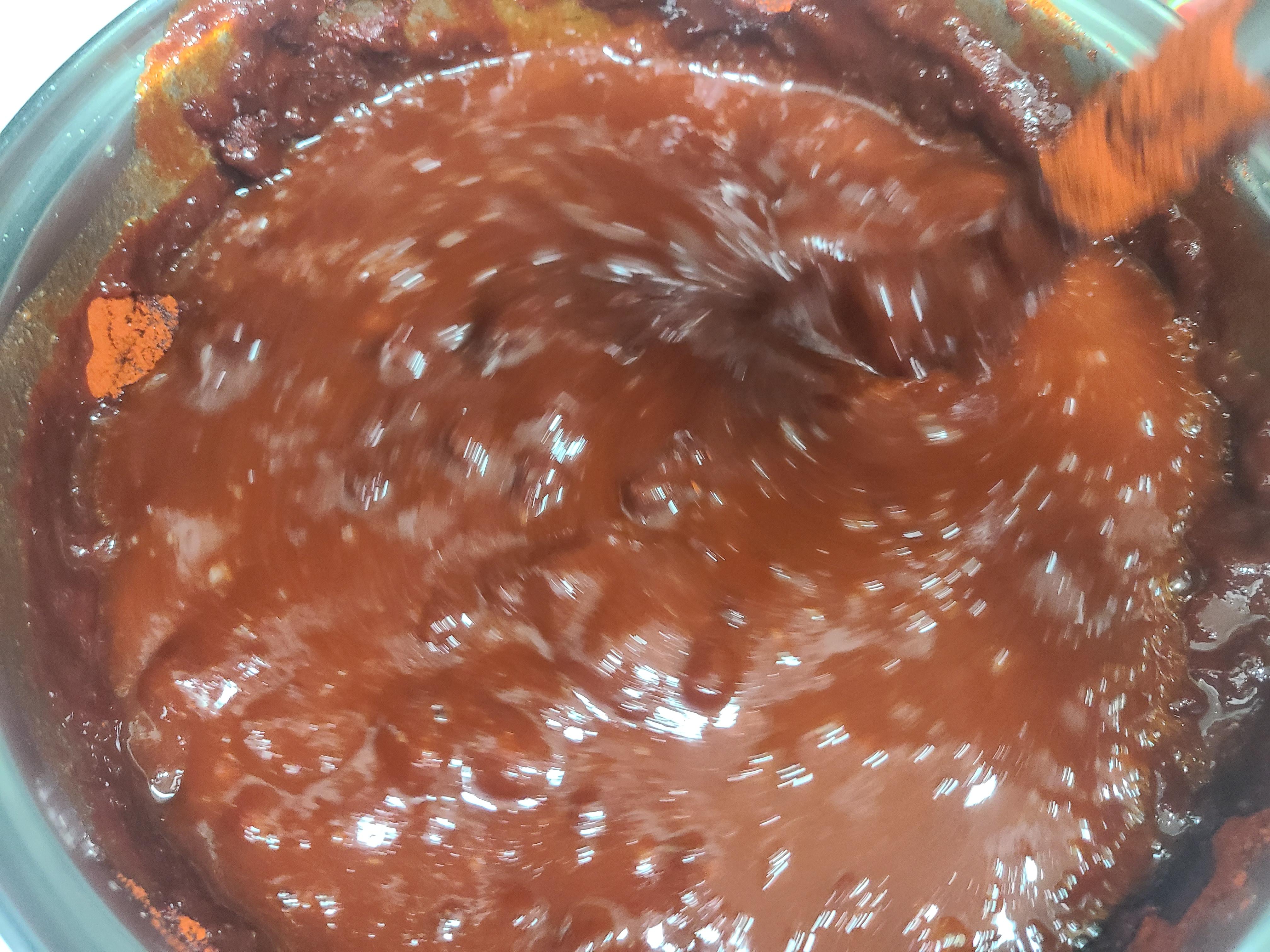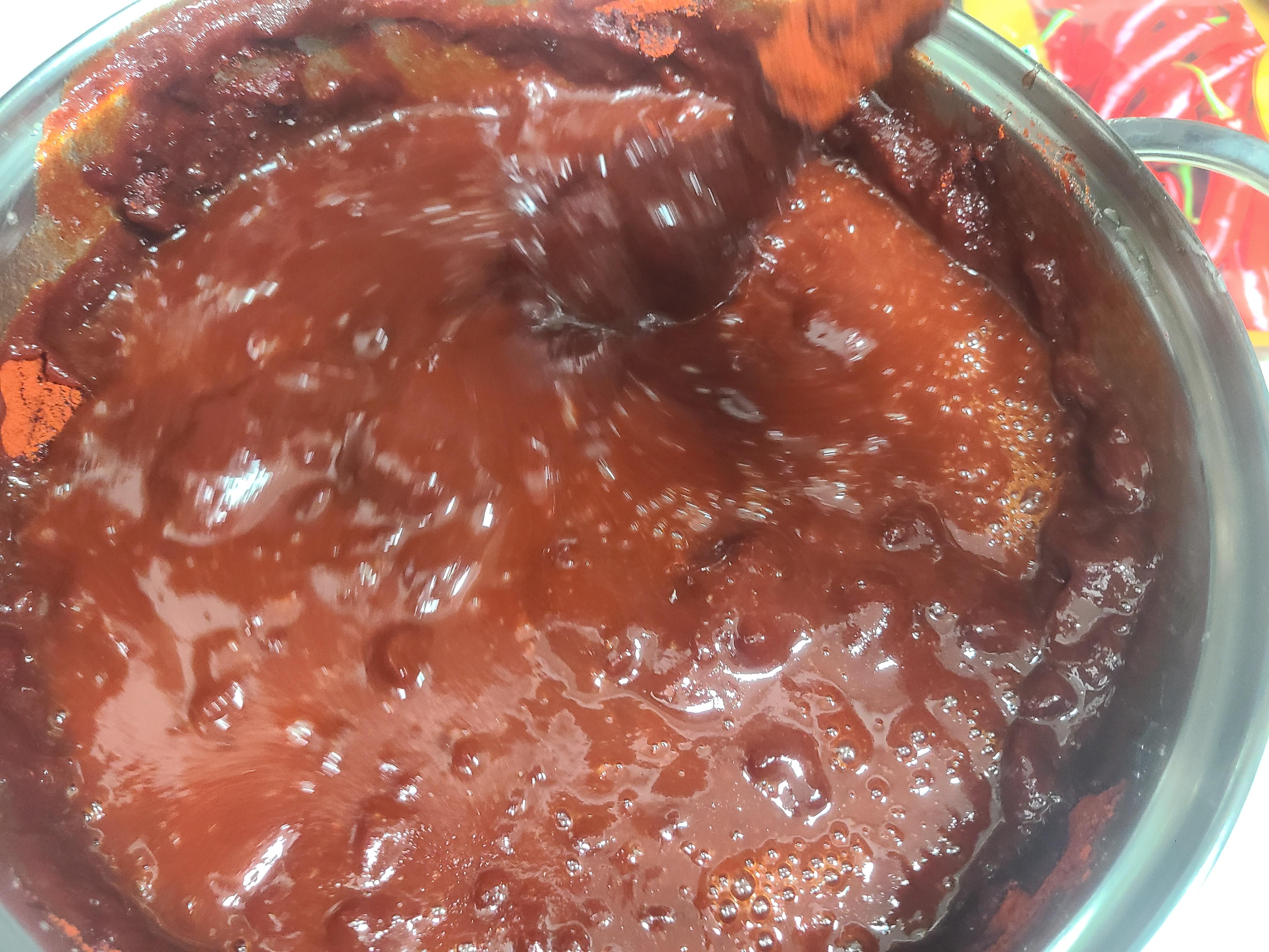 고춧가루가 곱게 풀리지 않아 시간이 예상보다 오래 걸리기는 했지만 시간이 지날수록 고추장의 모습이 나오기 시작한다.
