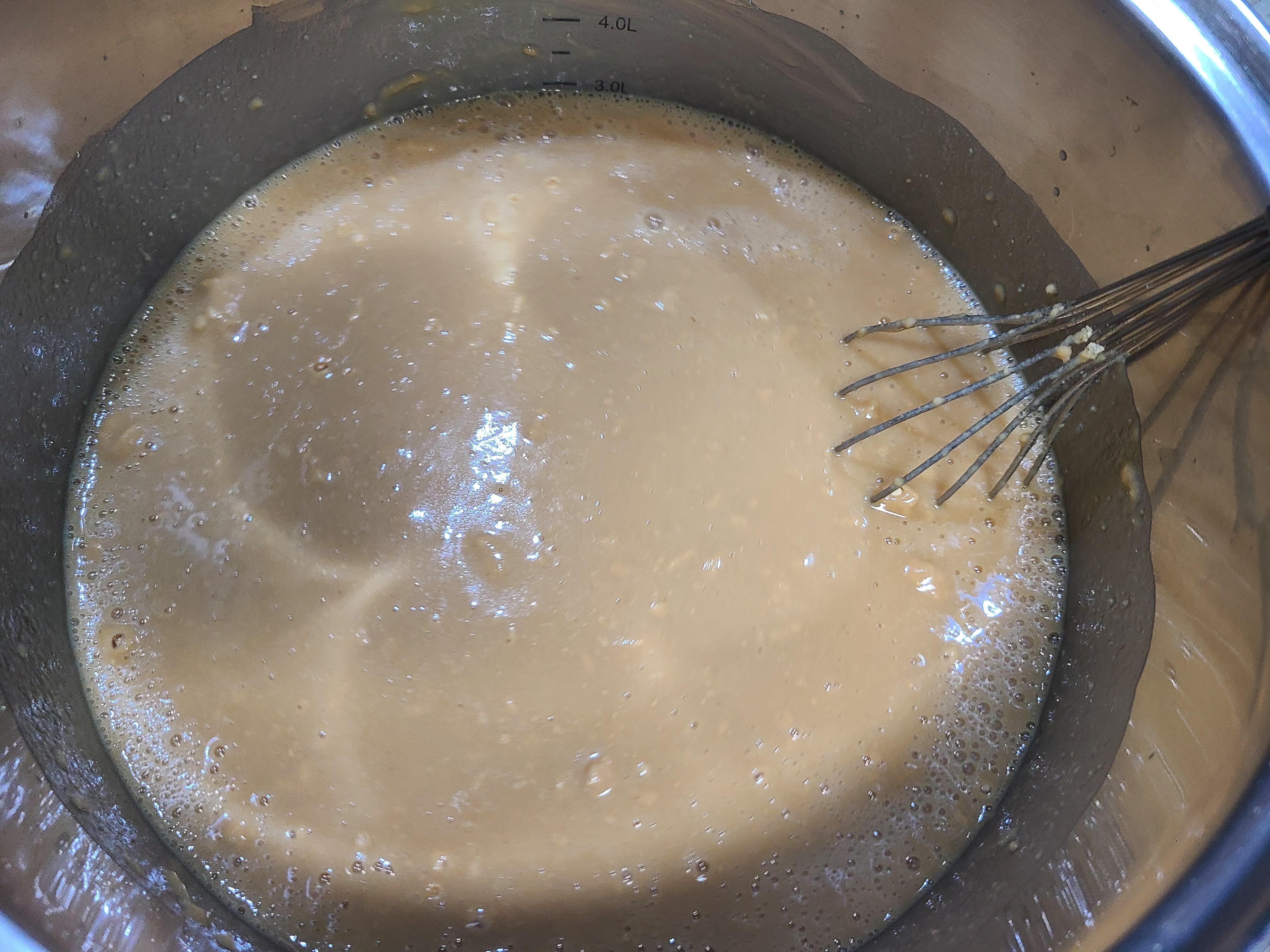 4. 찹쌀 달인 물에 생수와 메주가루를 넣어 거품기로 풀어주었더니 찹쌀 달인 물의 양이은 3리터 정도 되었다. 솥에 불을 켜고 끓여준다.