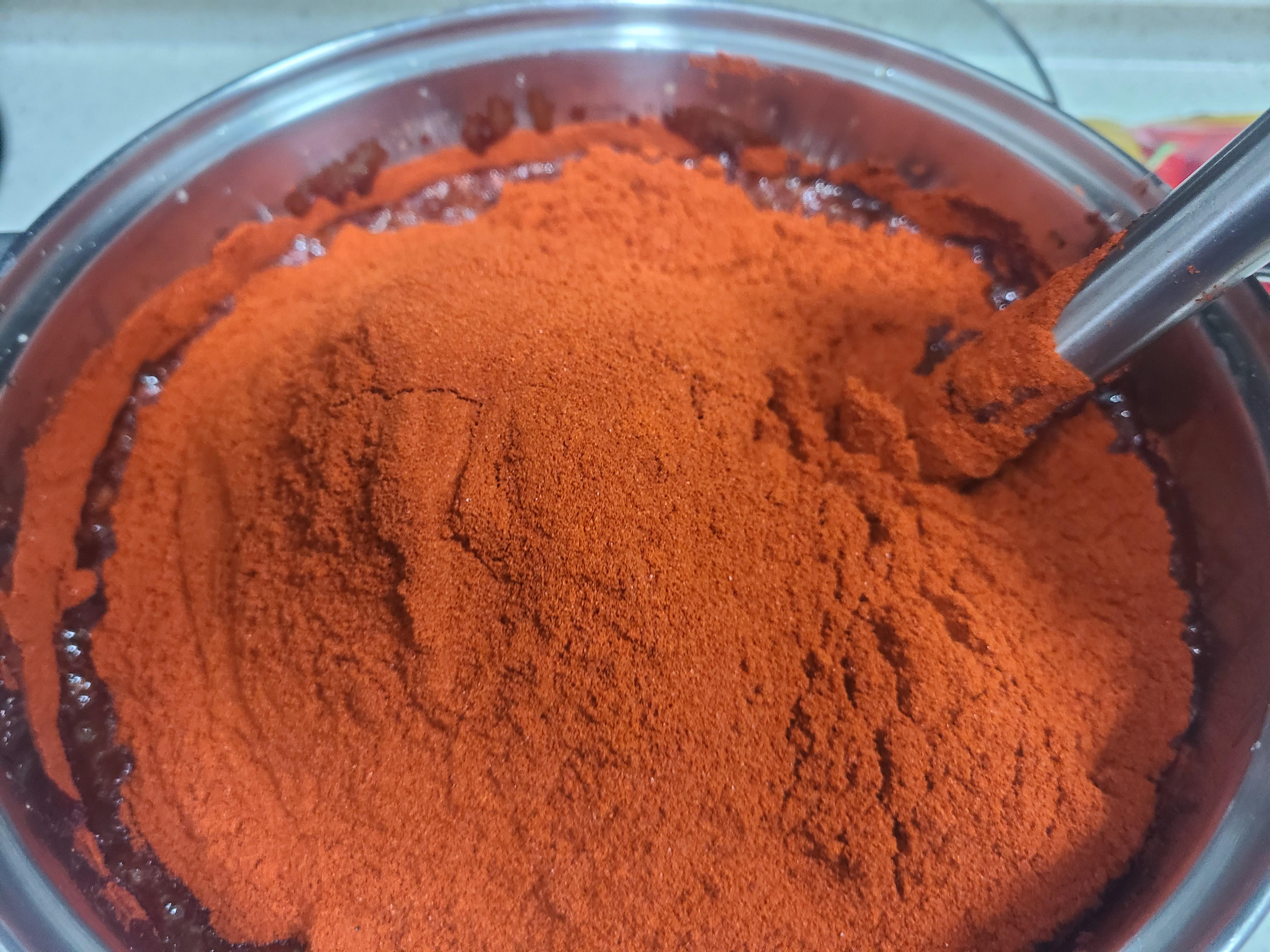 7. 마지막으로 고춧가루를 부어주면서 거품기로 골고루 섞어주면 되는데, 고춧가루를 한꺼번에 쏟아 넣었다.