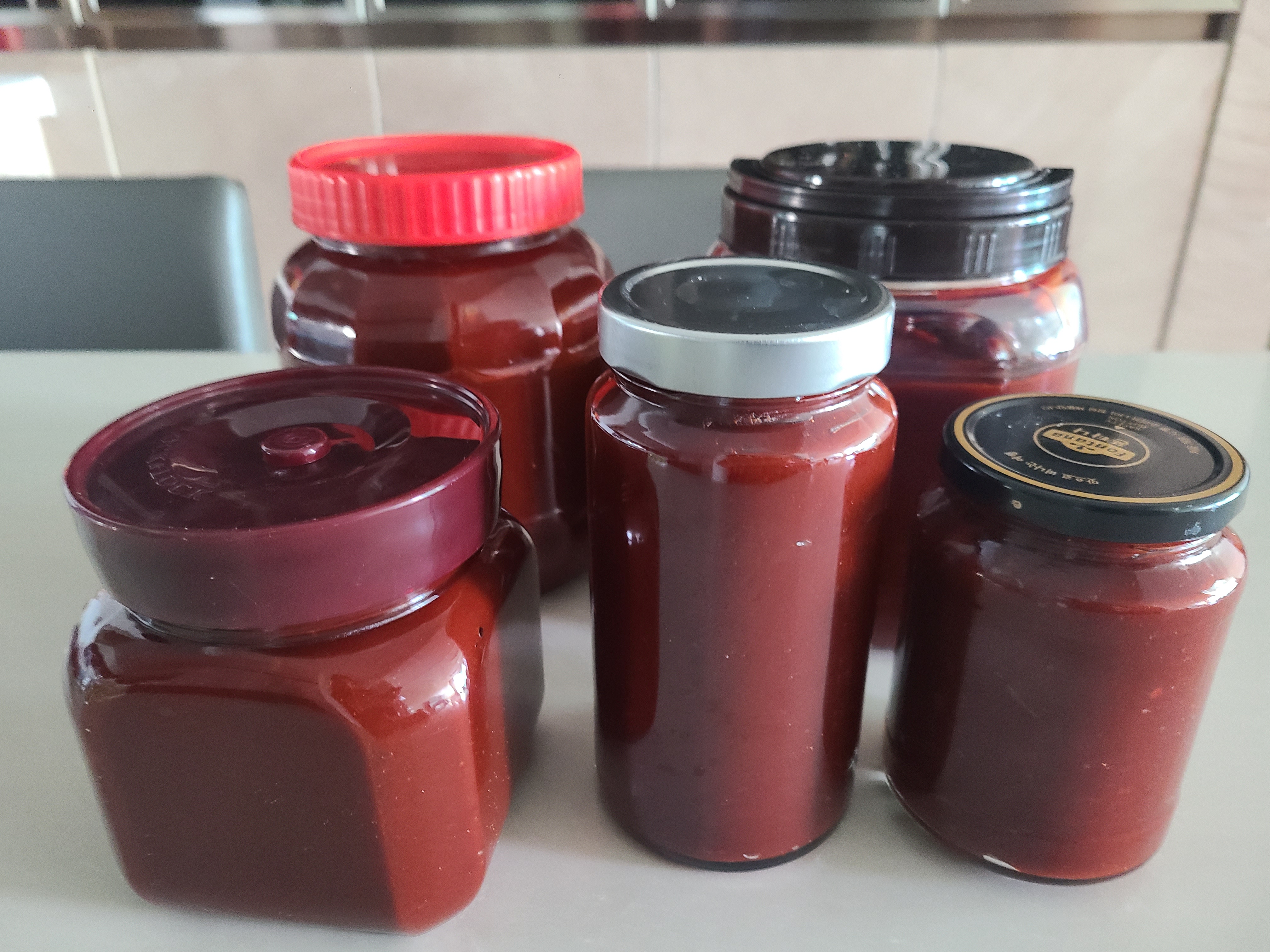 미리 열탕 소독을 해서 두었던 유리병에 고추장을 옮겨 담았다.