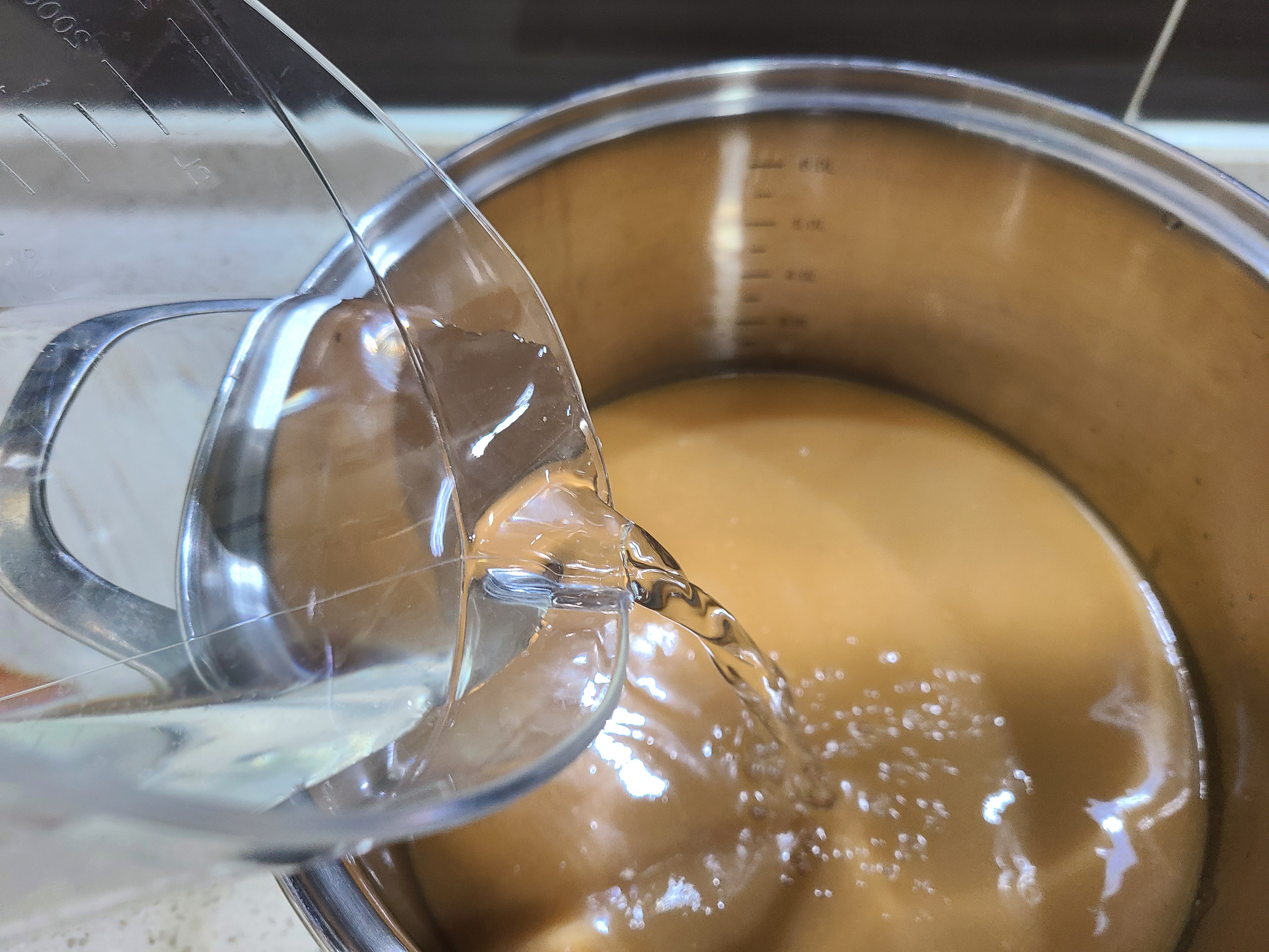 2. 찹쌀 달인 물 2kg에 생수 1리터를 넣는다.