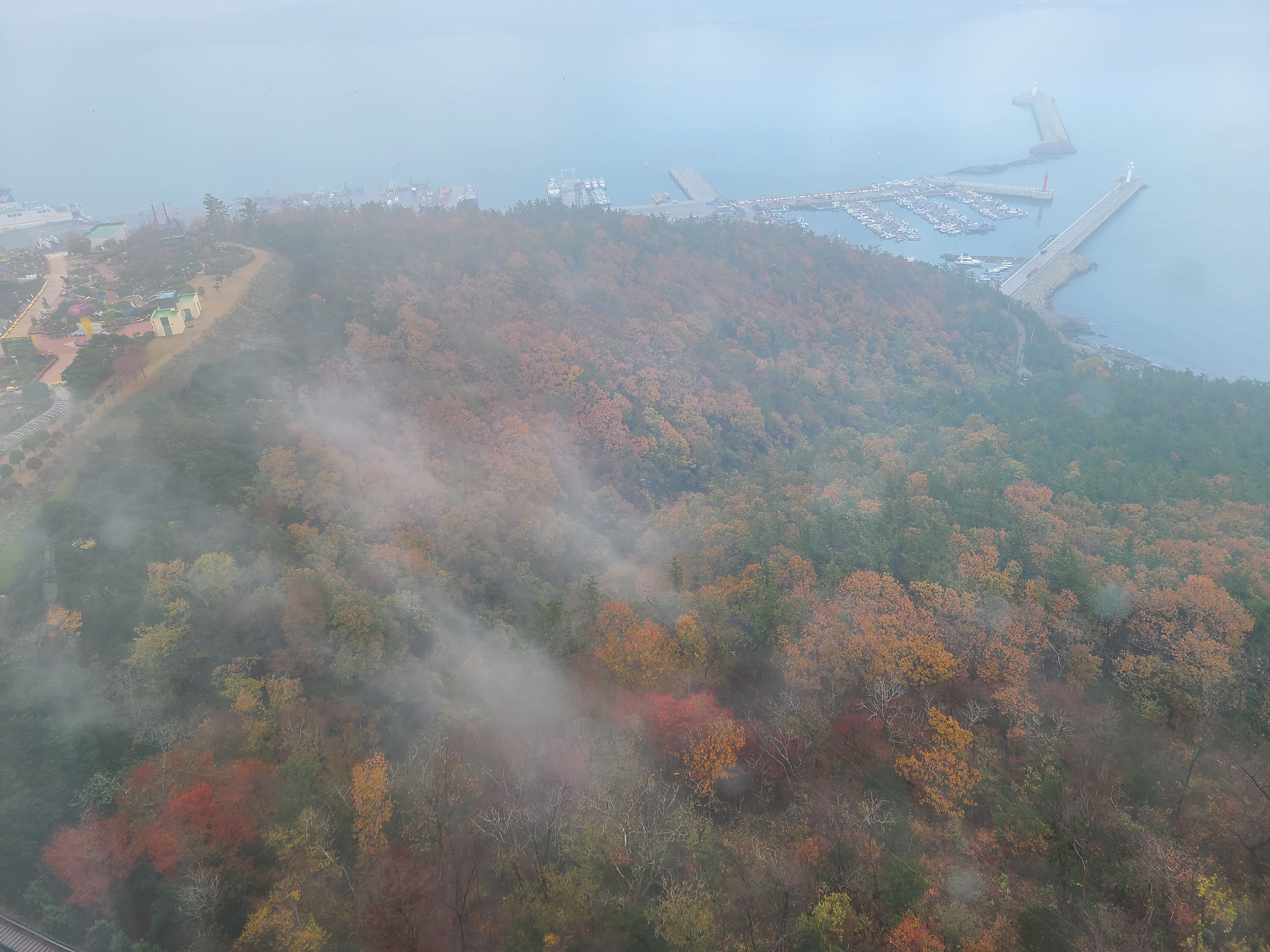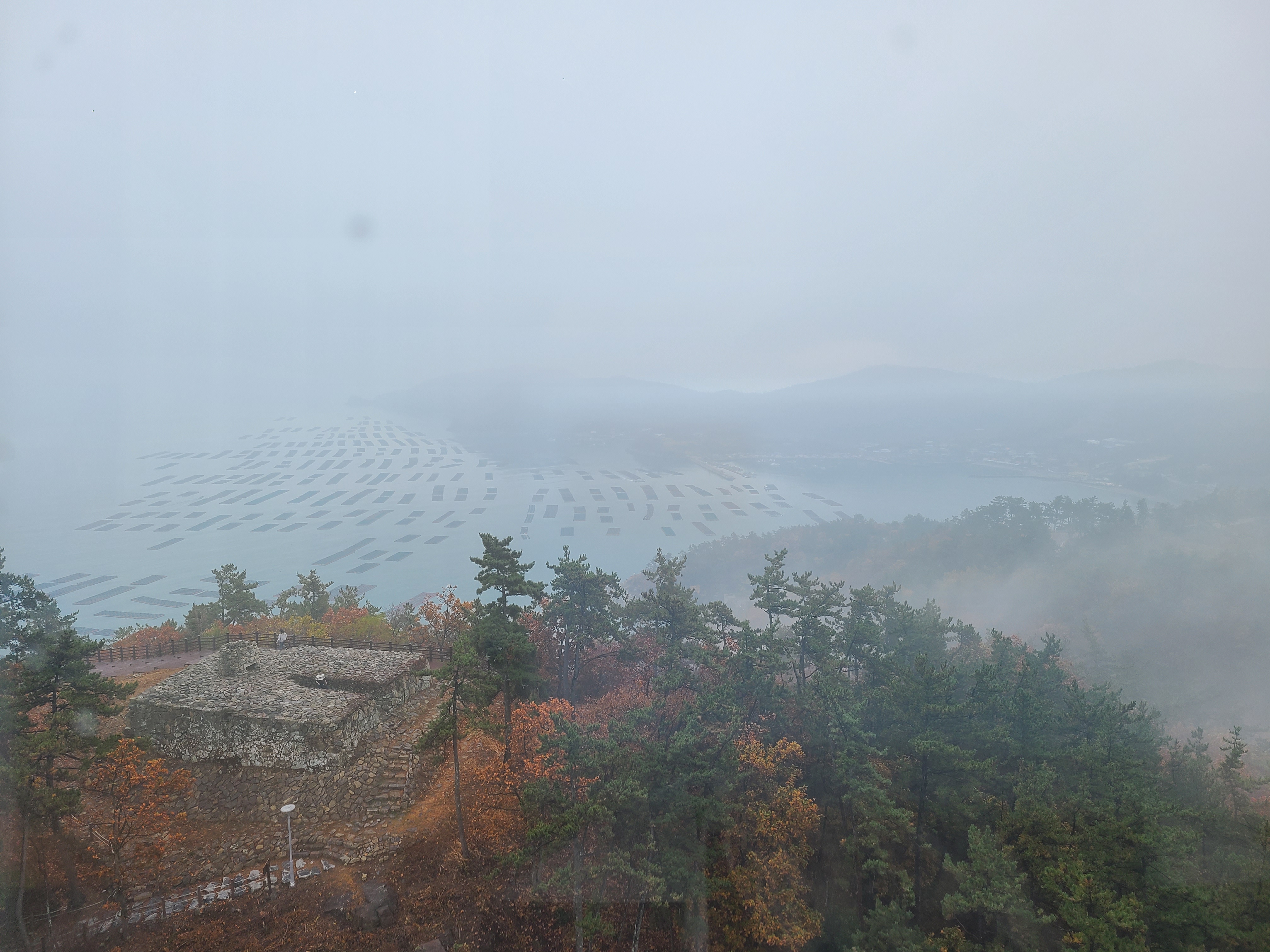 완도타워에 올라가 내려다보니 날씨가 흐려 선착장과 바다양식장이 흐리게 보였다.