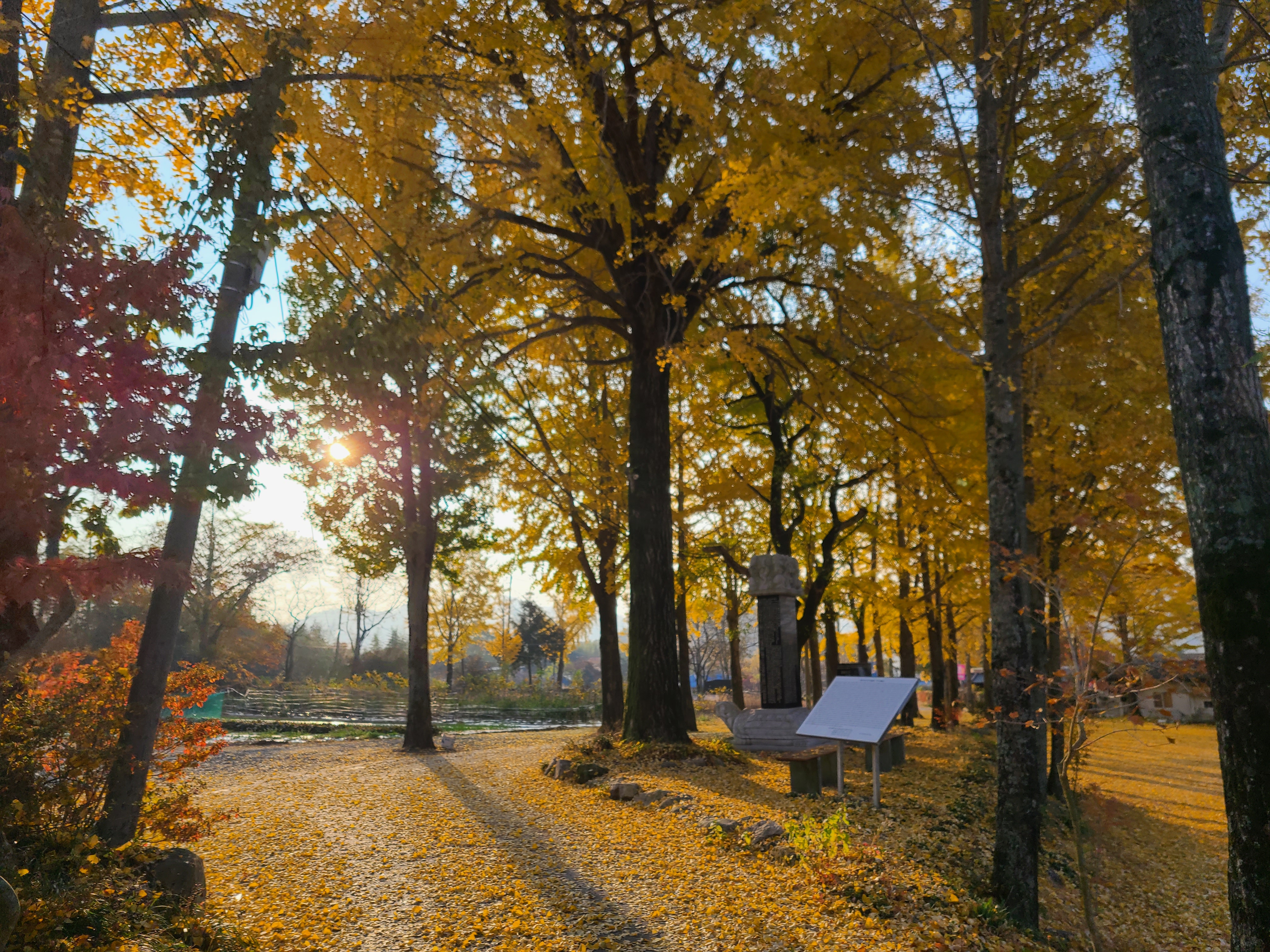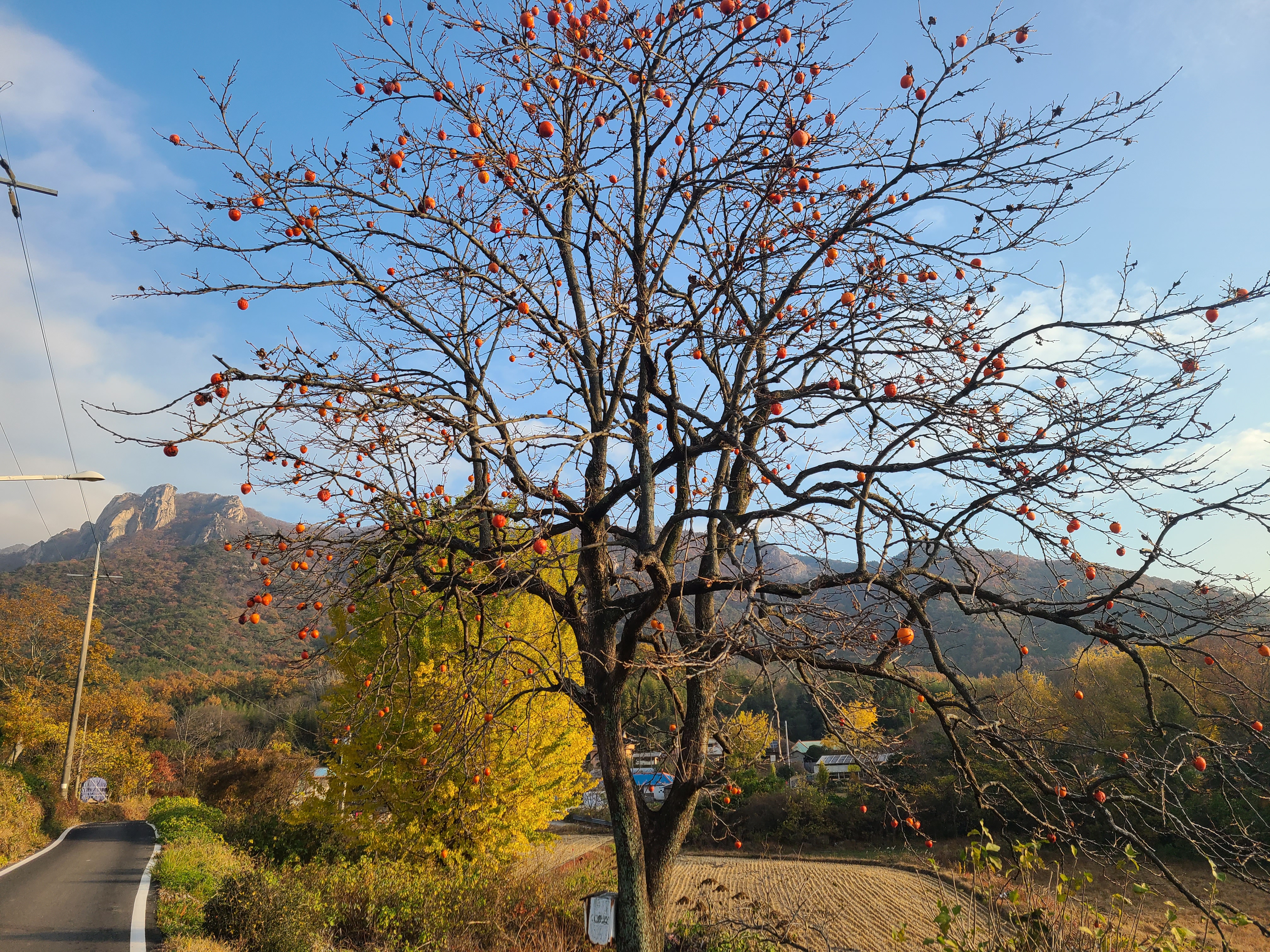 월출산 국립공원 경포대 입구에서 숙소로 돌아오는 길에 노랗게 물든 은행나무숲과 주렁주렁 매달린 감도 보았다.