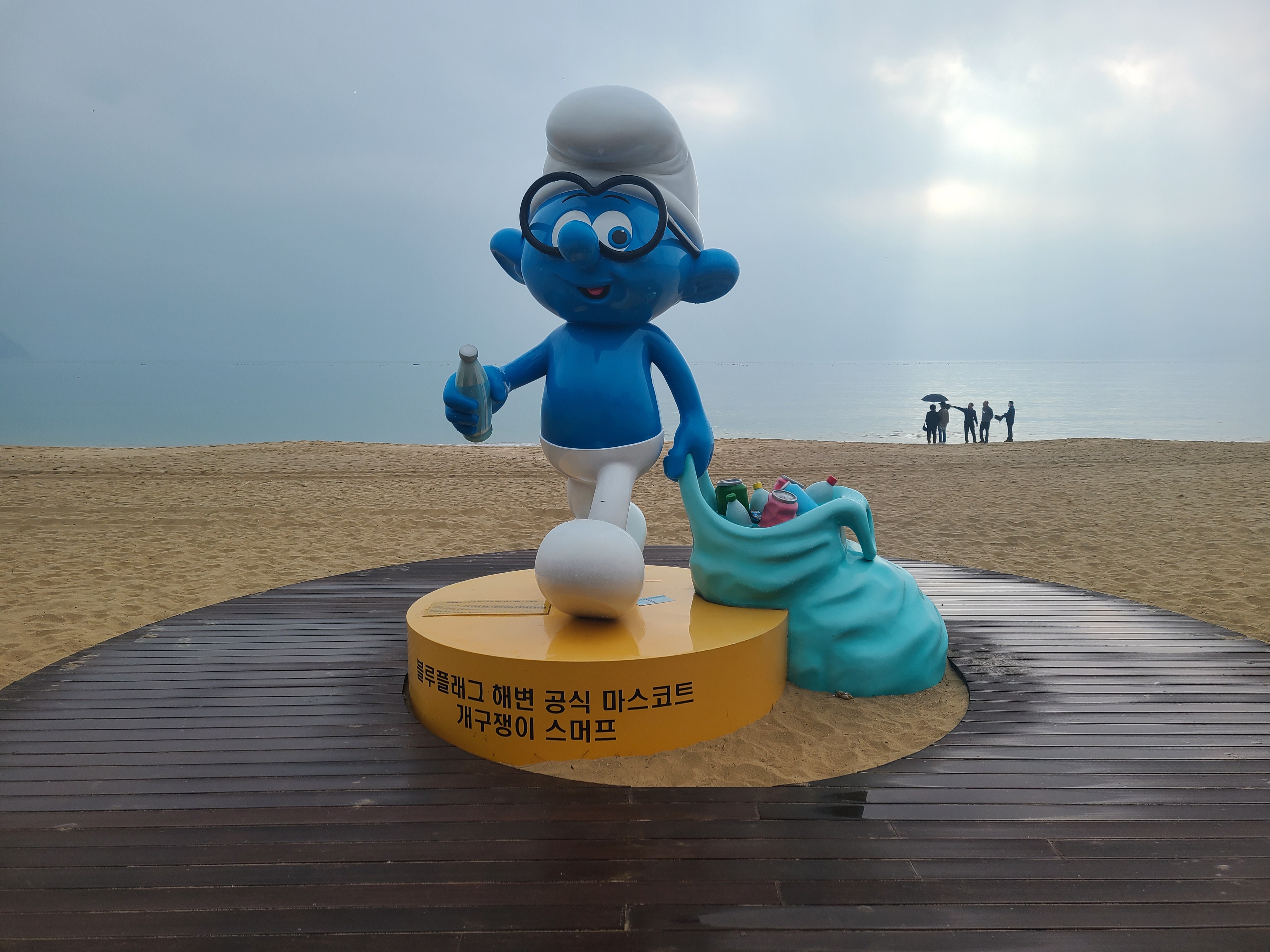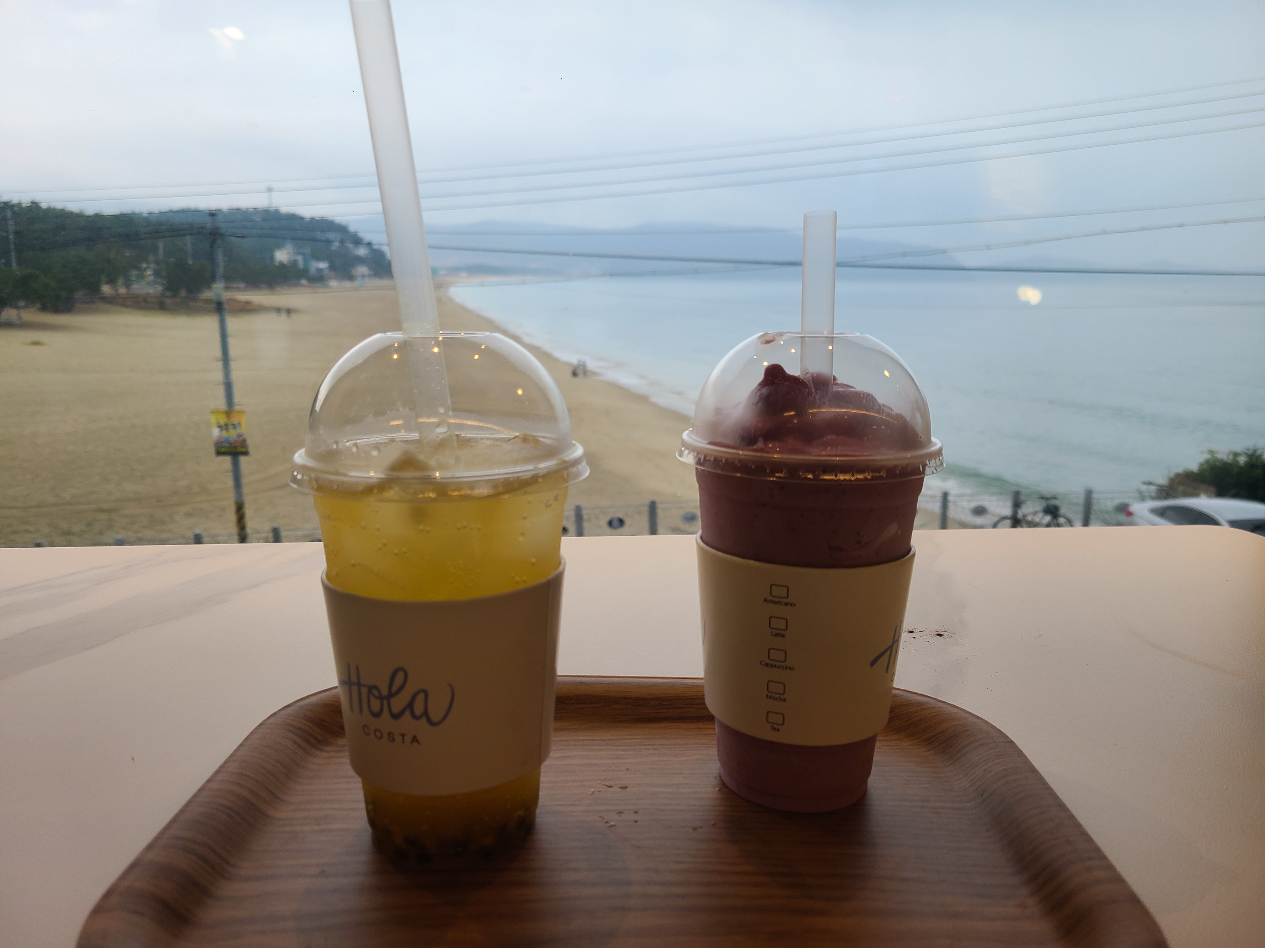 개구쟁이 스머프와 해변을 배경으로 인증숏을 찍은 후 해수욕장이 내려다 보이는 카페로 이동해서 차를 마셨다.