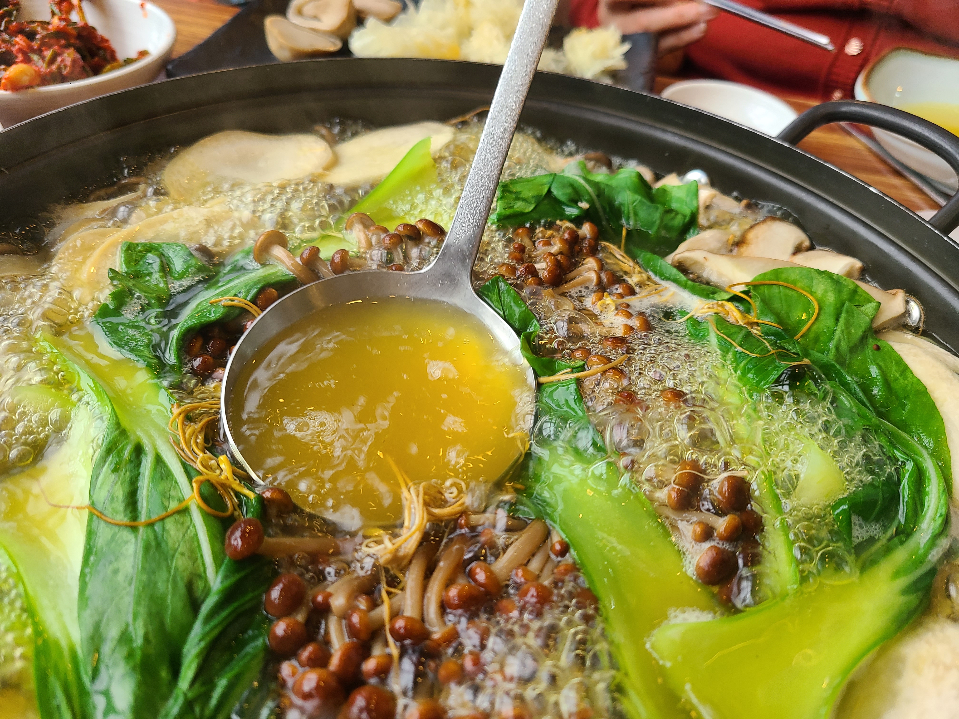 버섯전골 국물을 먹어보니, 담백하면서도 시원한데 너무 맛이 있다.
