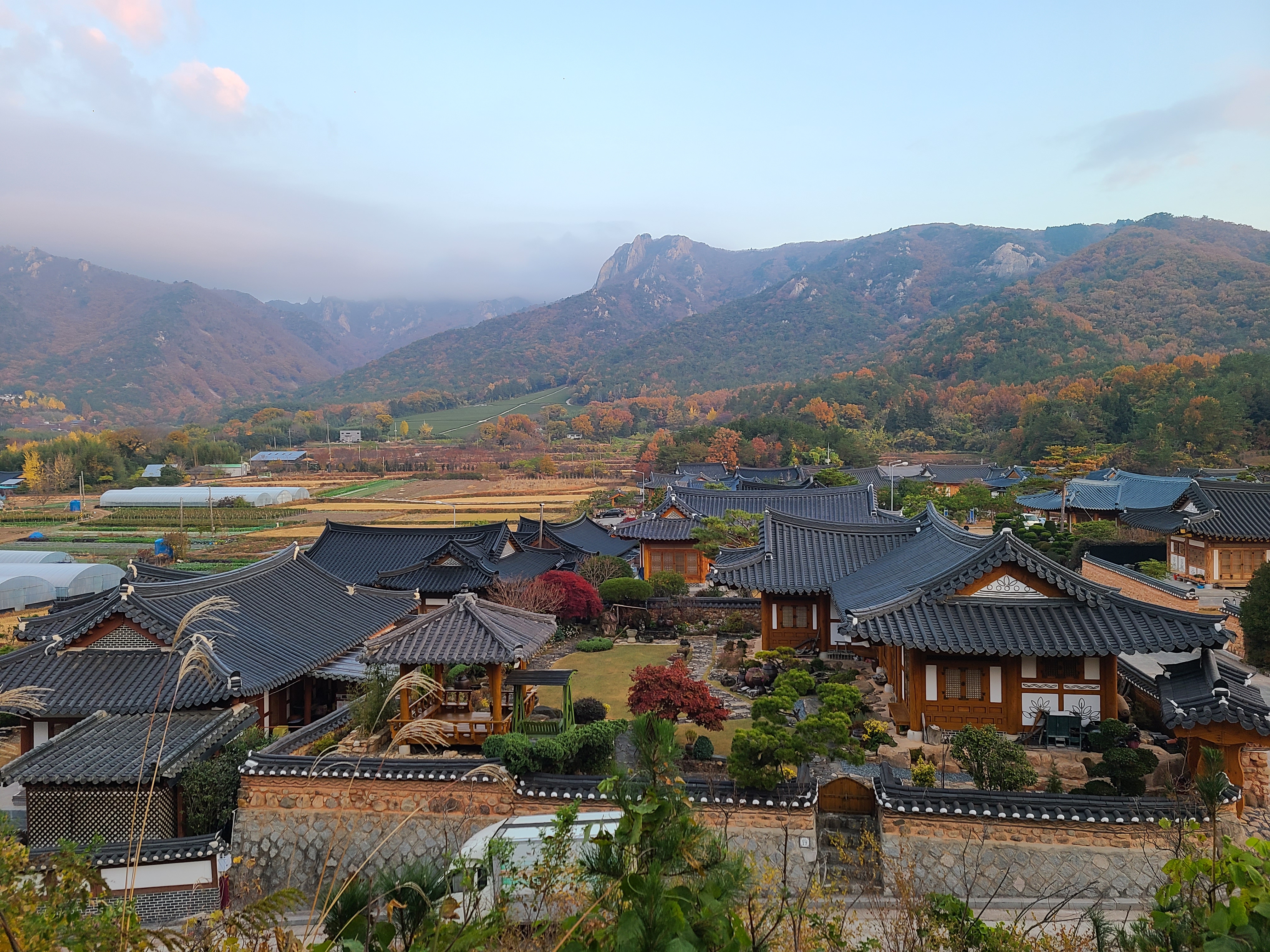 마을에 있는 전망대에 올라가서 바라보면, 강진 달빛 한옥마을과 월출산, 월출산 아래 녹차밭이 한눈에 보인다. 11월 중순이지만 아직 가을이 한창이다.