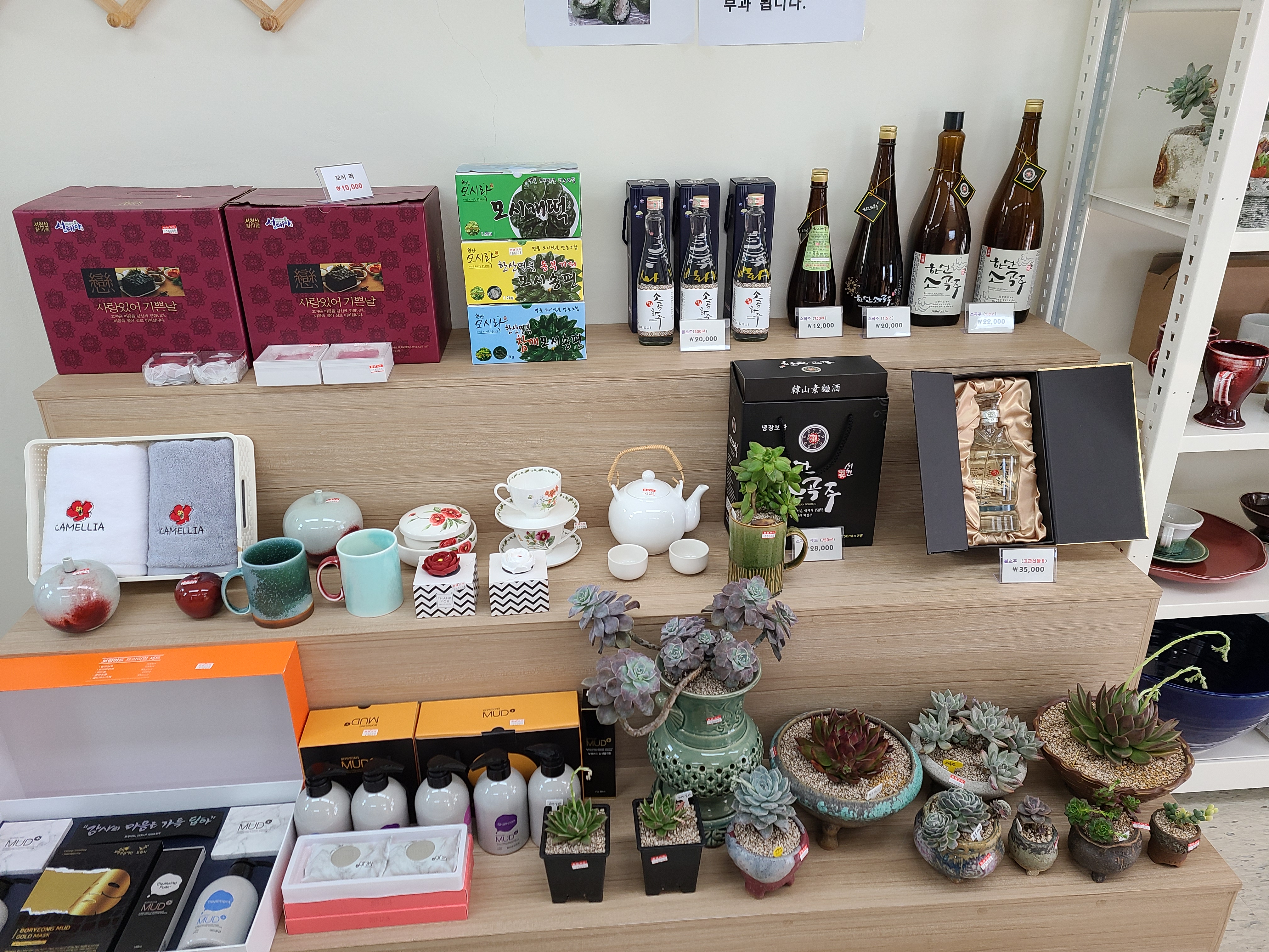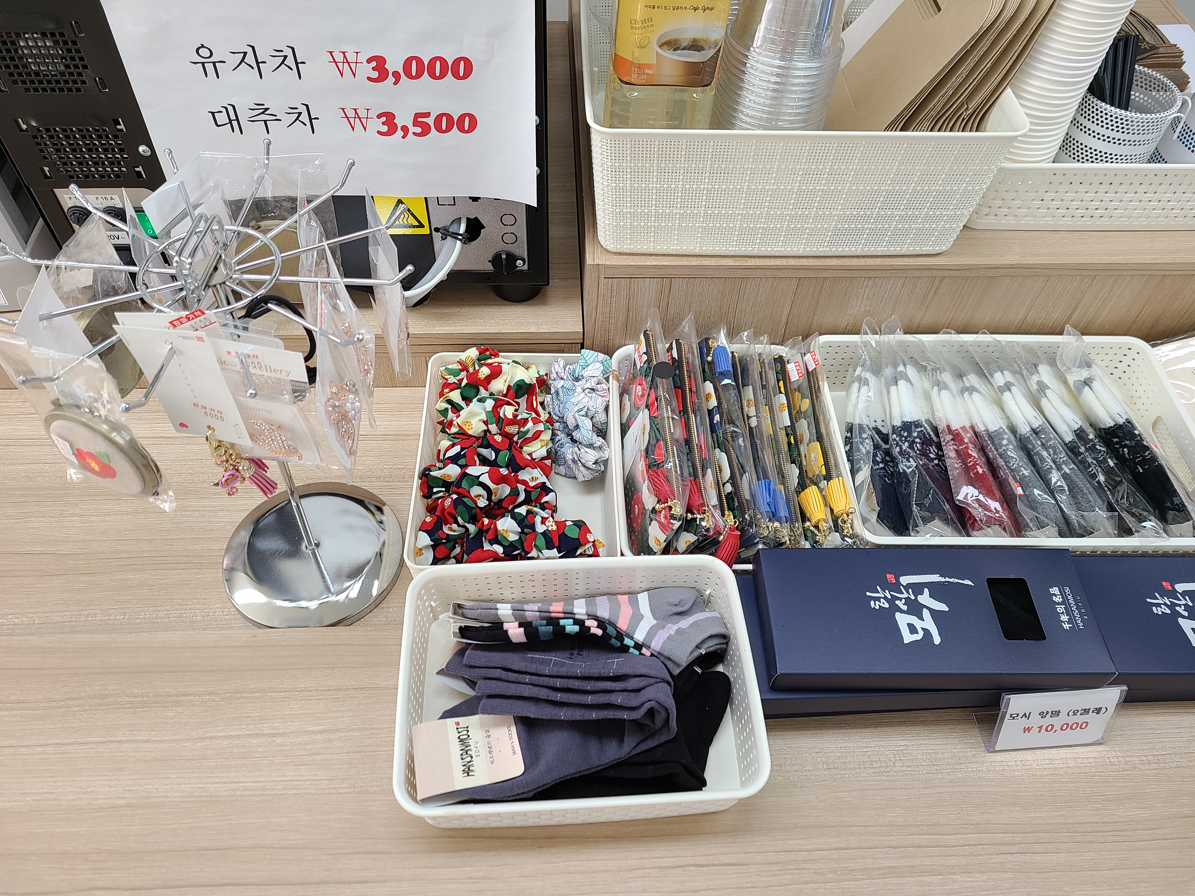 입구에 있는 기념품 판매점에 들렸는데 동백꽃 모양의 소품들과 한산 모시송편과 소곡주가 있다. 우리는 추위를 녹이기 위해 대추차를 마셨는데 직접 만들어서인지 맛이 진하고 좋았다.