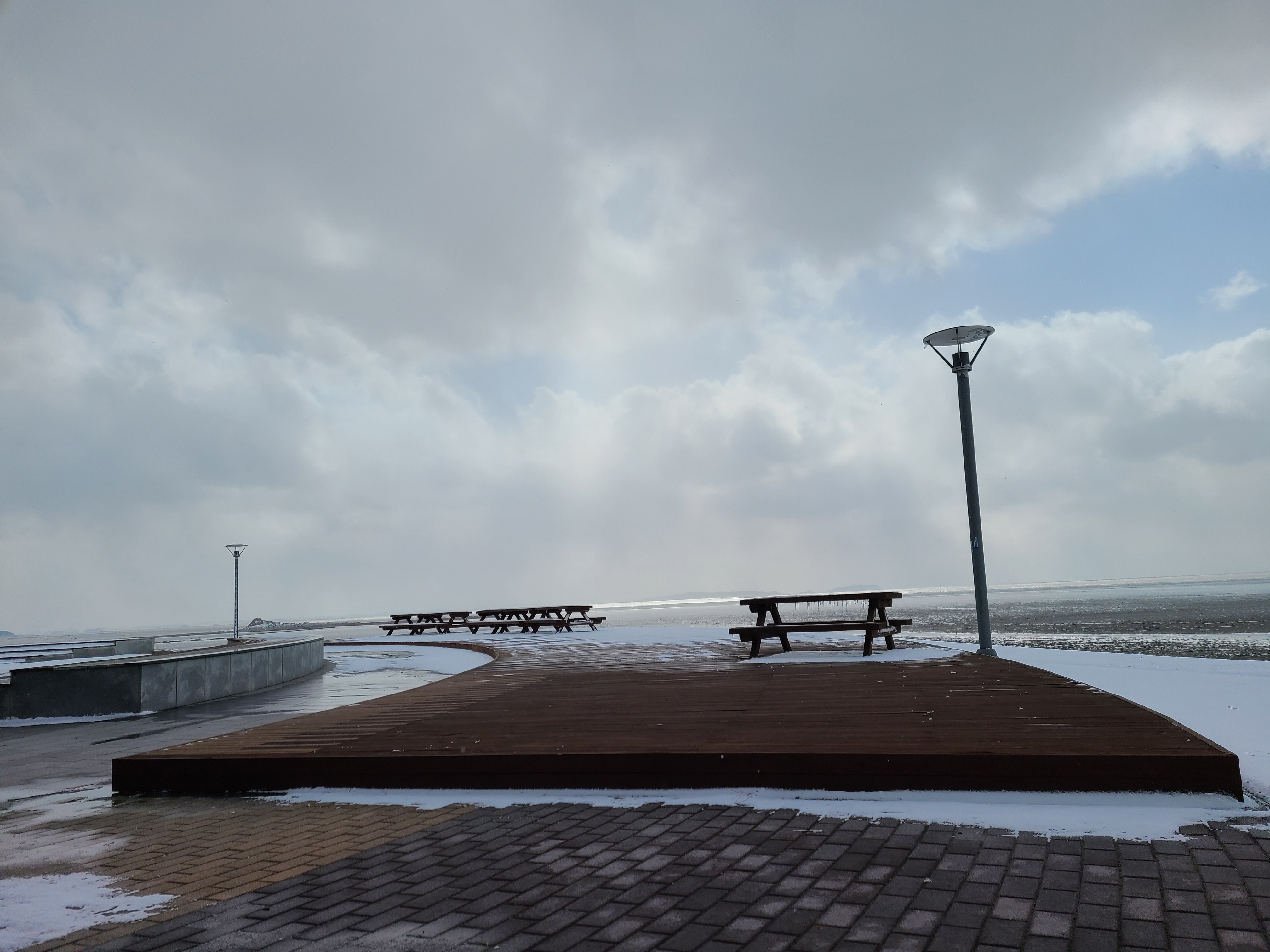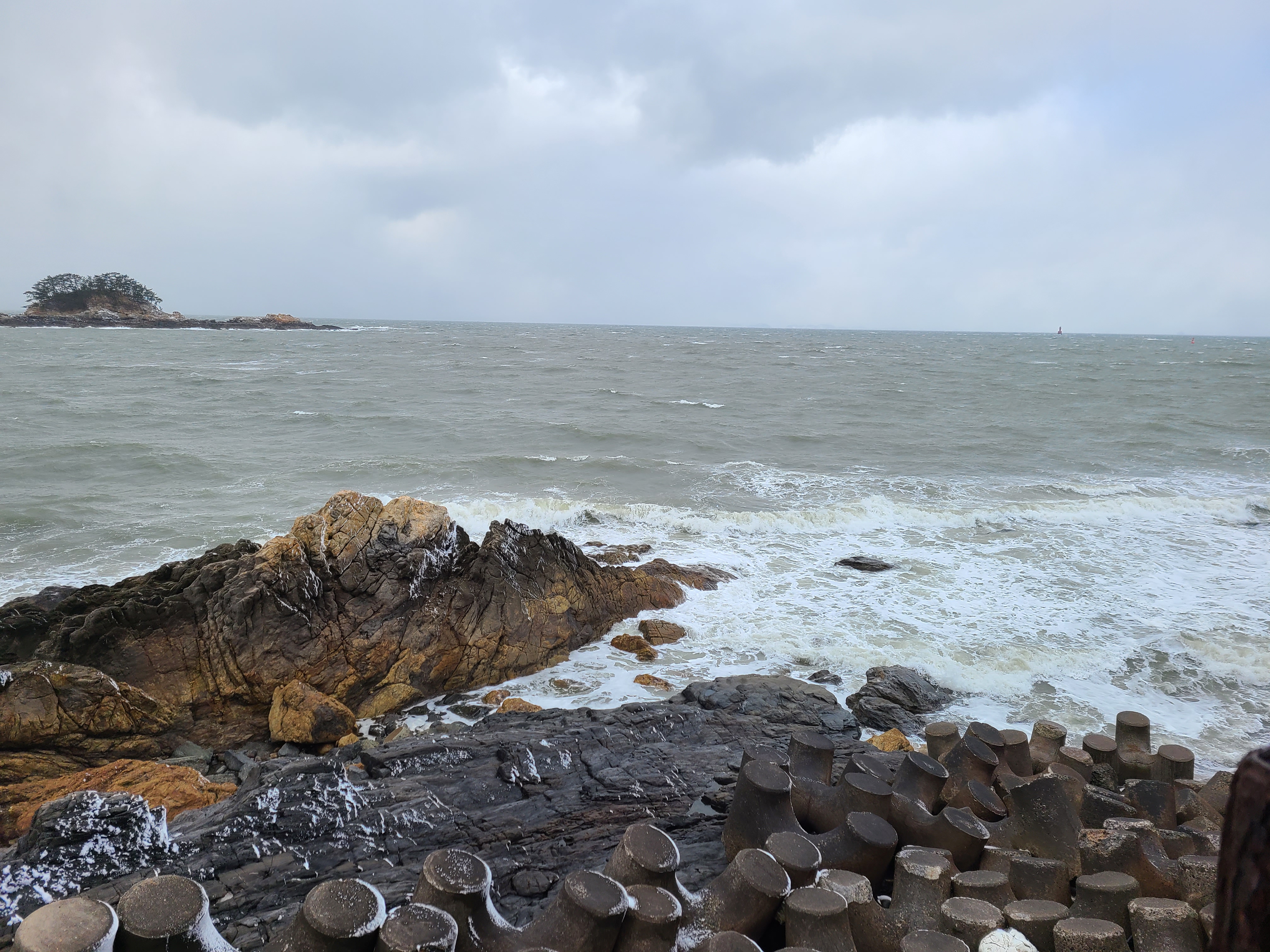 칼국수를 먹고 가게 앞으로 나오니 비인 해변 미니공원에서 보는 바다가 너무 멋지다. 날씨만 안 추웠으면 바닷가를 걷고 싶었지만 바람이 너무 불어 춥고 마량리 동백숲을 가기 위해 우리는 길을 떠났다.