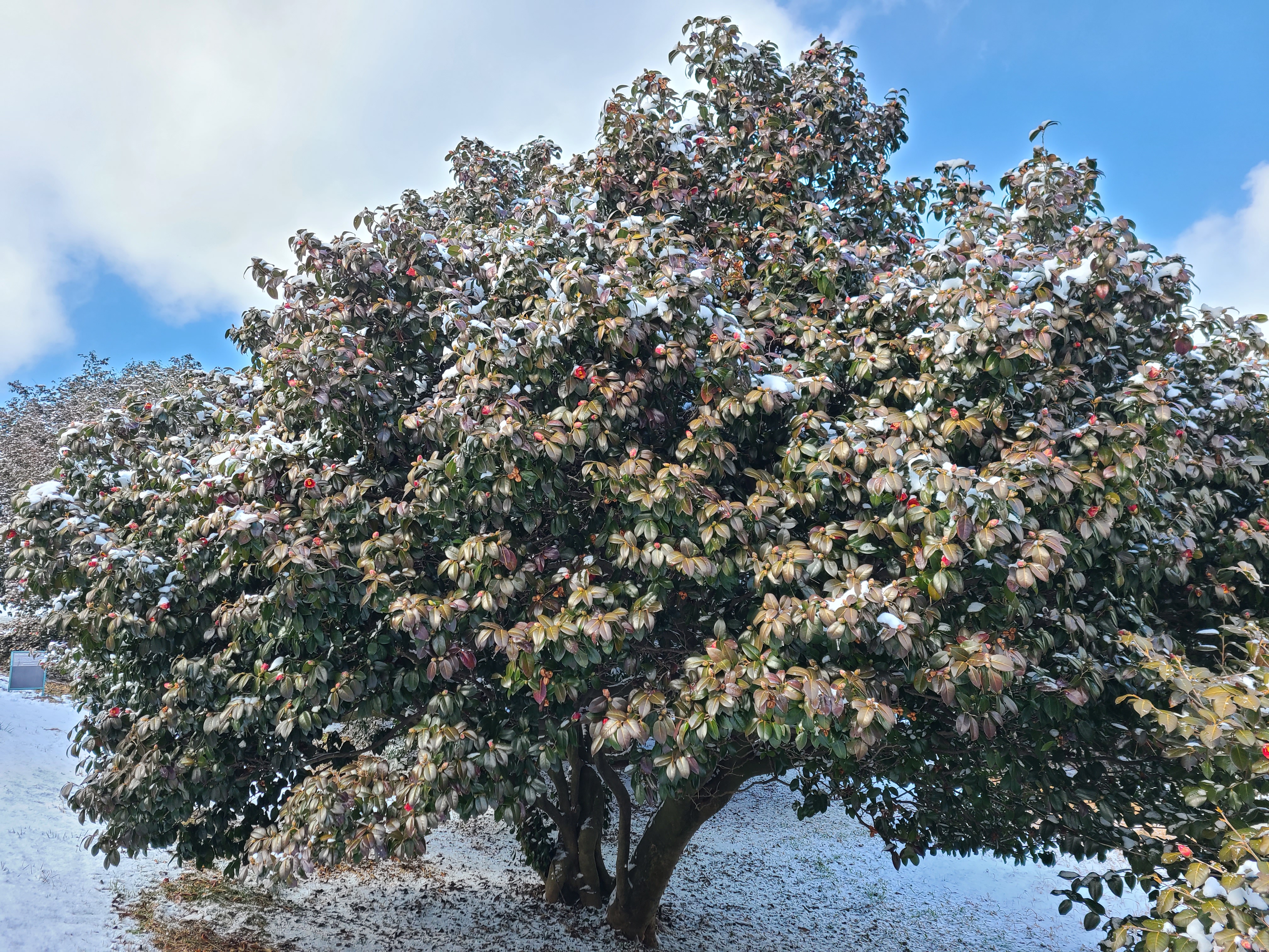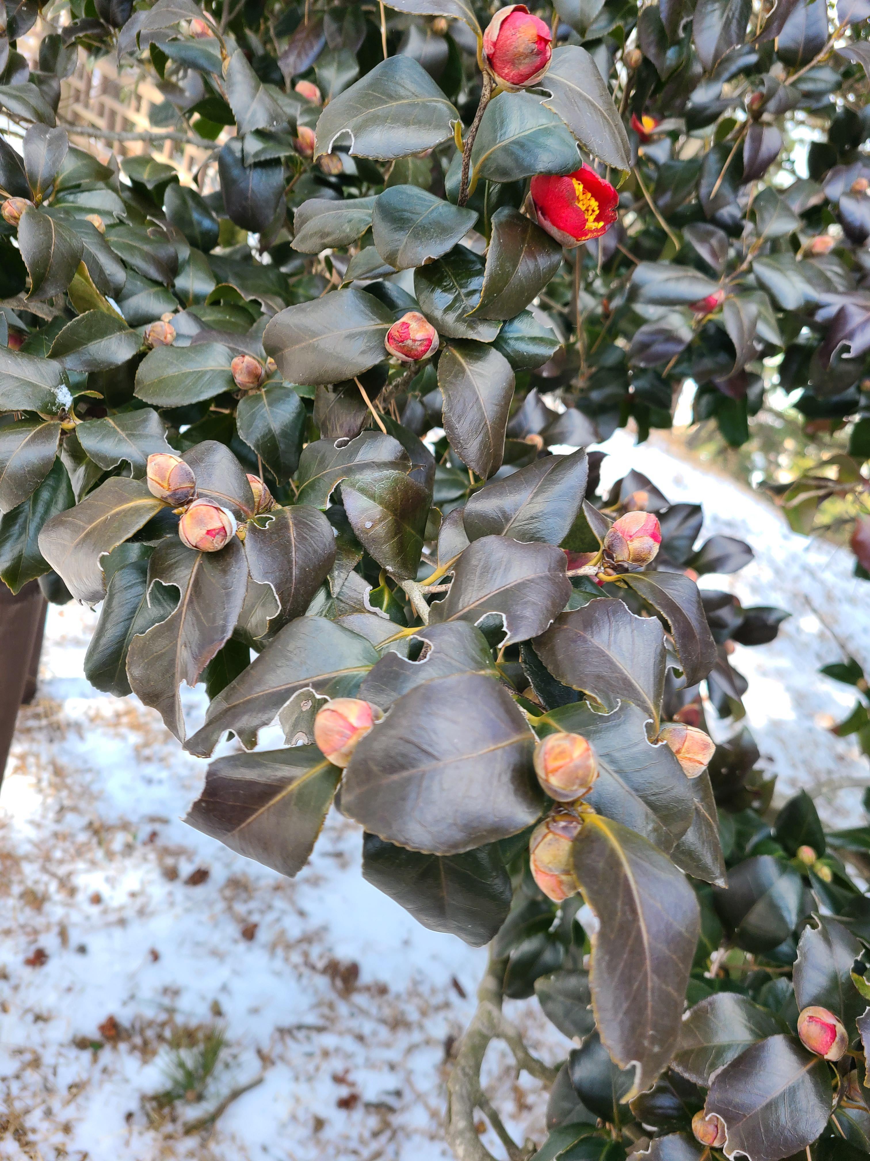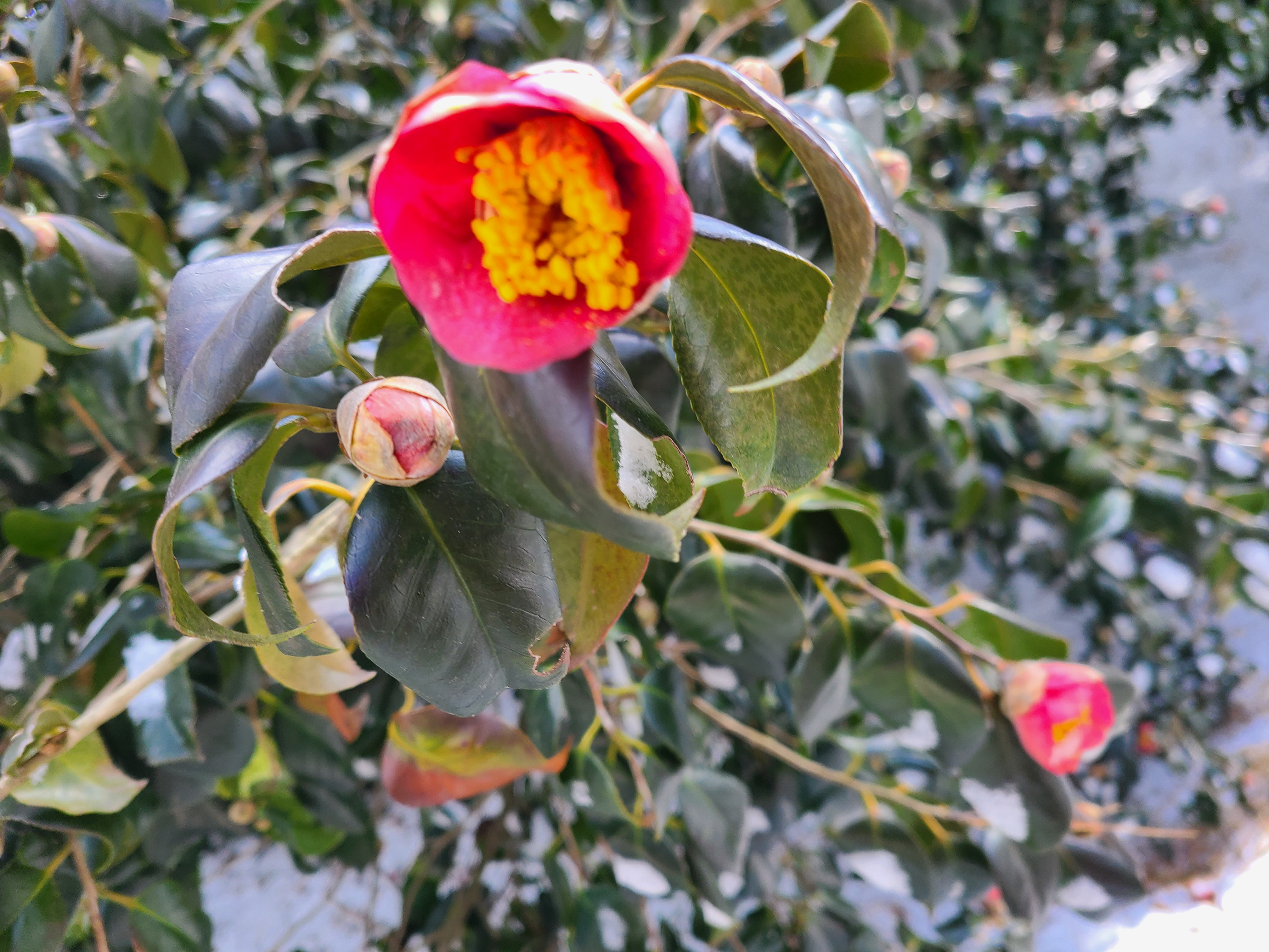 드디어 동백꽃을 만났다. 눈이 내리고 세찬 바람이 부는데도 동백꽃 꽃봉오리가 붉게 피어난 게 있었다. 떠나기 전 남편이 아직 동백꽃이 피지 않았을 것 같다고 했다. 나는 설마 한송이도 안 피었겠느냐고 했는데 막상 피여난 동백꽃을 보니 너무 기분이 좋았다.
