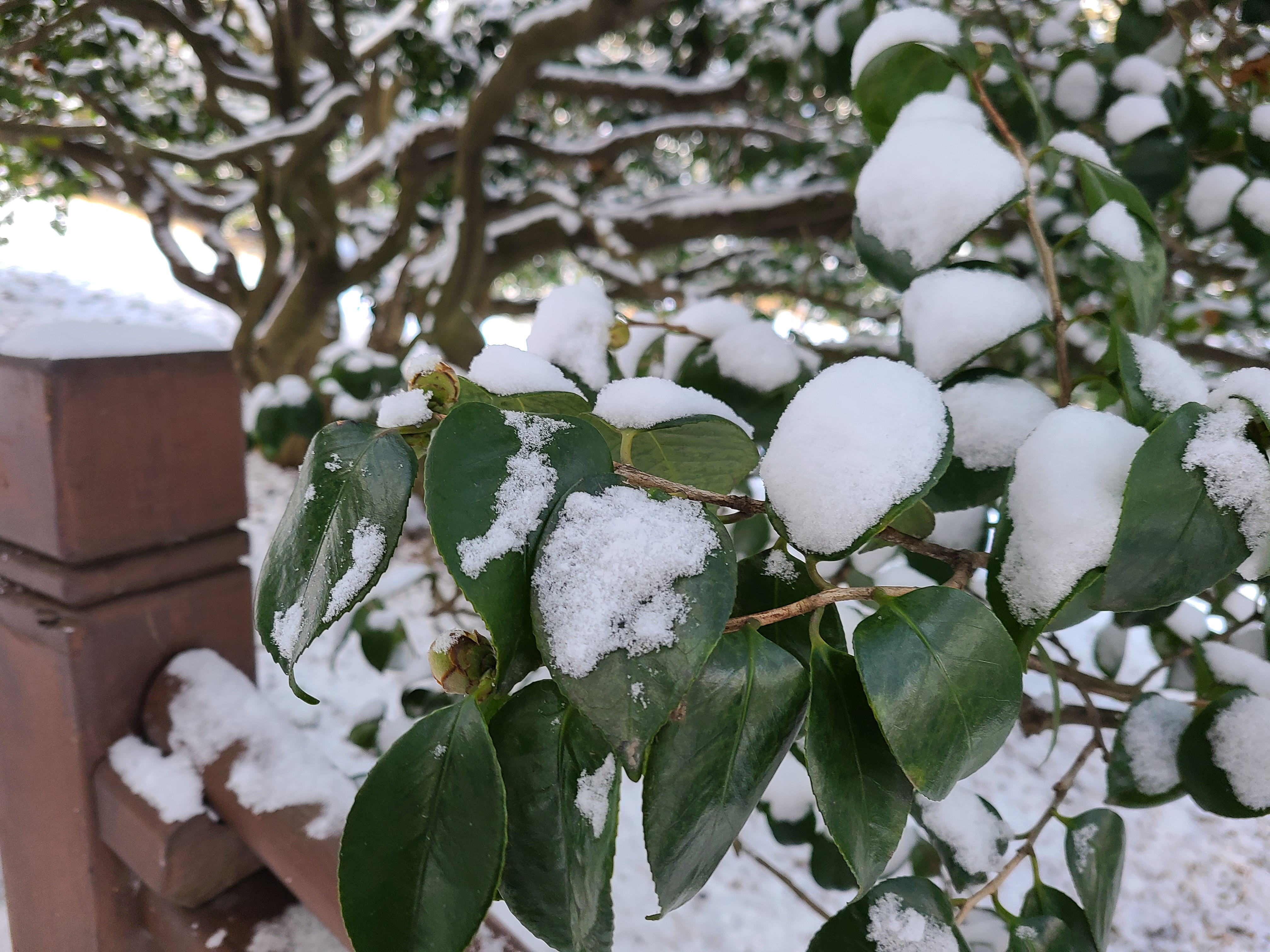 동백꽃 봉오리가 흰 눈에 덮여있다.