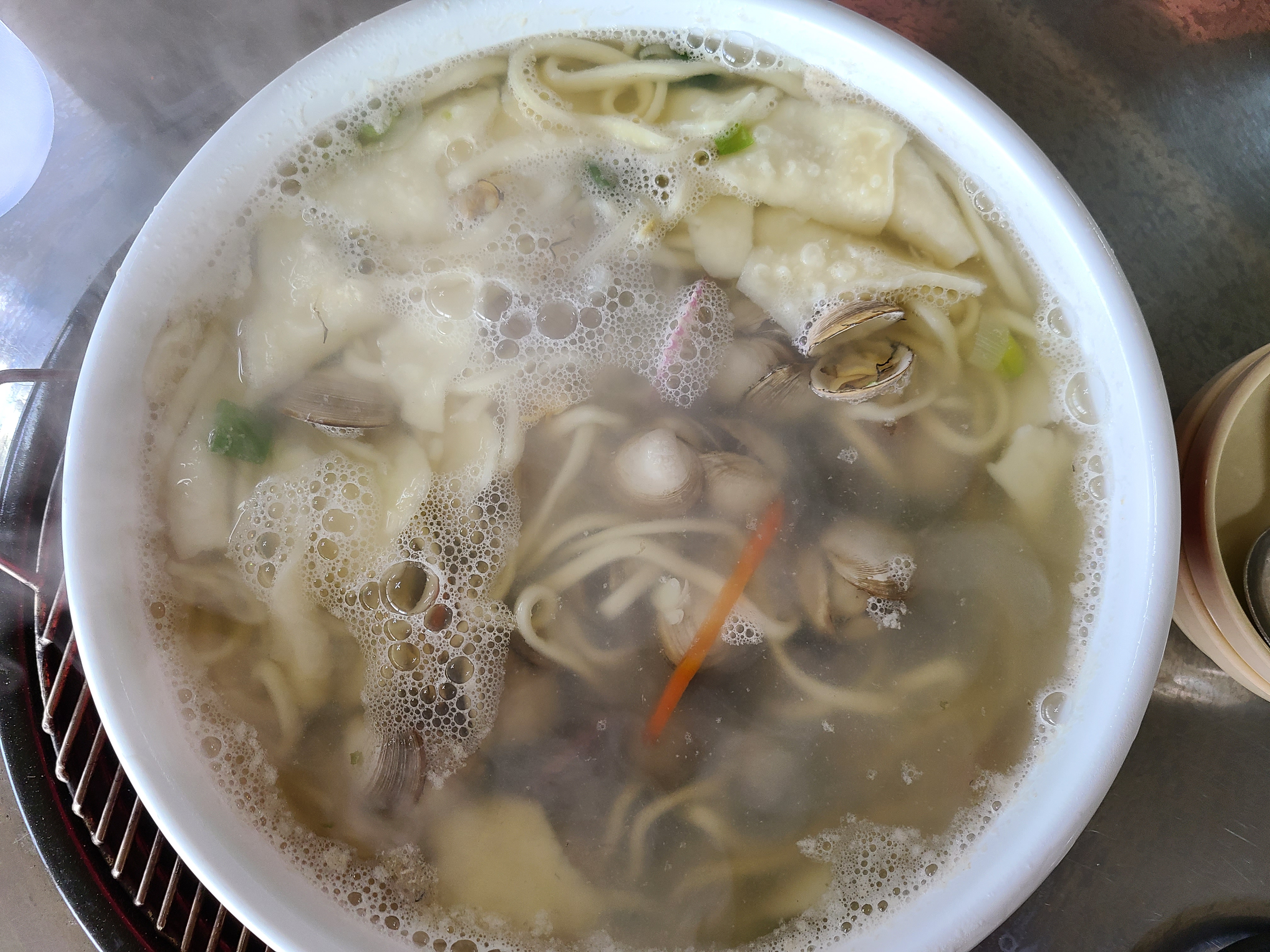 기다리던 해물 칼국수가 나왔는데 양이 장난이 아니다. 칼국수 면뿐 아니라 수제비까지 들어있고 동죽이 가득 들어있다.