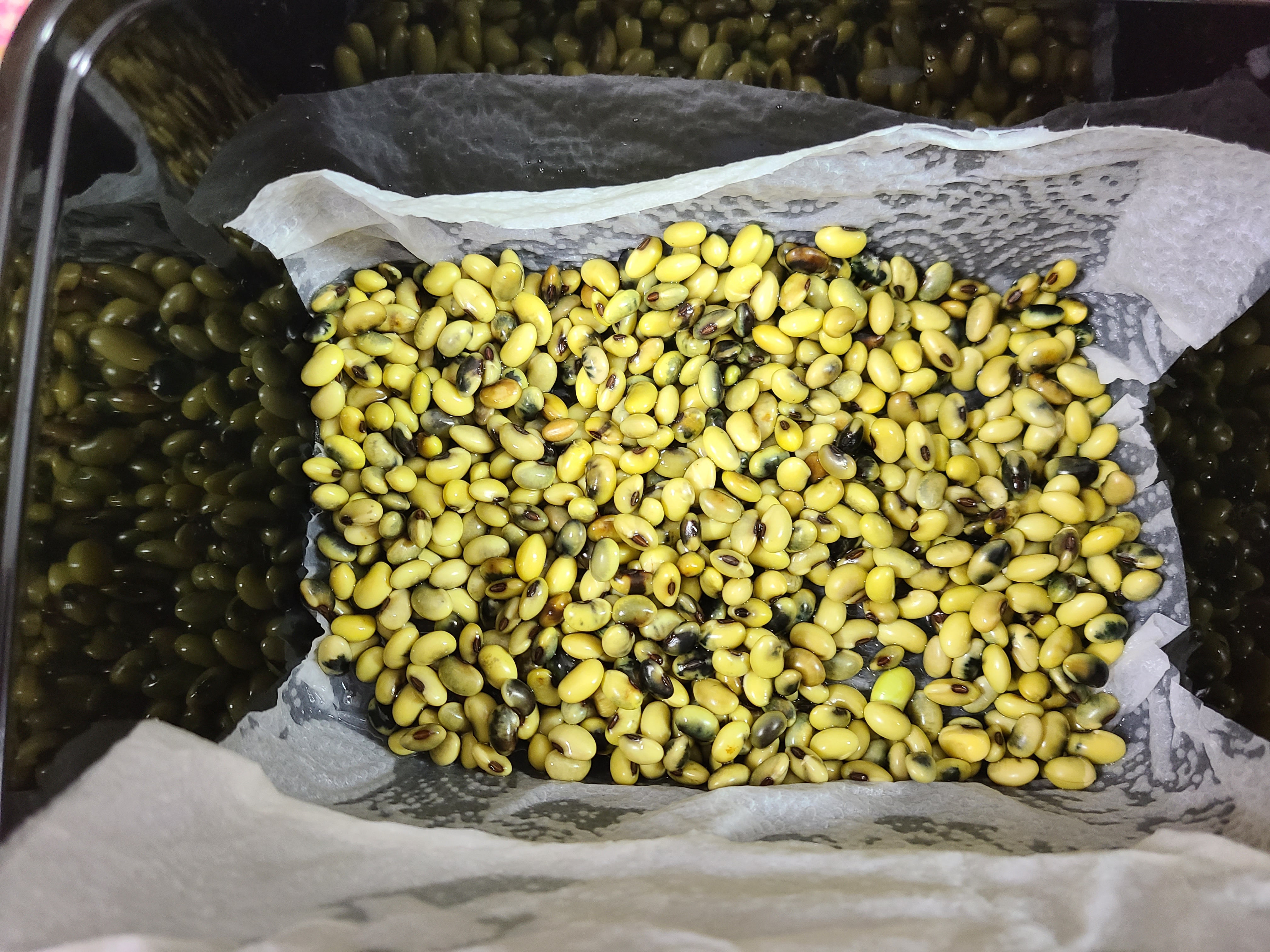콩나물 재배기가 중간에 하나는 밑에 물 빠지는 구멍이 있기에 키친타월 한 장을 물에 젖셔서 깔고 그위에 콩을 가지런히 피고 다시 물에 적신 키친타월을 한 장 덮어 주웠다.