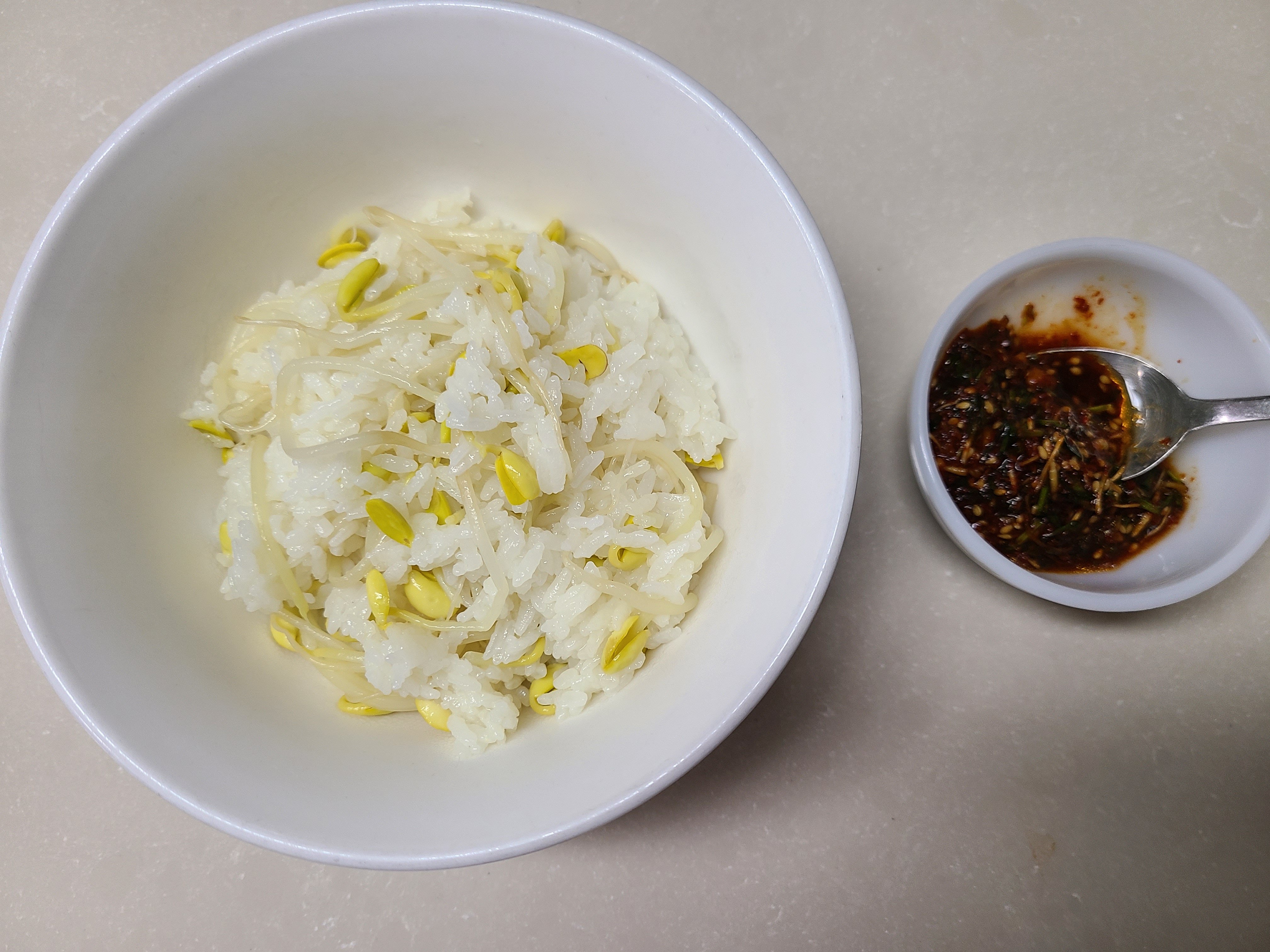 솥에 불린 쌀과 다시마물을 같은 비율로 넣고 위에 콩나물을 듬뿍 얹어주고 평소 밥하듯이 하면 된다.