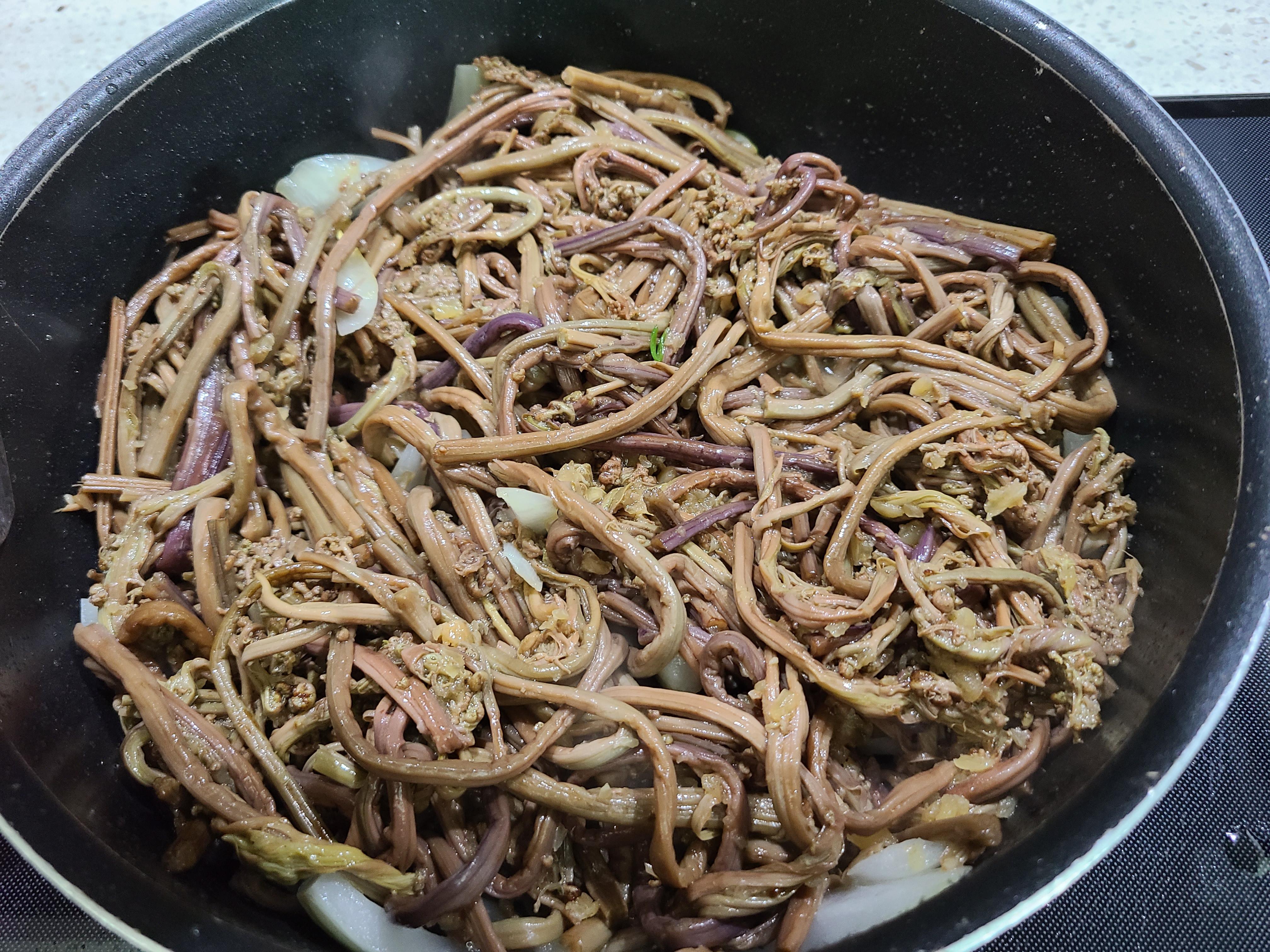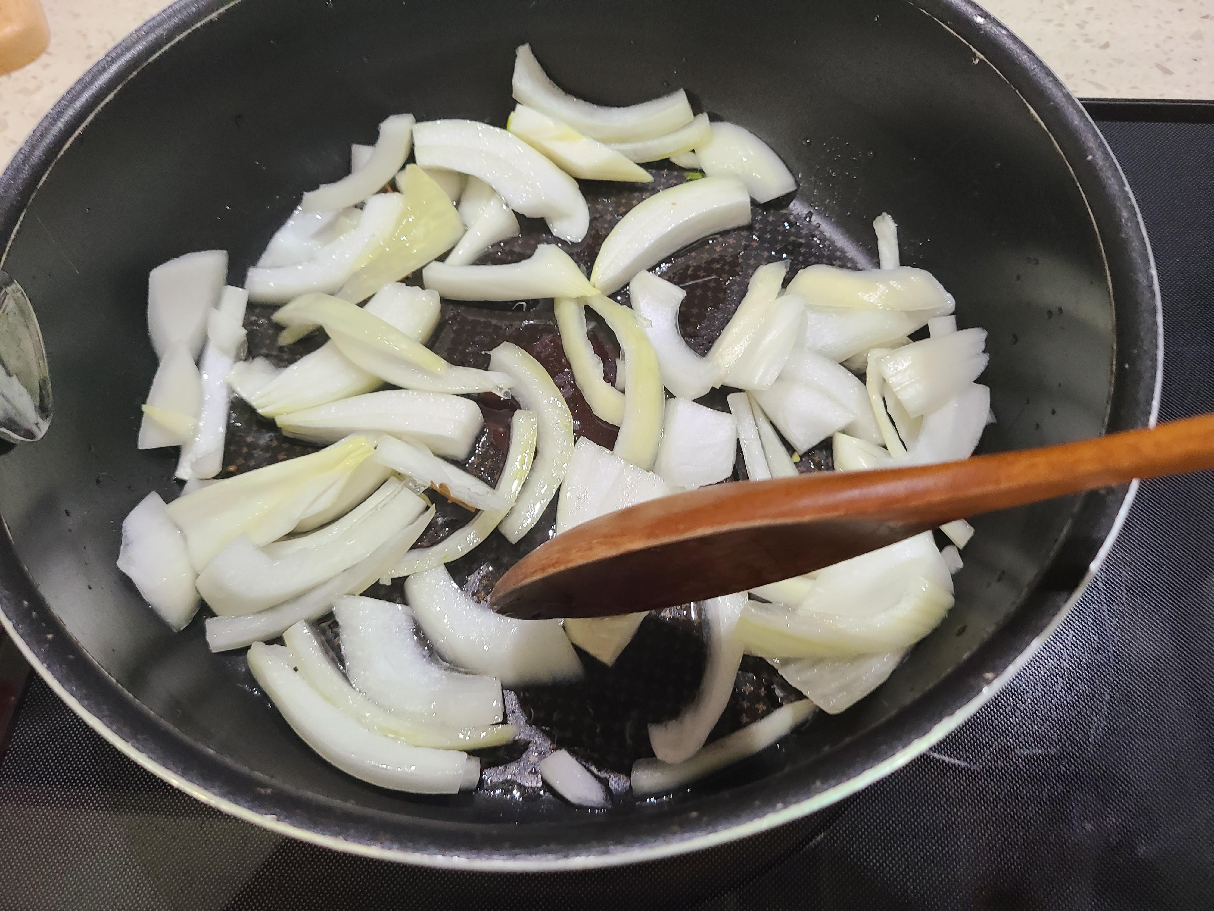 4. 팬에 포도씨유 1큰술을 넣은 후 양파를 먼저 볶아 주다가 양파가 투명해지기 시작하면 양념에 재워놓은 고사리를 넣고 다시마물 1컵을 붓고 뚜껑을 닫아 끓여 준다.