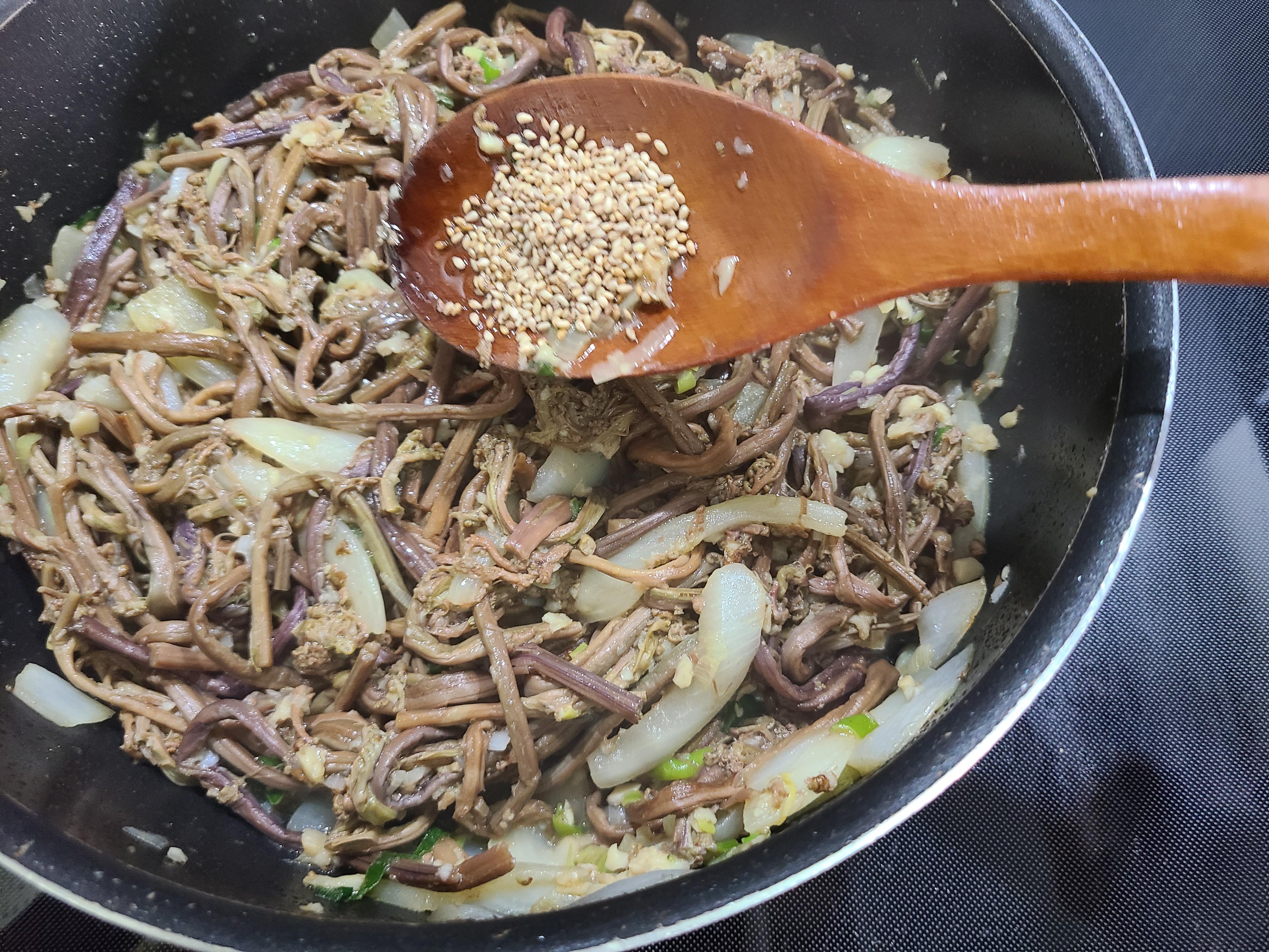 4. 다진 파를 넣고 볶아준 후 불을 끄고 통깨와 참기름을 뿌려준다.