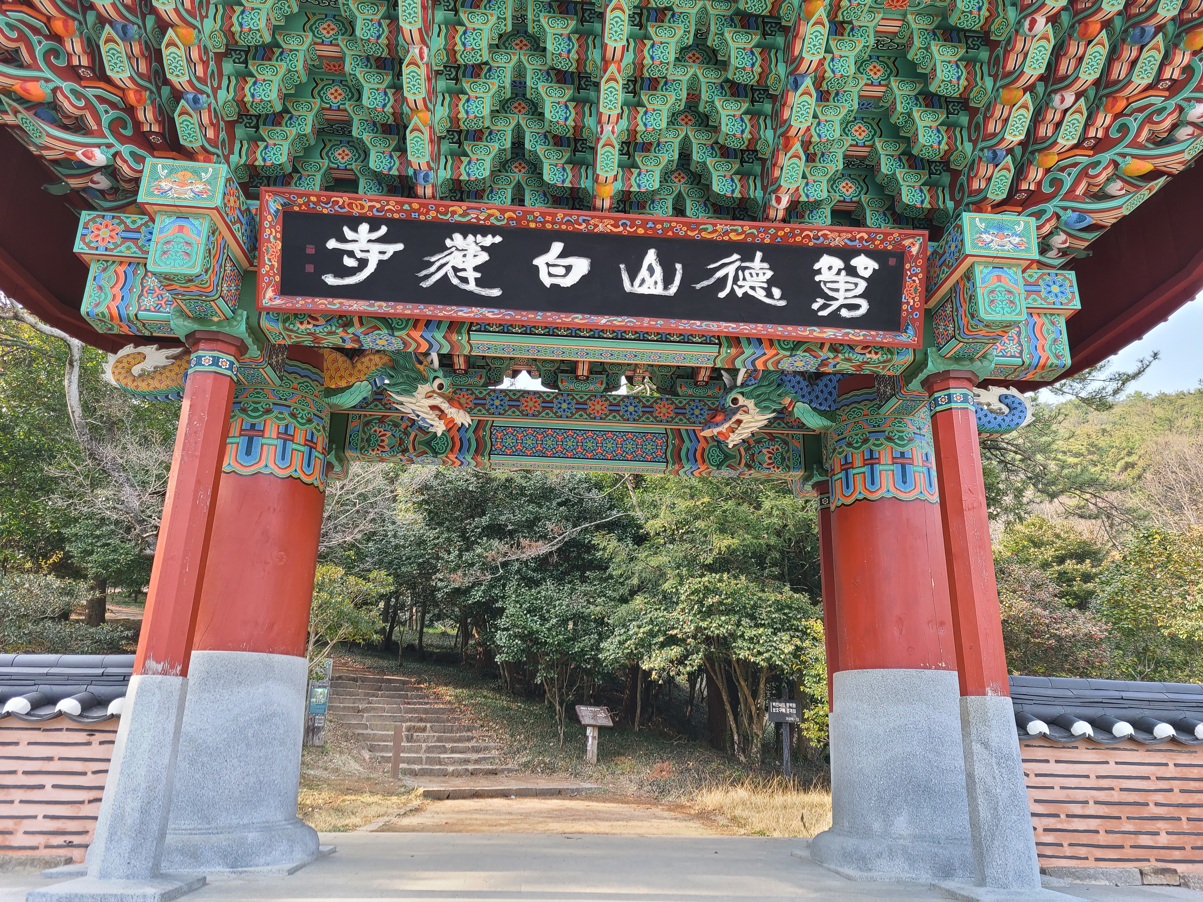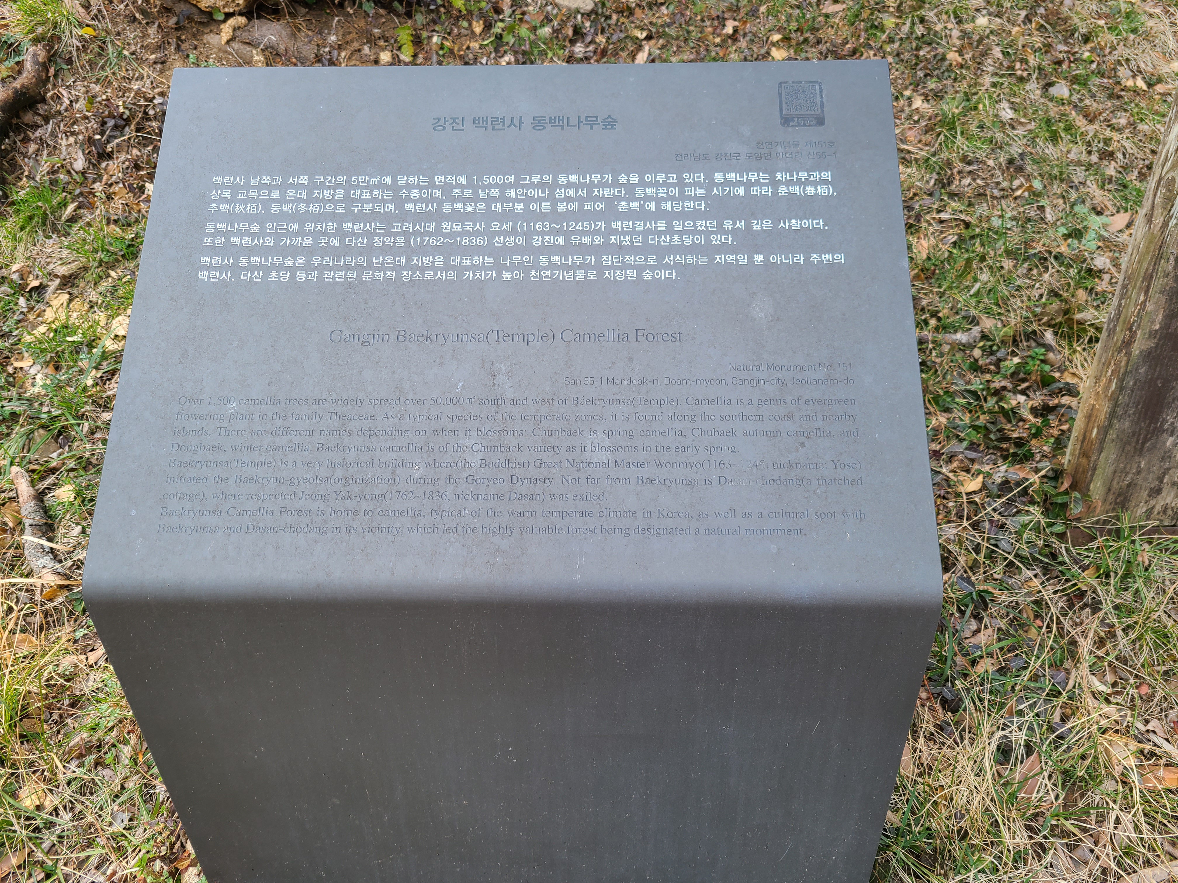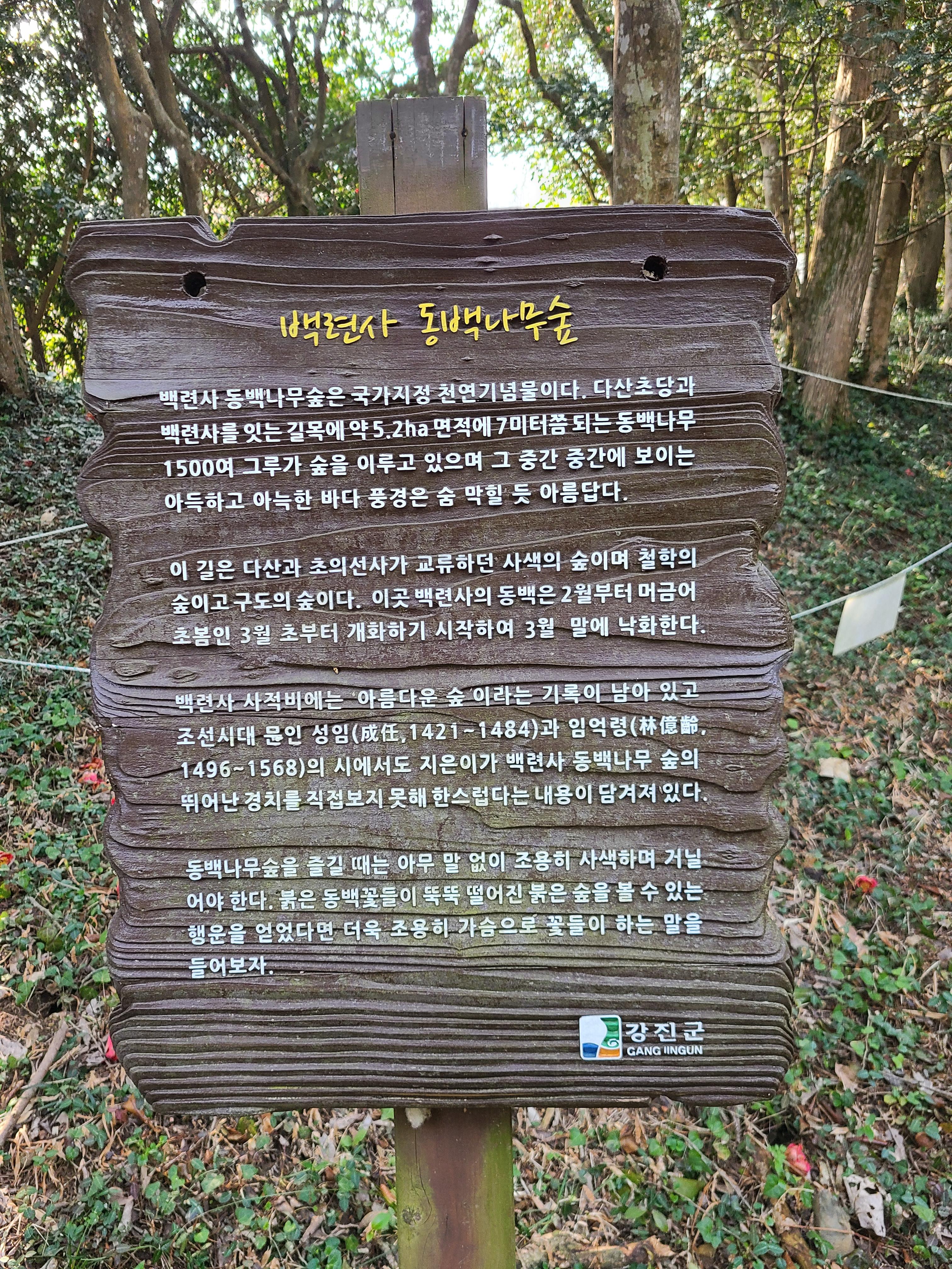천관산 동백 생태숲에서 출발하여 30분이 되지 않은 시간에 백련사에 주차장에 도착하였다. 이곳 백련사 동백림은 문화재 지정 천연기념물 151호로 지정되어 있다. 백련사에 들어오는 도로 양쪽에도 동백나무가 가로수로 심겨 있는데 백련사 입구에서 보면 백련사 왼쪽으로 1,500여 그루의 동백나무가 숲을 이루고 있다.