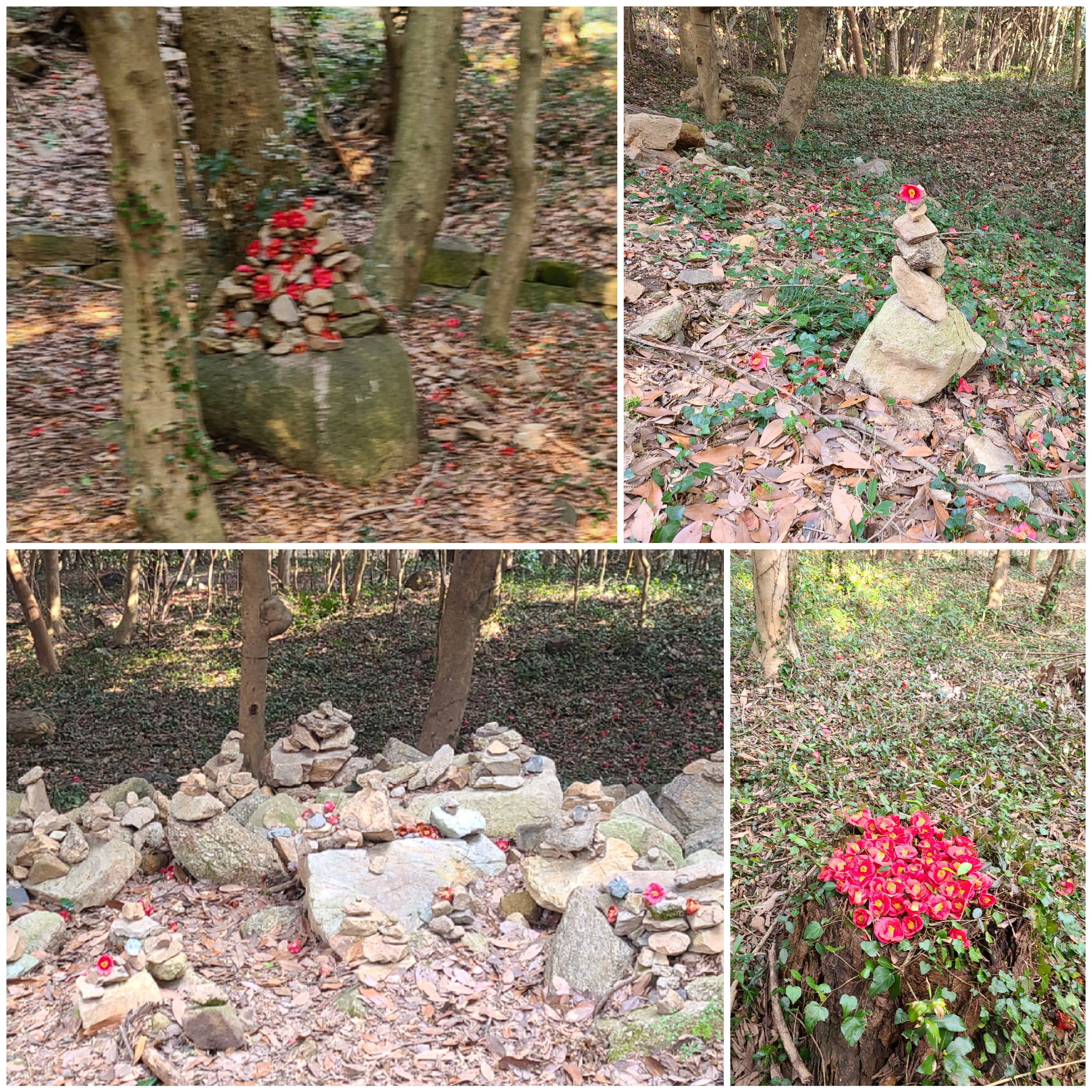 돌탑과 나무 그루터기에도 동백꽃이 한아름 올려져 있다.