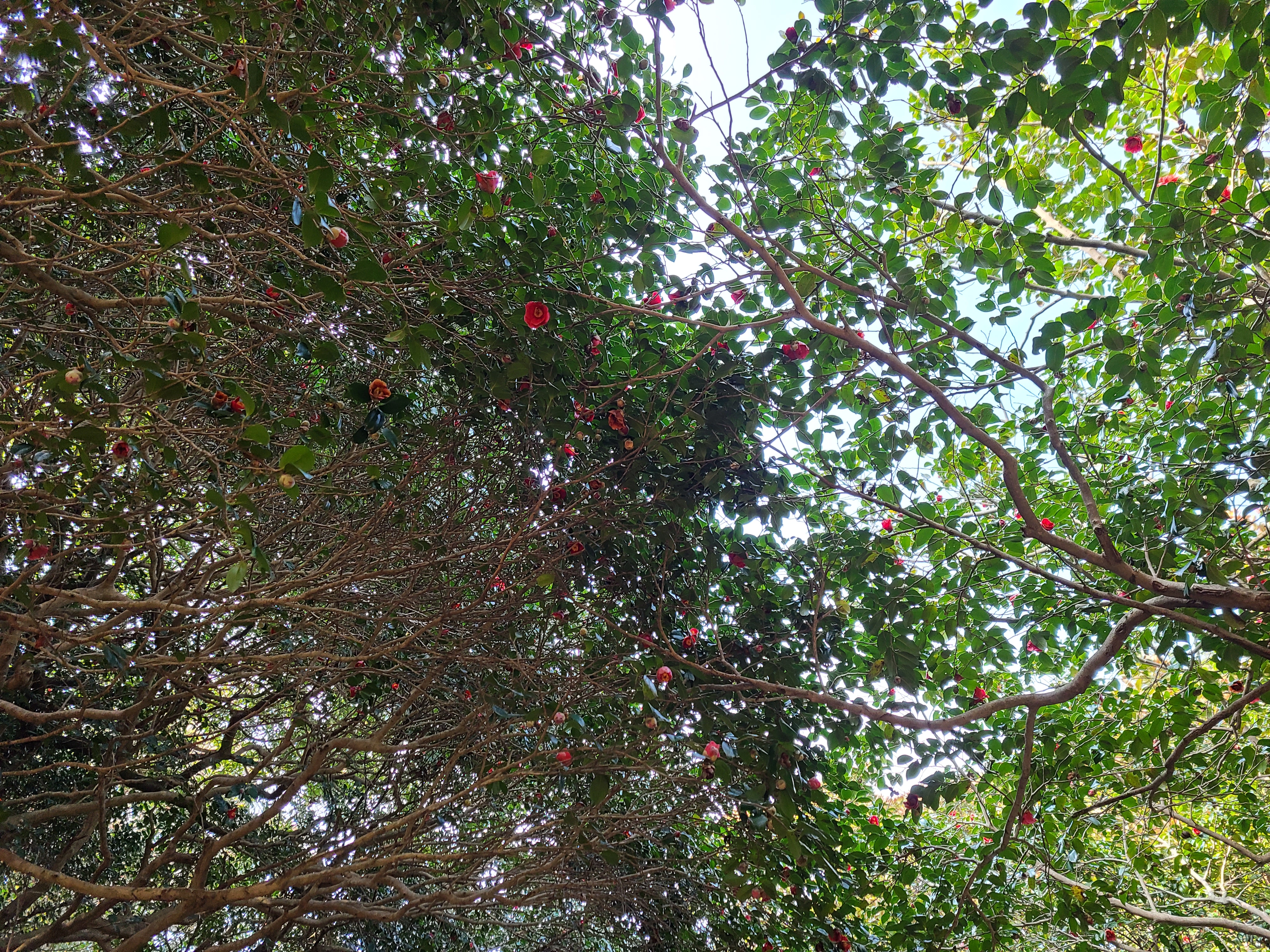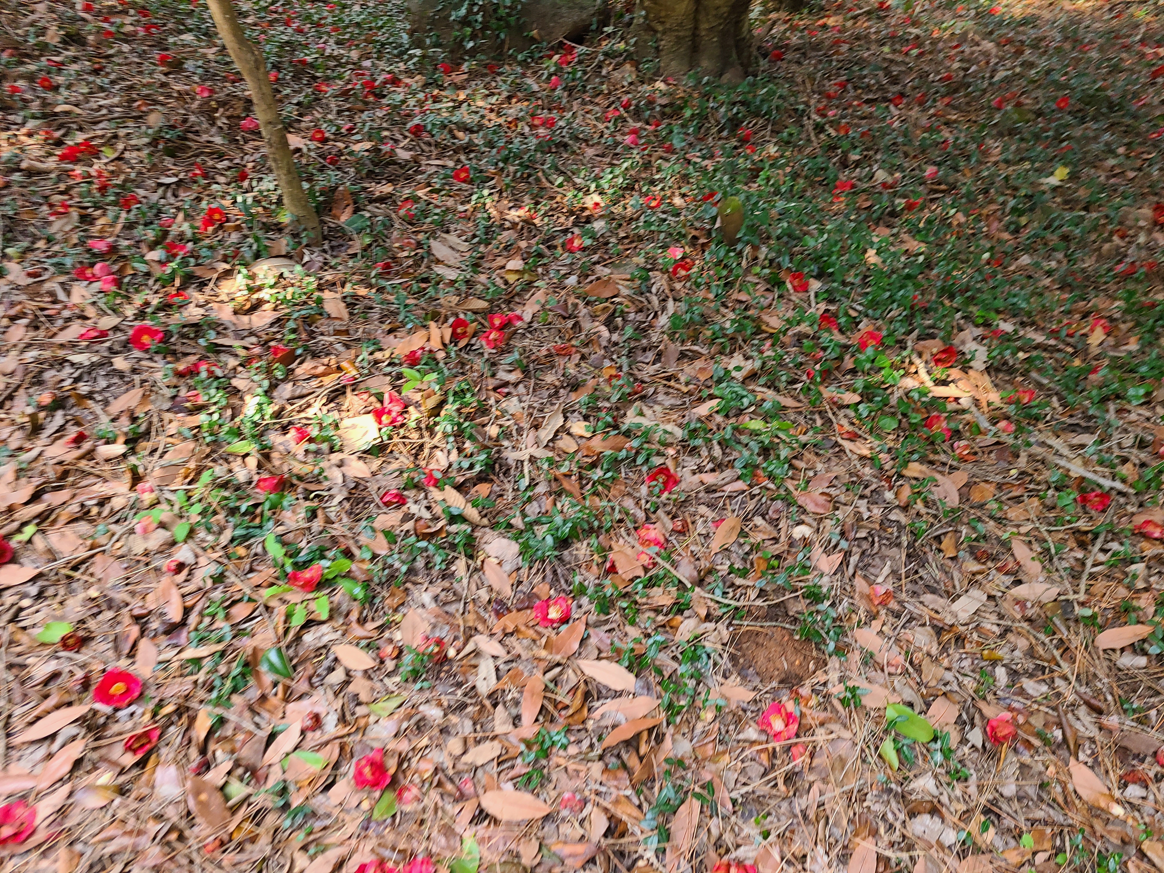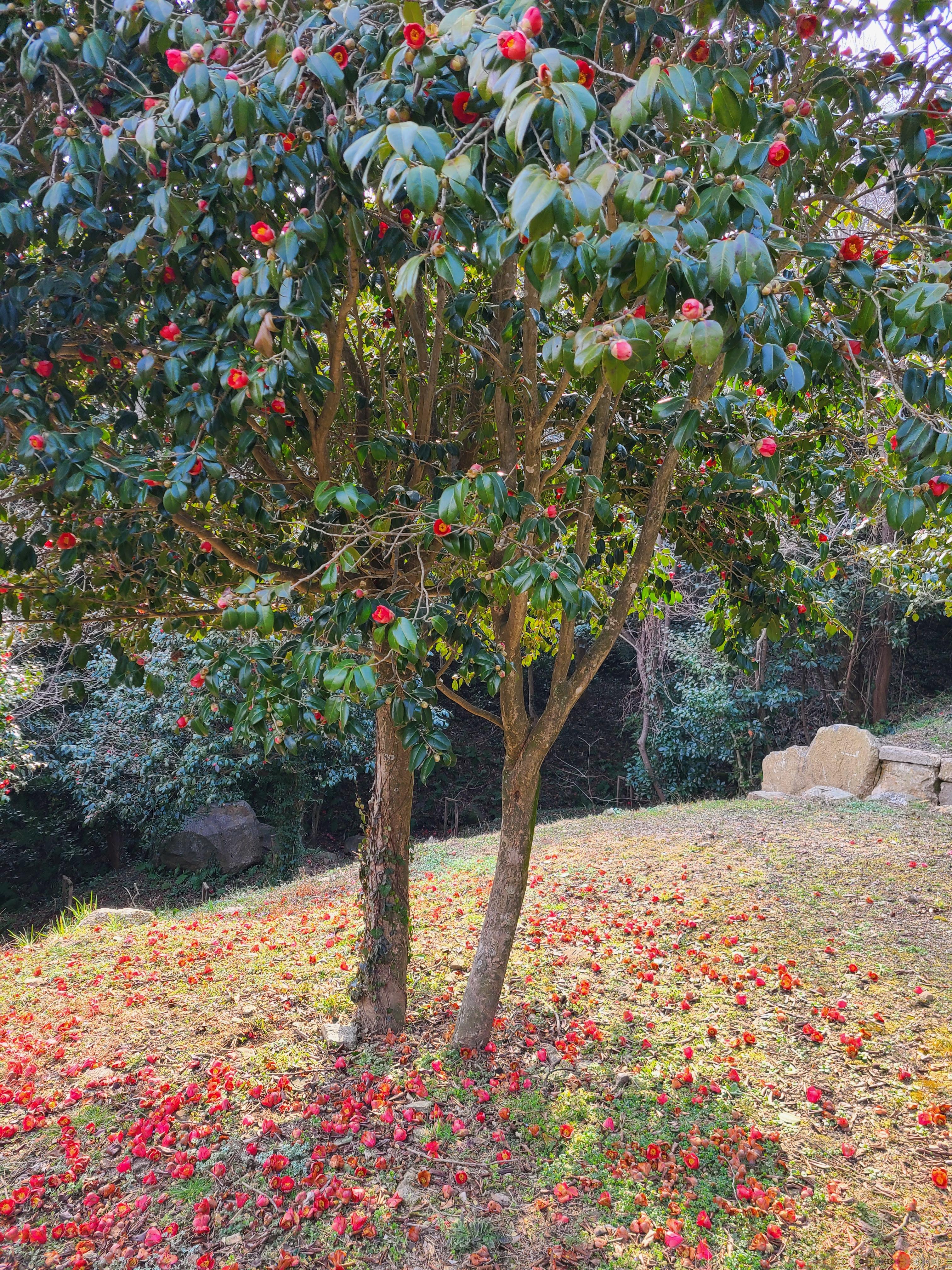 동백꽃이 나무 위에도 피고 나무 아래에도 피어있다.