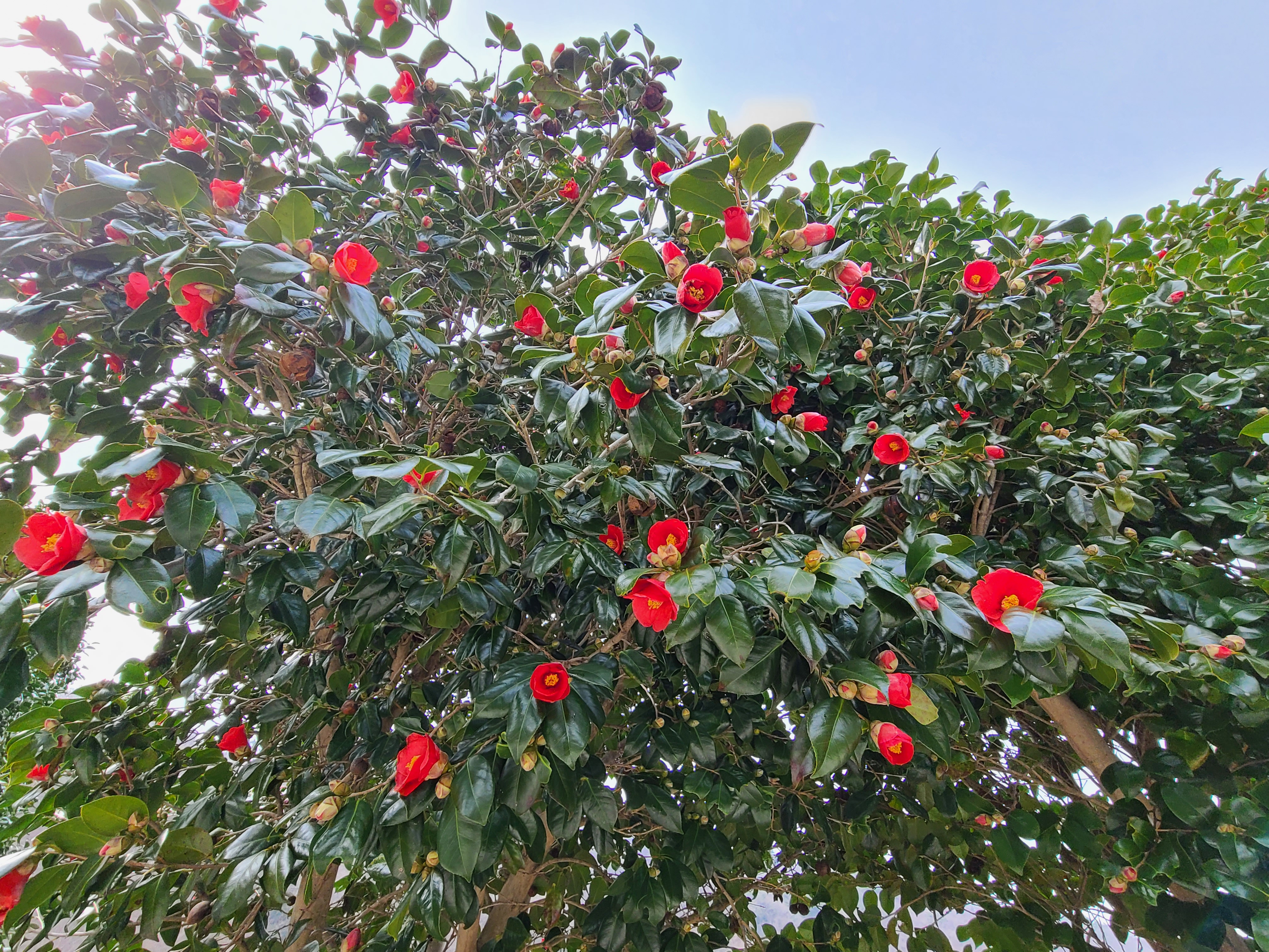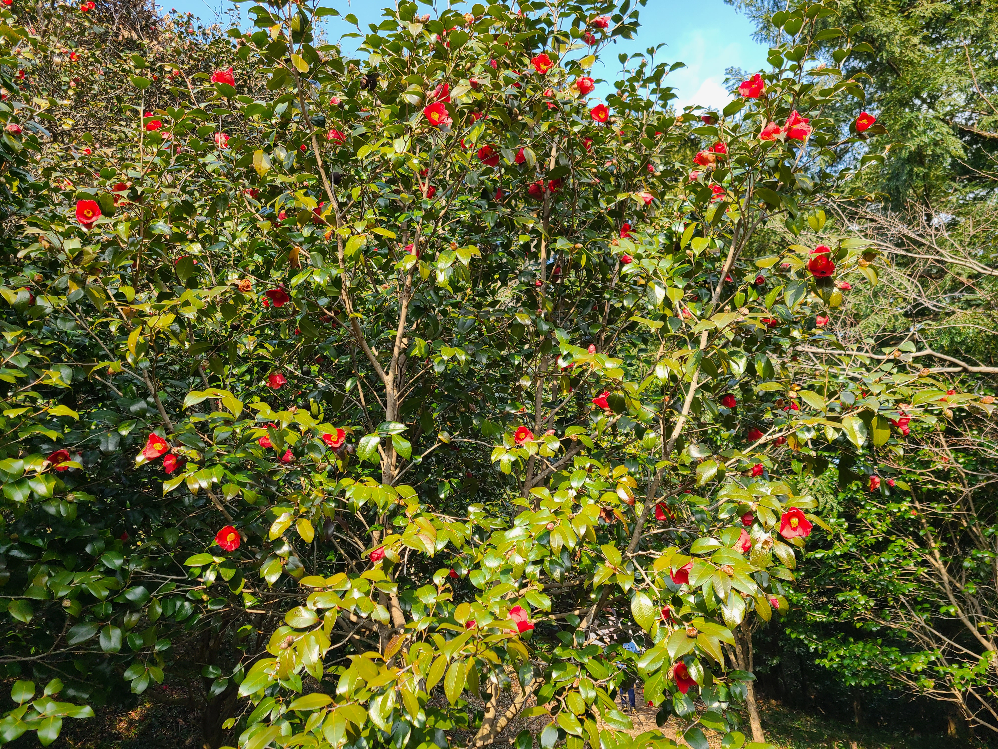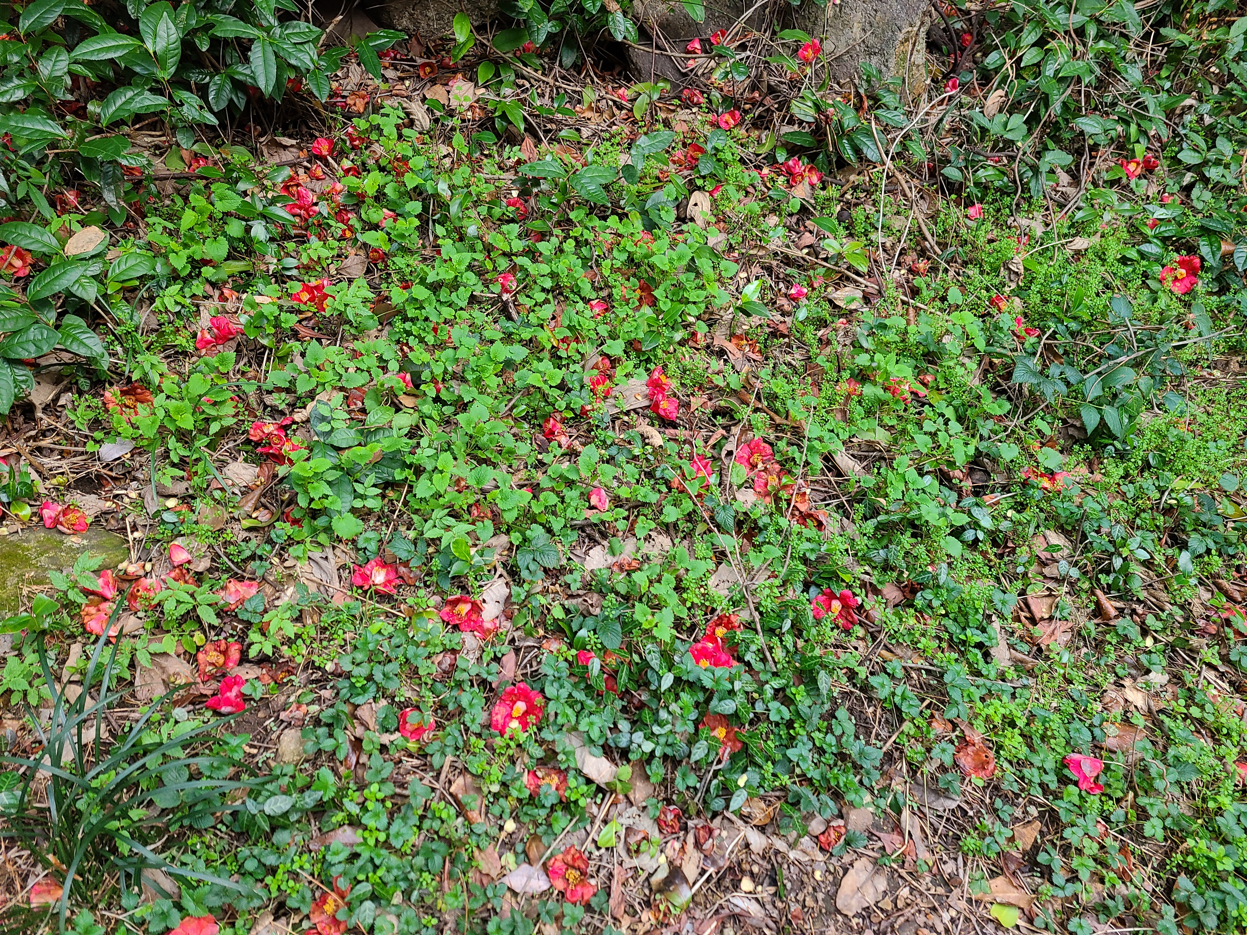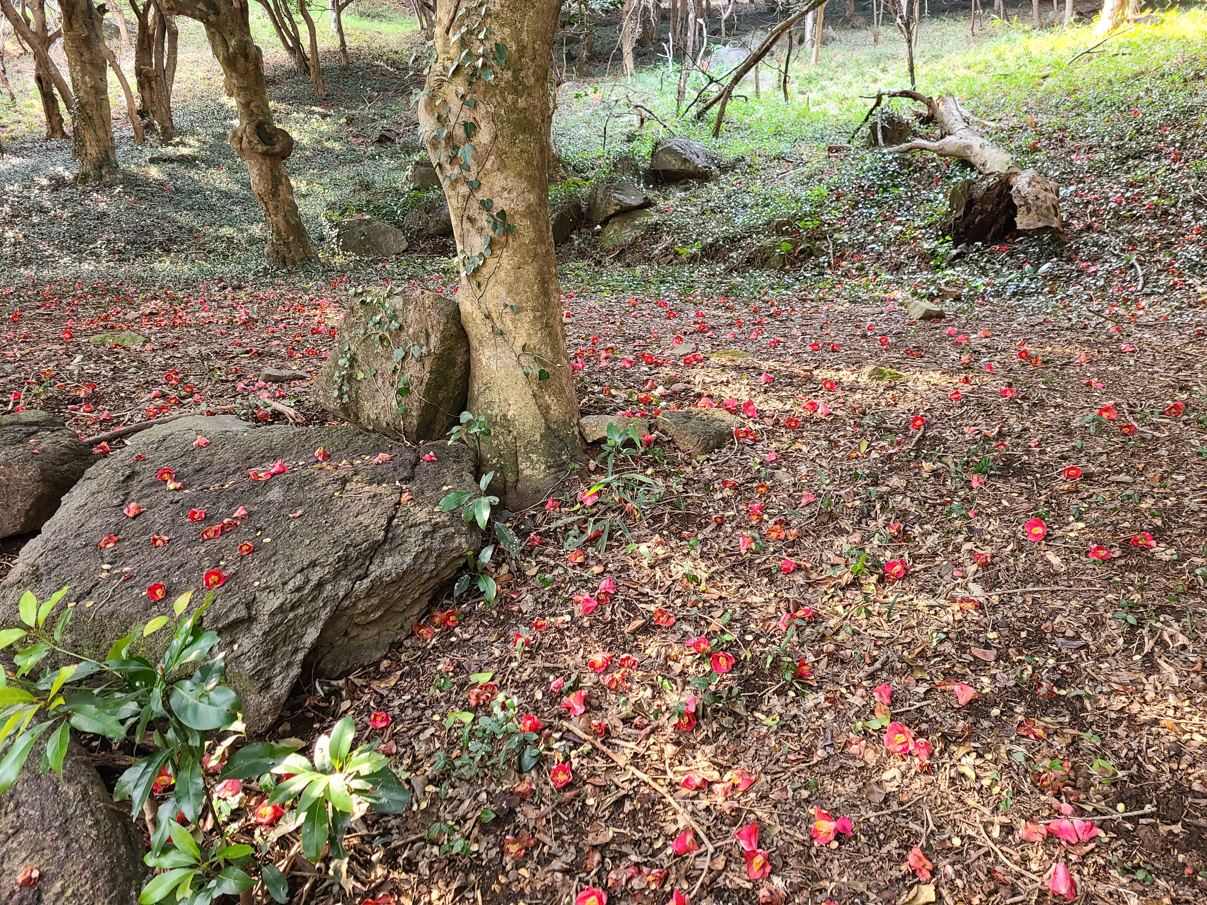 동백꽃이 나무 위에도 피고 나무 아래에도 피어있다.