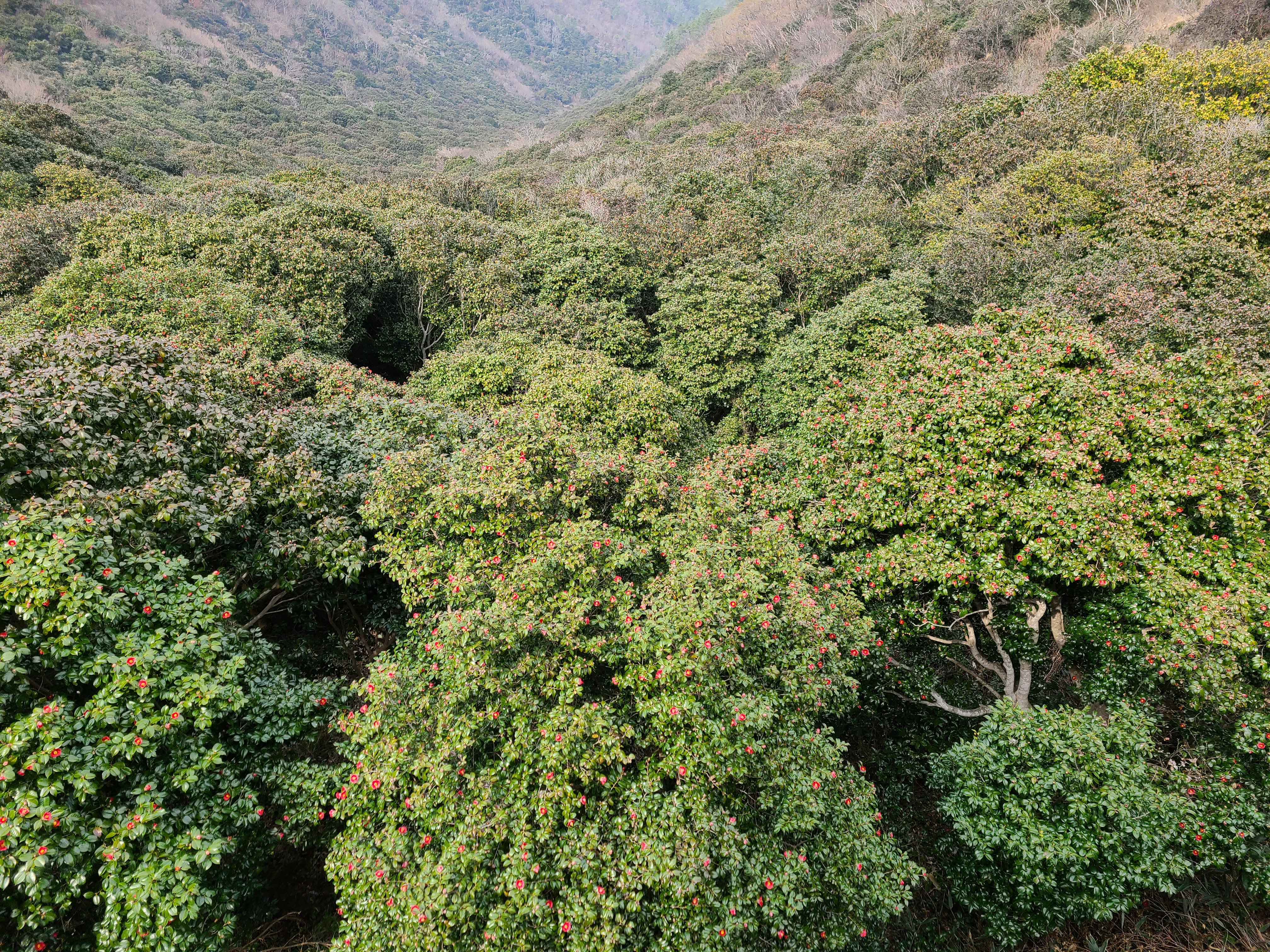 전망대 가까이에 와보니 차가 몇 대 세워져 있기는 하였지만 우리가 주차할 공간이 남아 있었다. 전망대에서 내려다보니 동백나무의 규모가 상당해 보였다.