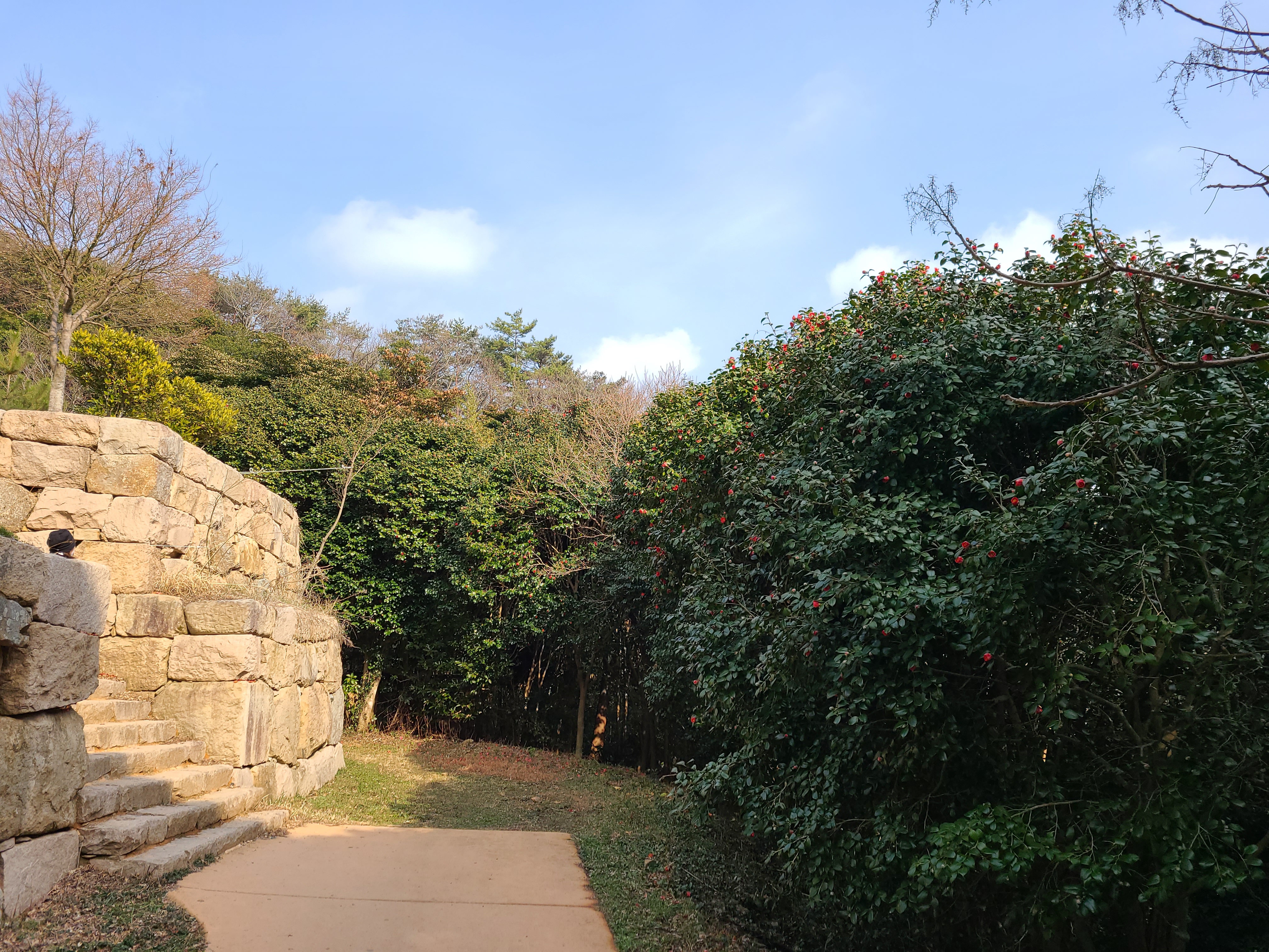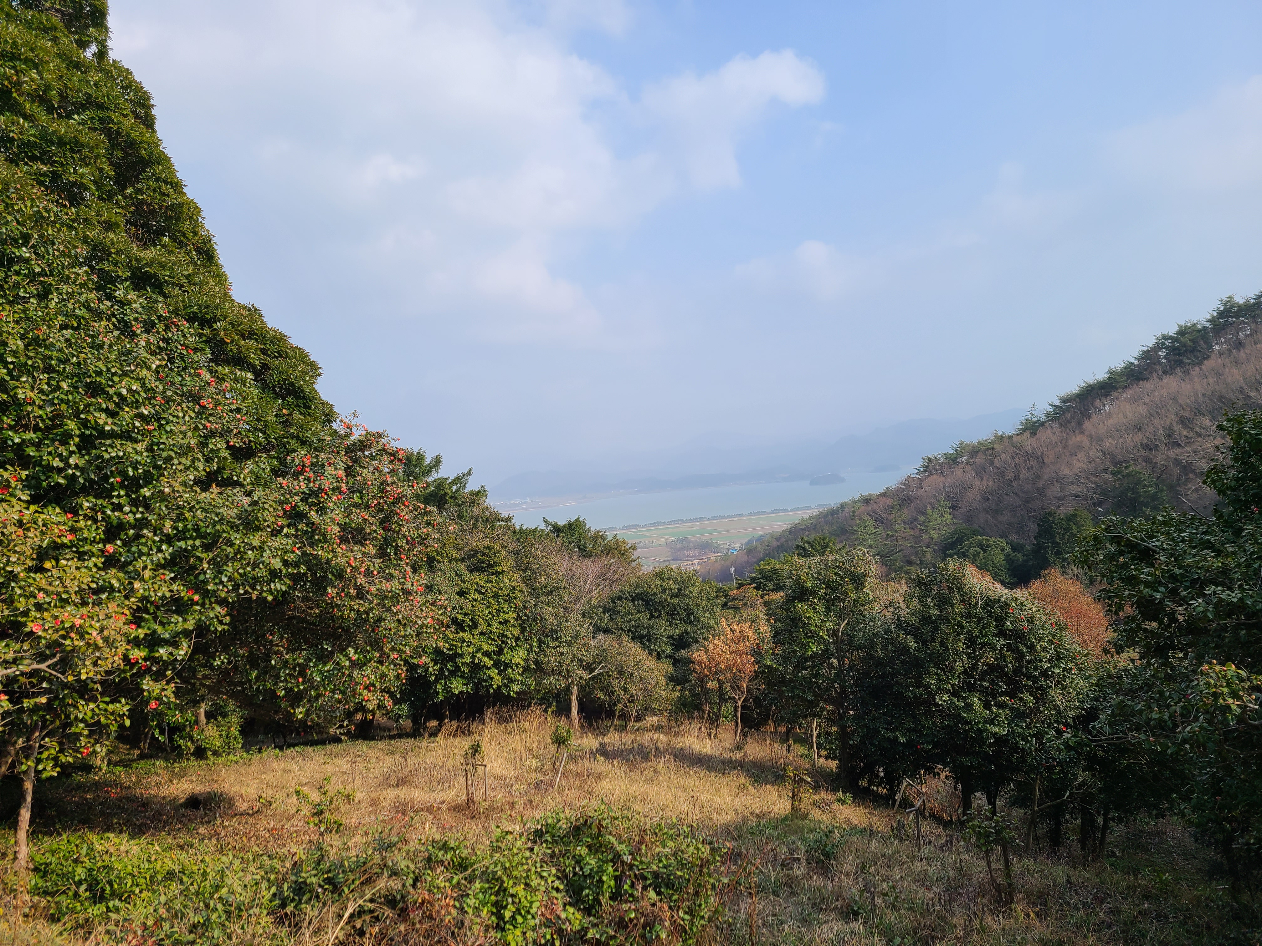 동백꽃길을 따라 걷다 보니 누군가 숲 한쪽에서 기타를 치며 노래를 하고 있다. 새소리와 동백꽃이 떨어지는 소리가 너무 좋은데 오늘만큼은 그 노랫소리가 새들의 노랫소리를 방해하는 것 같았다. 나무 사이로 강진만이 보인다.