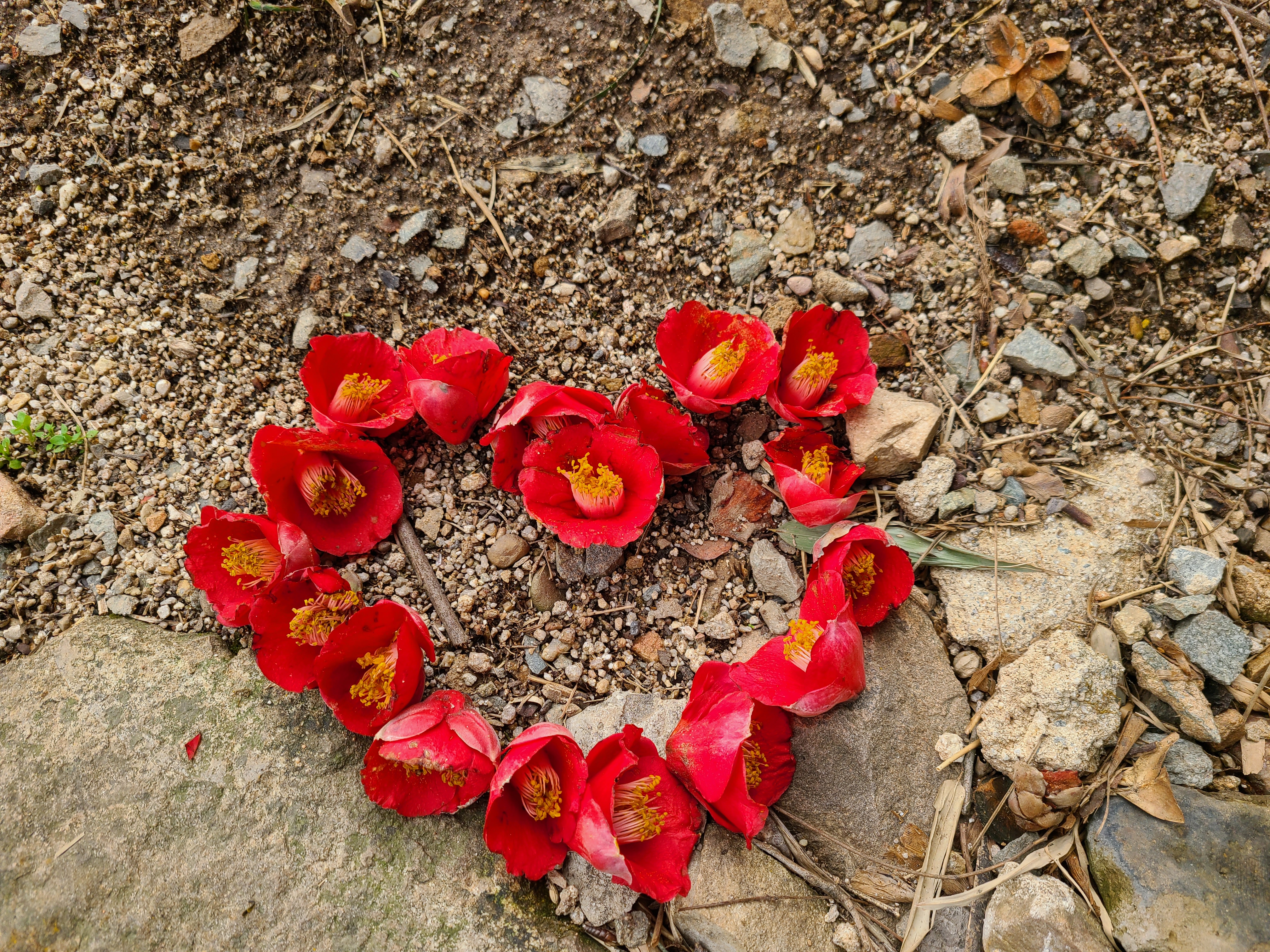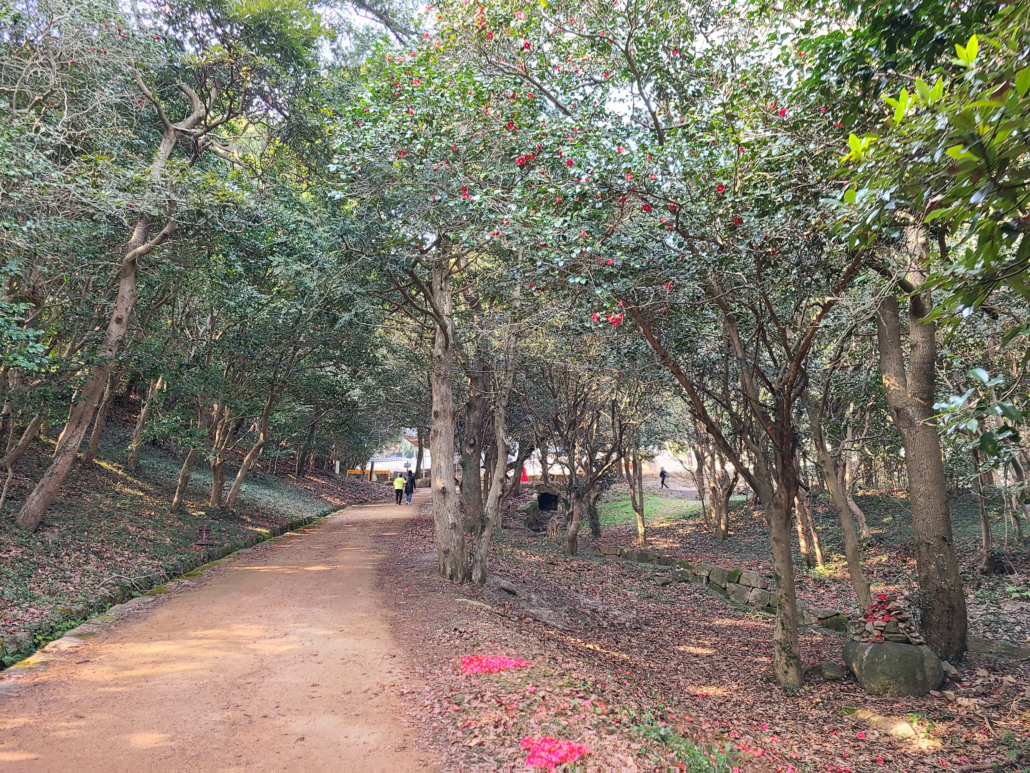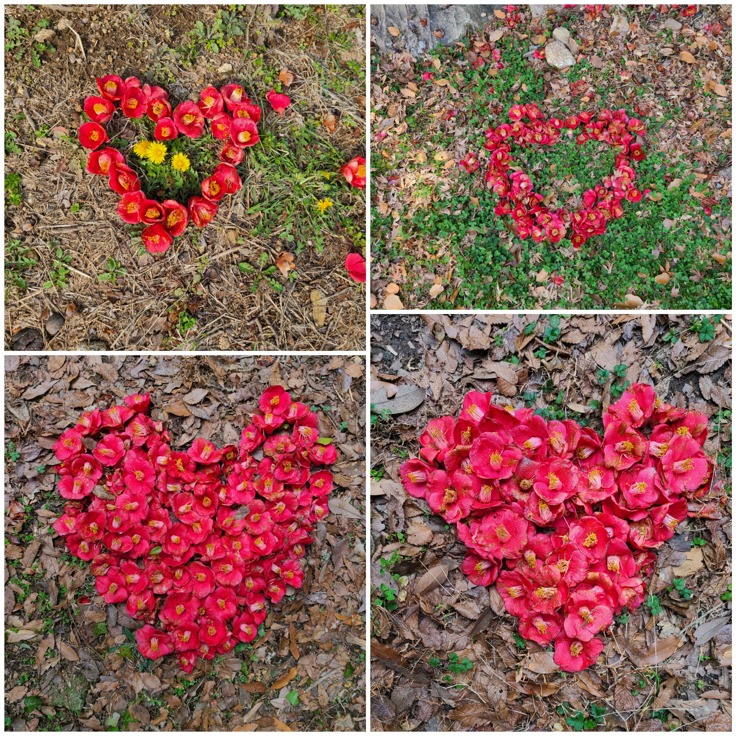 먼저 다녀간 이들이 떨어진 동백꽃으로 하트를 만들어 놓았다. 이후로도 곳곳에 동백꽃으로 만들어 놓은 하트가 동백나무 밑에 수놓아져 있다.