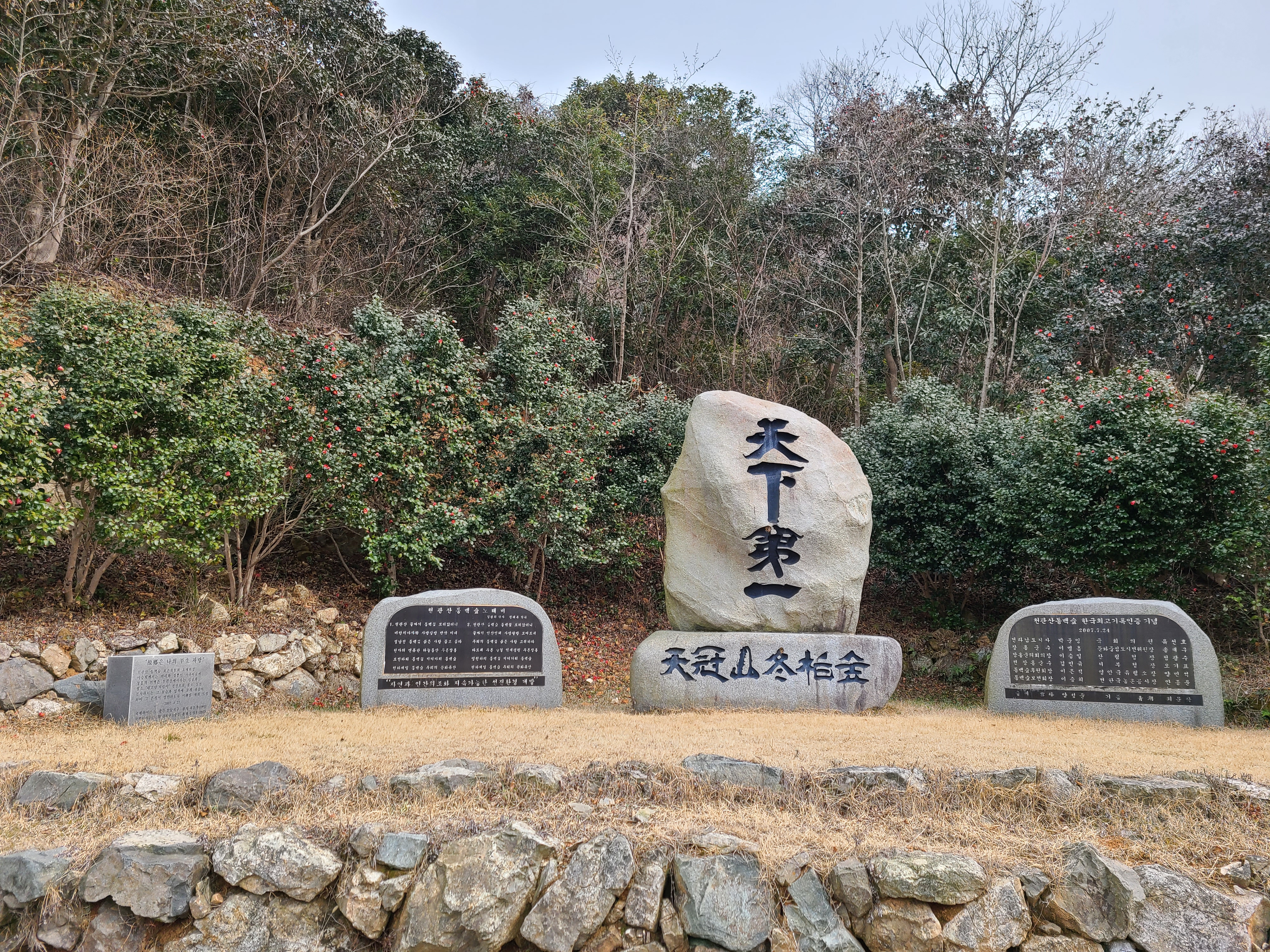 탐방로 맞은편에 기념비가 세워져 있는데 가운데 '천하제일 천관산 동백숲'이라 적혀있고 왼쪽에는' 천관산 동백숲 노래비'가 새겨져 있고 오른쪽에는 '천관산 동백숲 한국 최고 기록 인증 기념'이라고 새겨져 있다.
