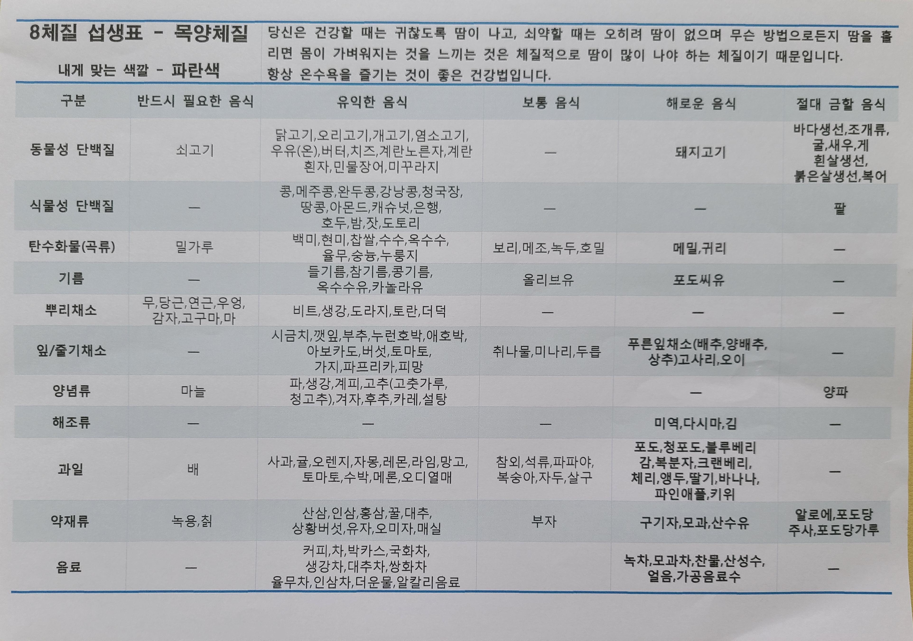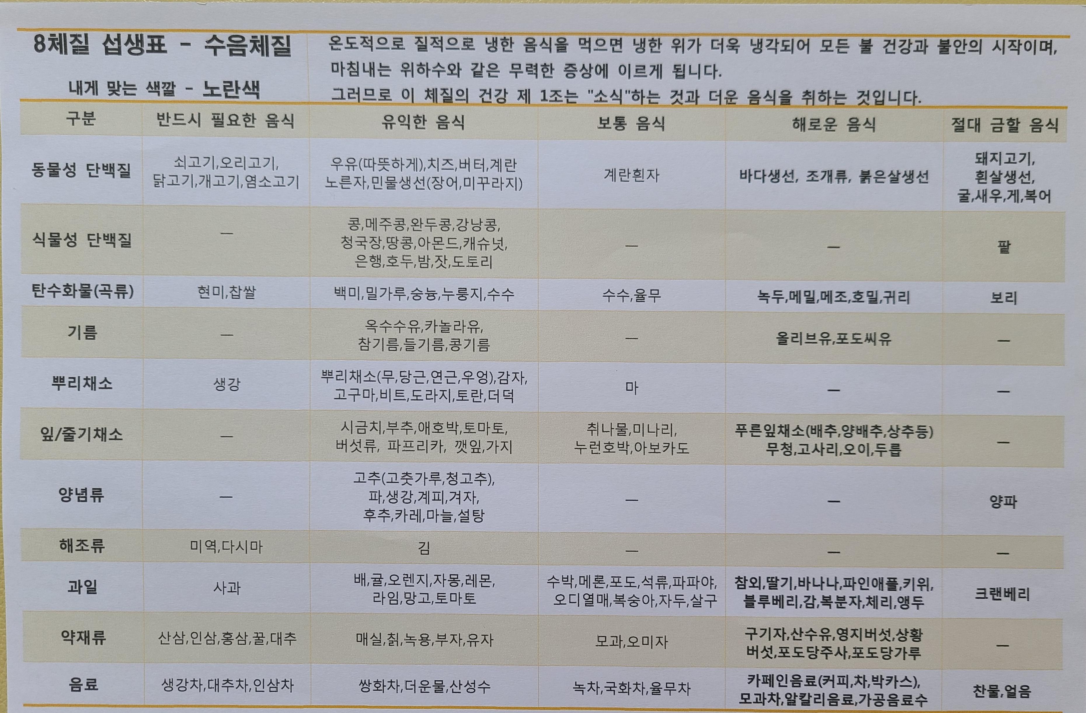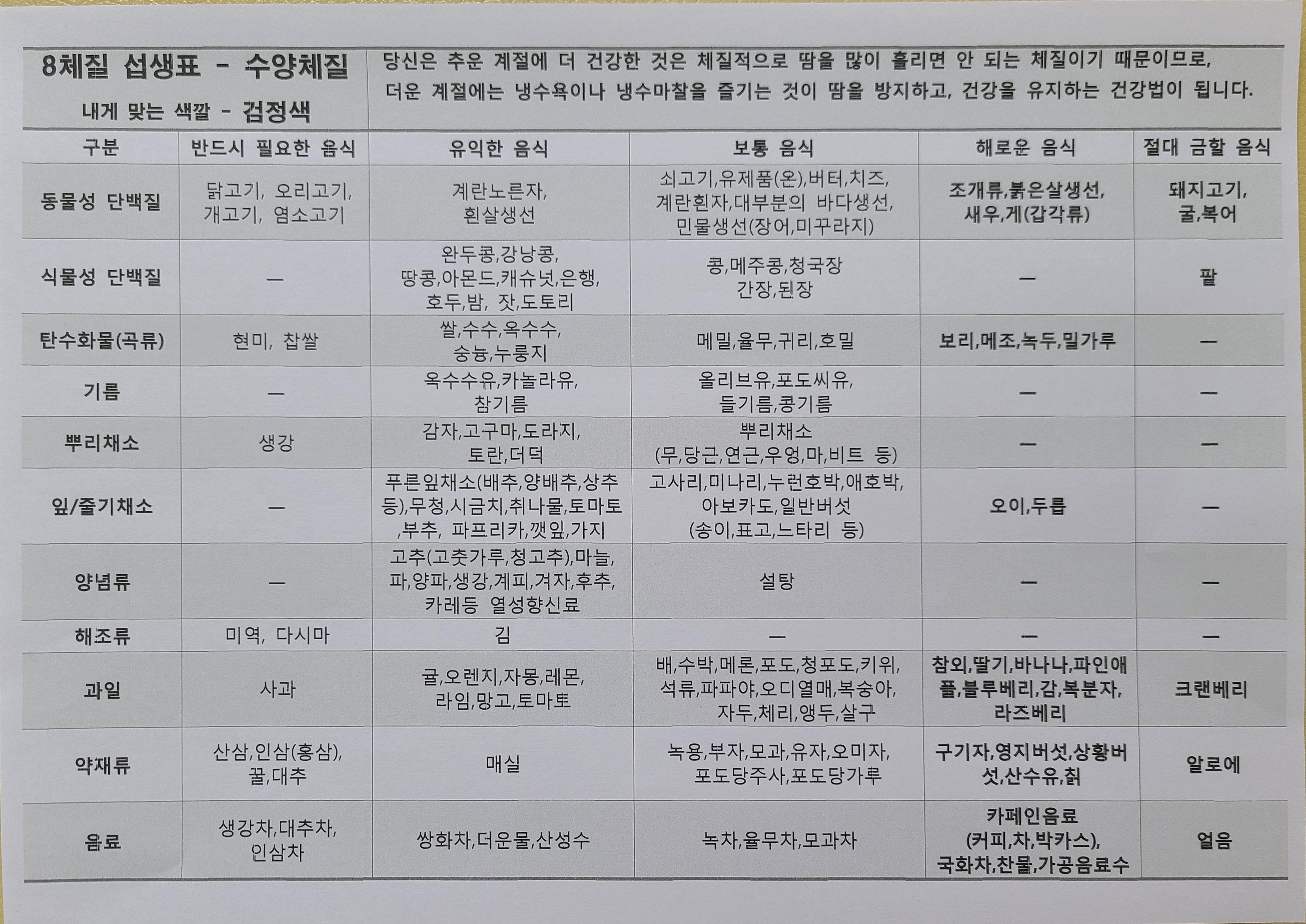 팔 체질 섭생 표