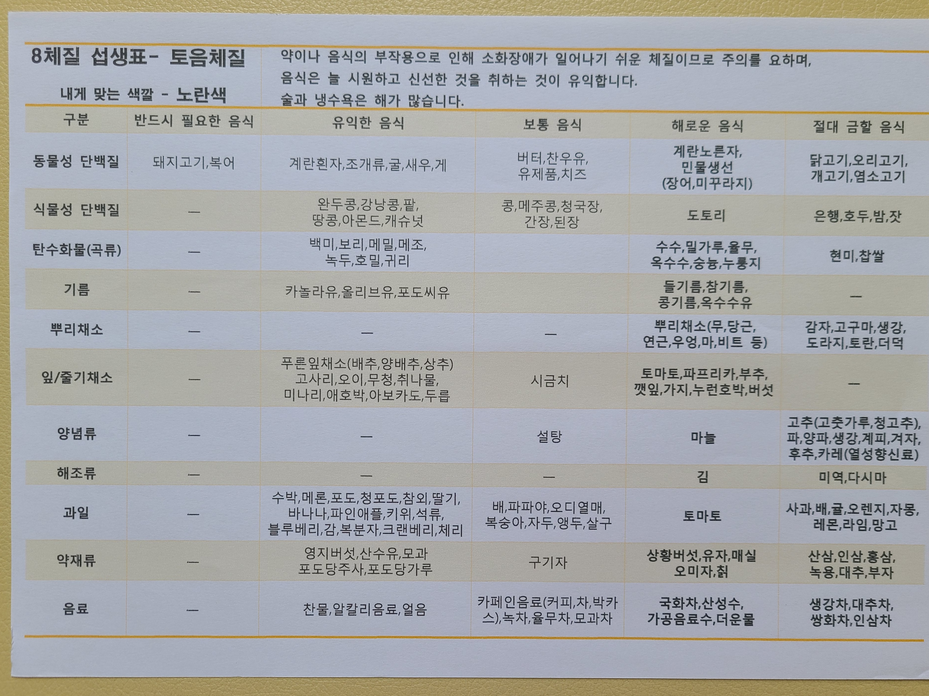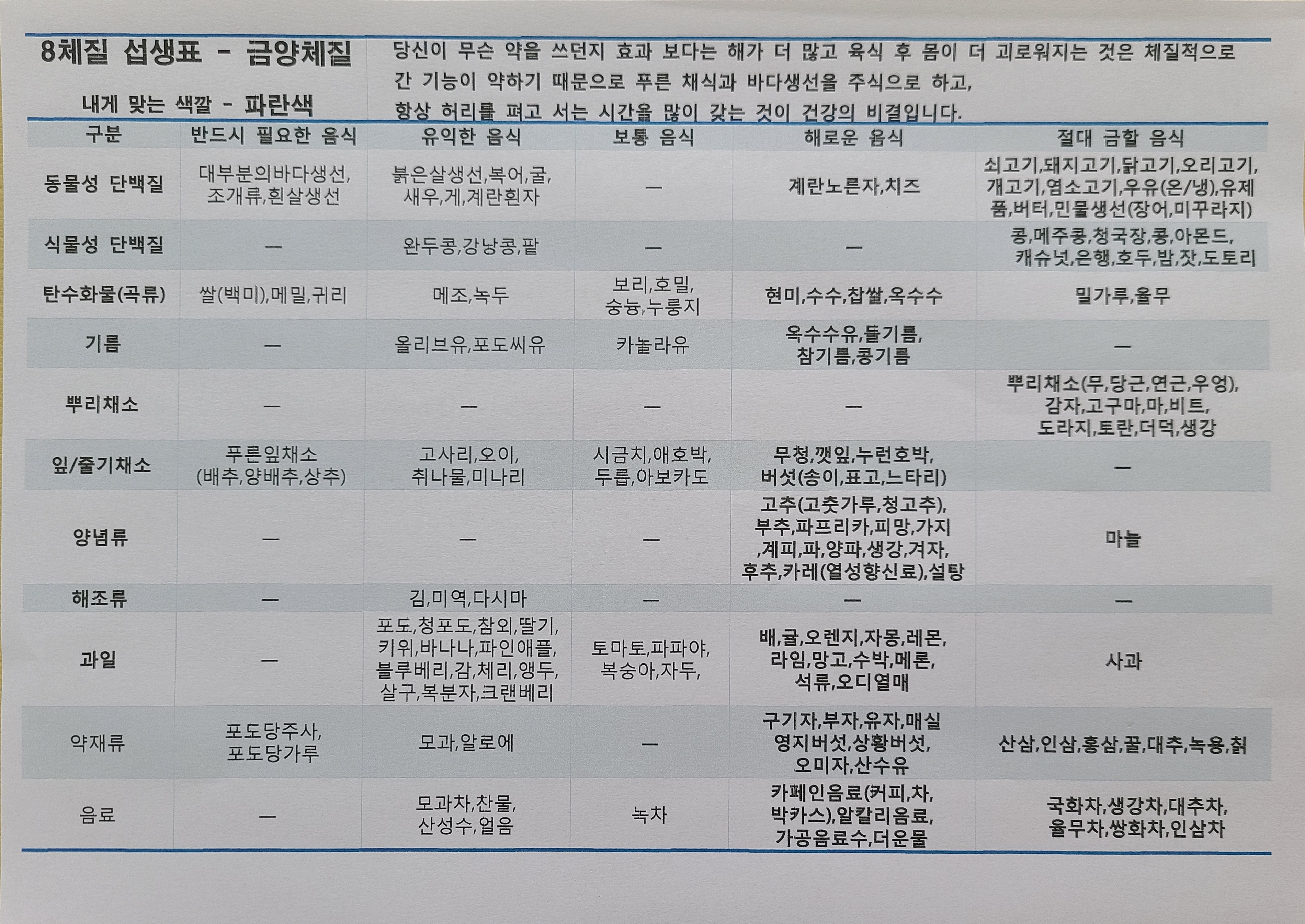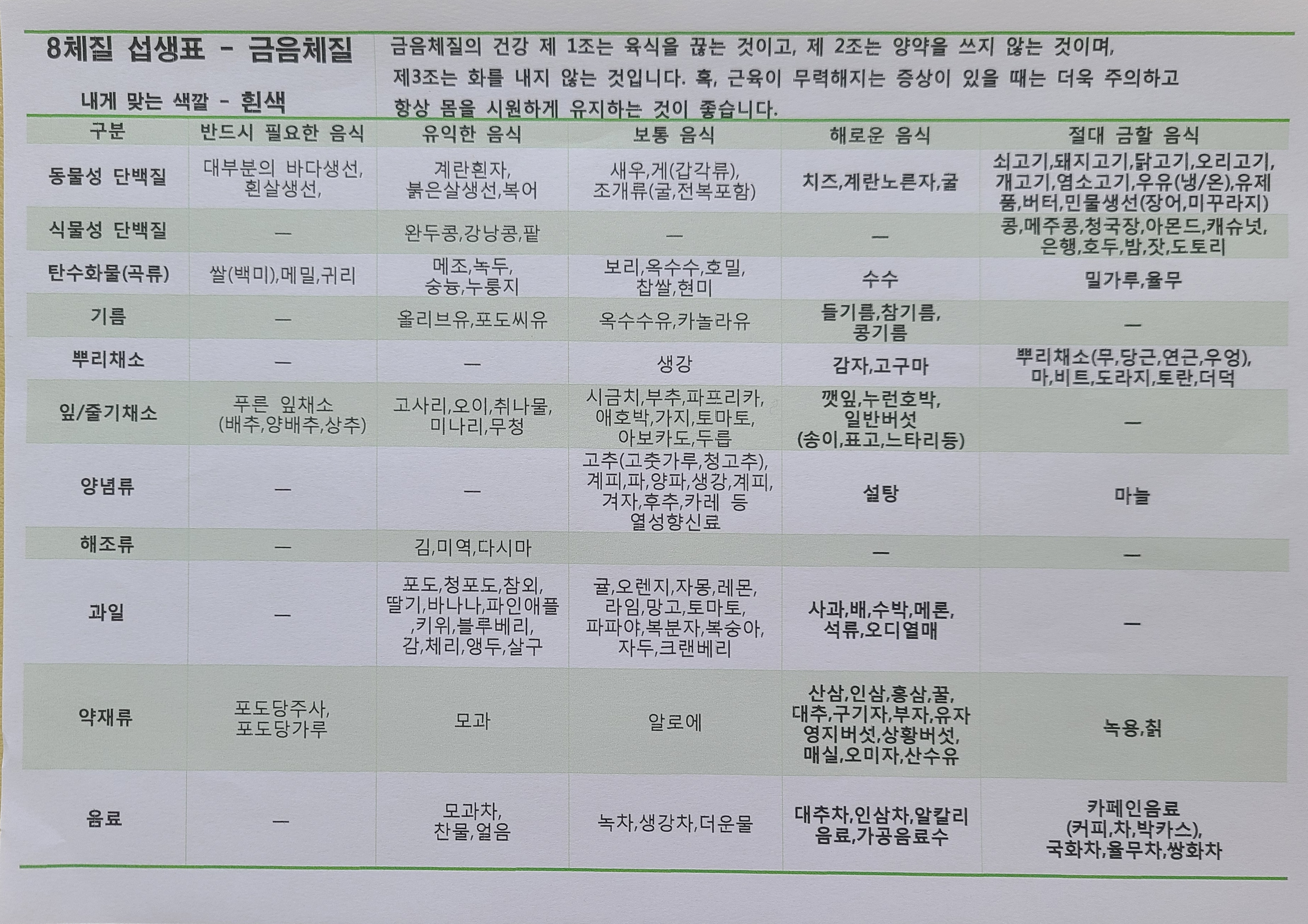 팔 체질 섭생 표