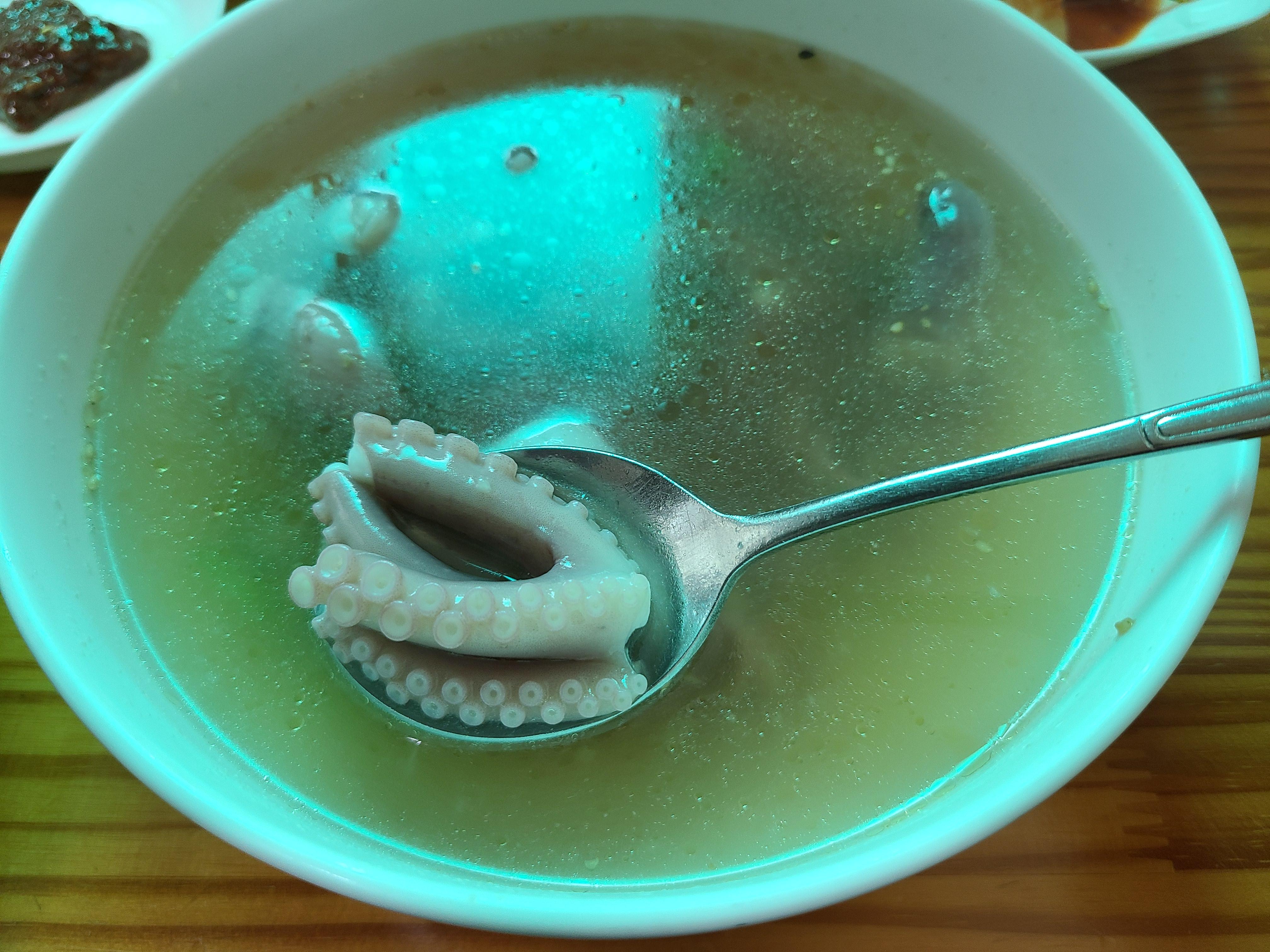 연포탕을 받고 보니 국물에 참기름을 넣었는지 기름기가 보인다. 예전에 먹었을 때도 이랬었나 하며 국물을 먼저 떠먹어 보니 연포탕임에도 쇠고기 국물 맛이 느껴진다. 예전에는 안 그랬던 것 같은데... 다시 한수저를 먹어봐도 마찬가지이다.