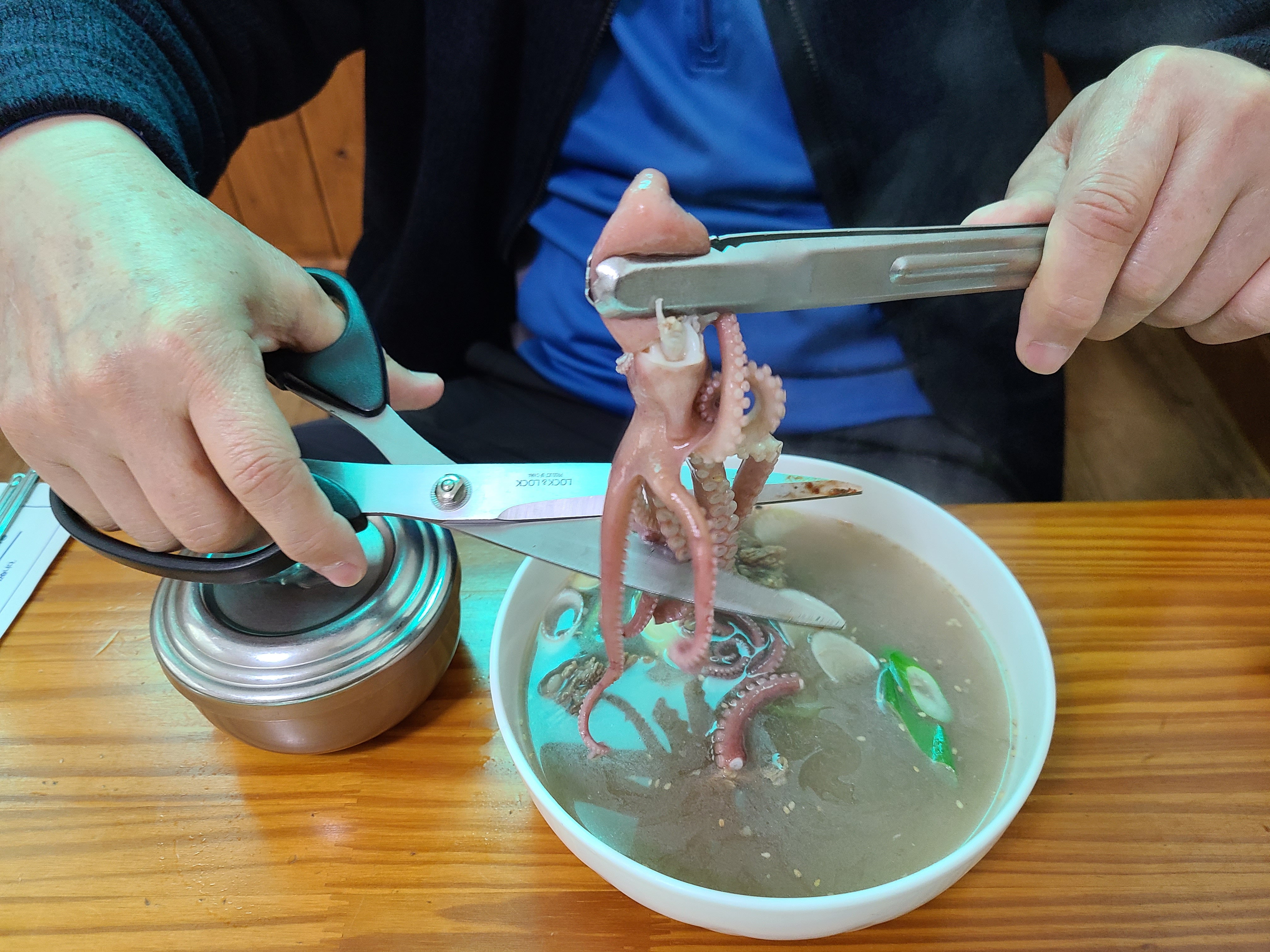 부드러운 세발낙지를 남편이 먹기 좋은 크기로 자르고 있다.