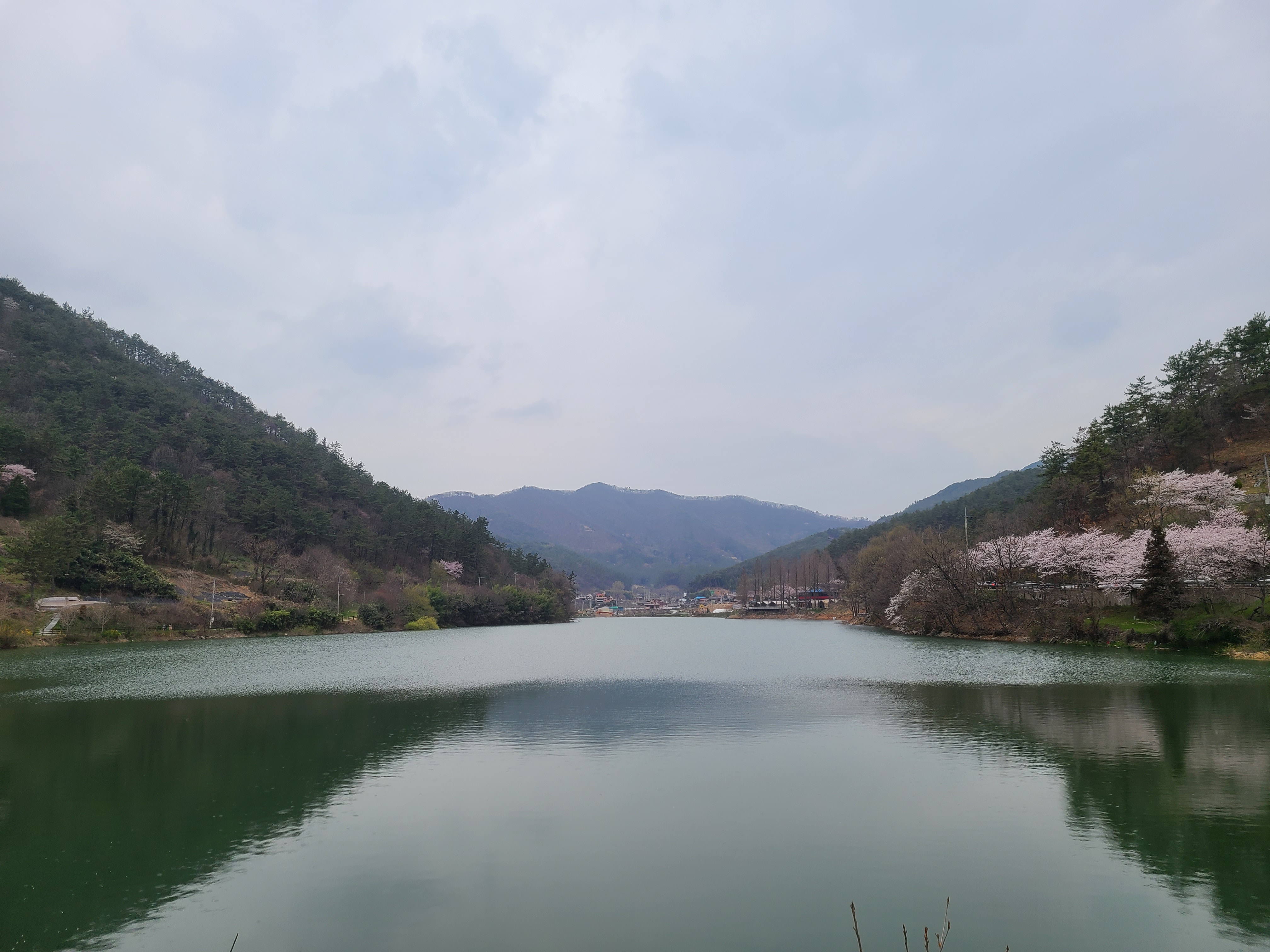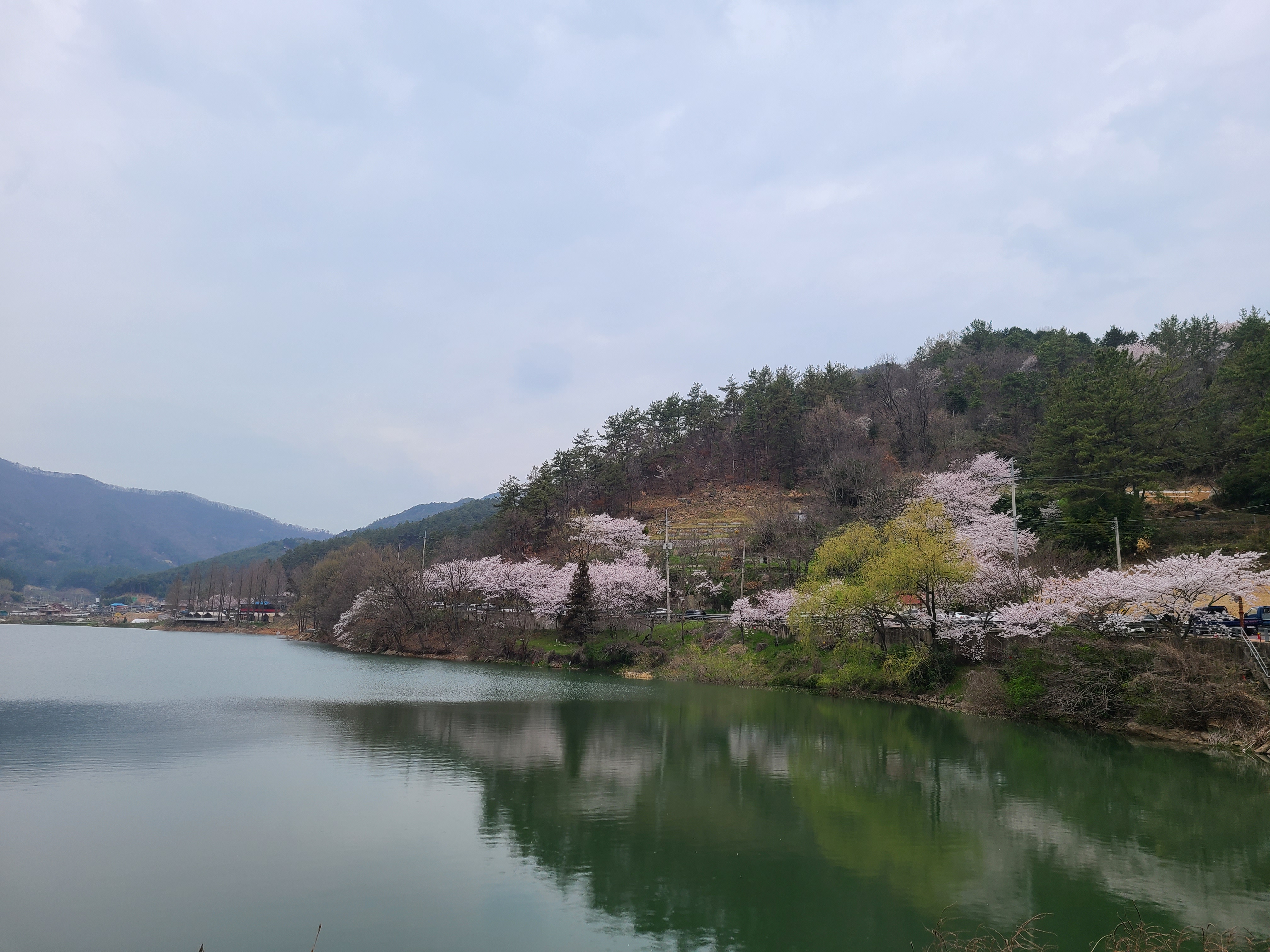저수지 물에 비친 초록의 나무와 벚꽃의 그림자가 멋스럽다.