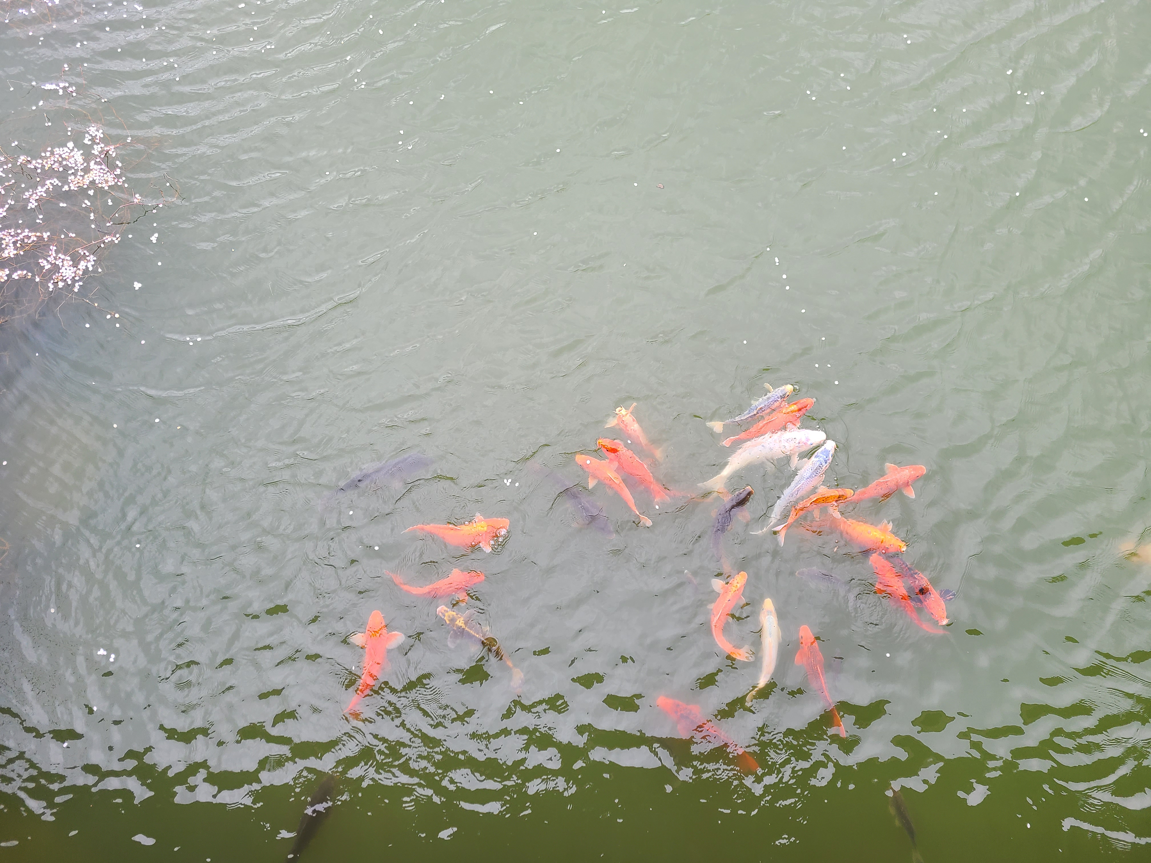 상대포에서 상대포 역사공원으로 이동하면서 보니 물 위에 벚꽃이 떨어져 물결을 따라 흐르고 있다. 다리를 건너니 사람의 인기척을 느꼈는지 잉어들이 몰려온다.