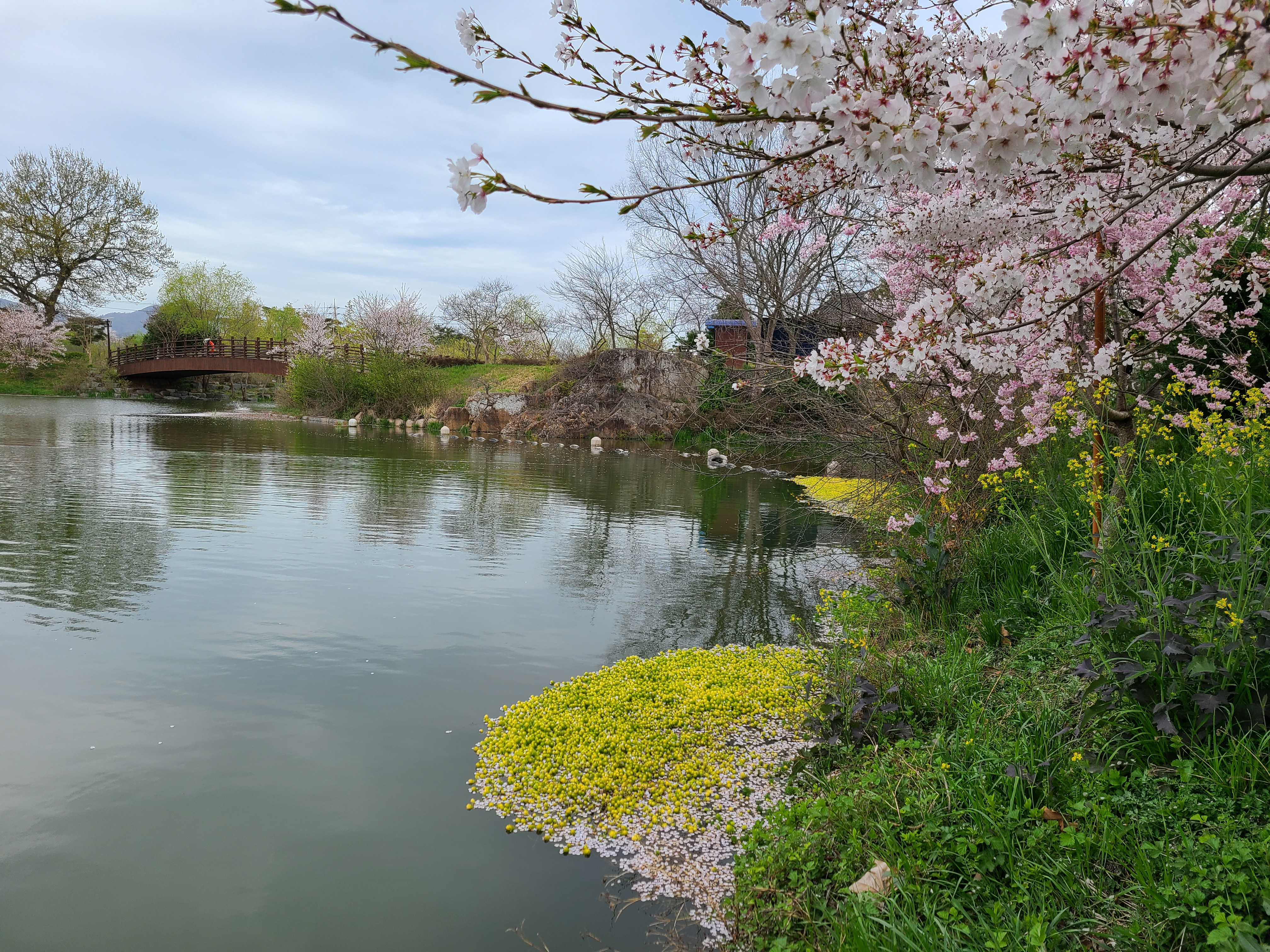 상대포에 파란 수초가 노란 꽃을 피우고 벚꽃이 떨어져 어우러진 모습이 너무도 예쁘다.