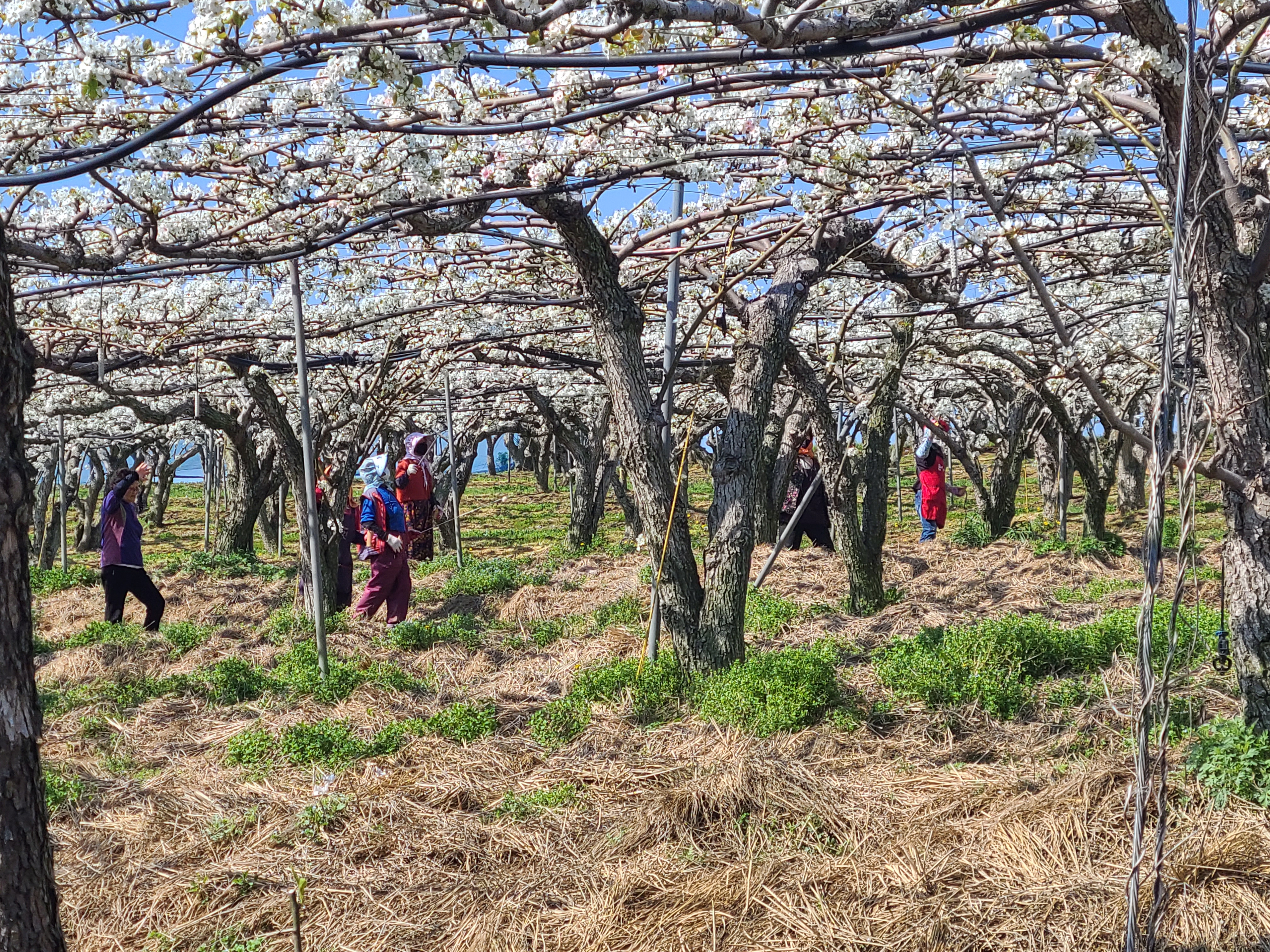 과수원 안쪽의 배나무들과 비교가 되는 것을 볼 수 있다. 요즘은 지역 농업기술센터에서 배 '인공수분용' 꽃가루를 채취해서 "인공수분'을 할 수 있게 보급하기도 한다고 들었다.