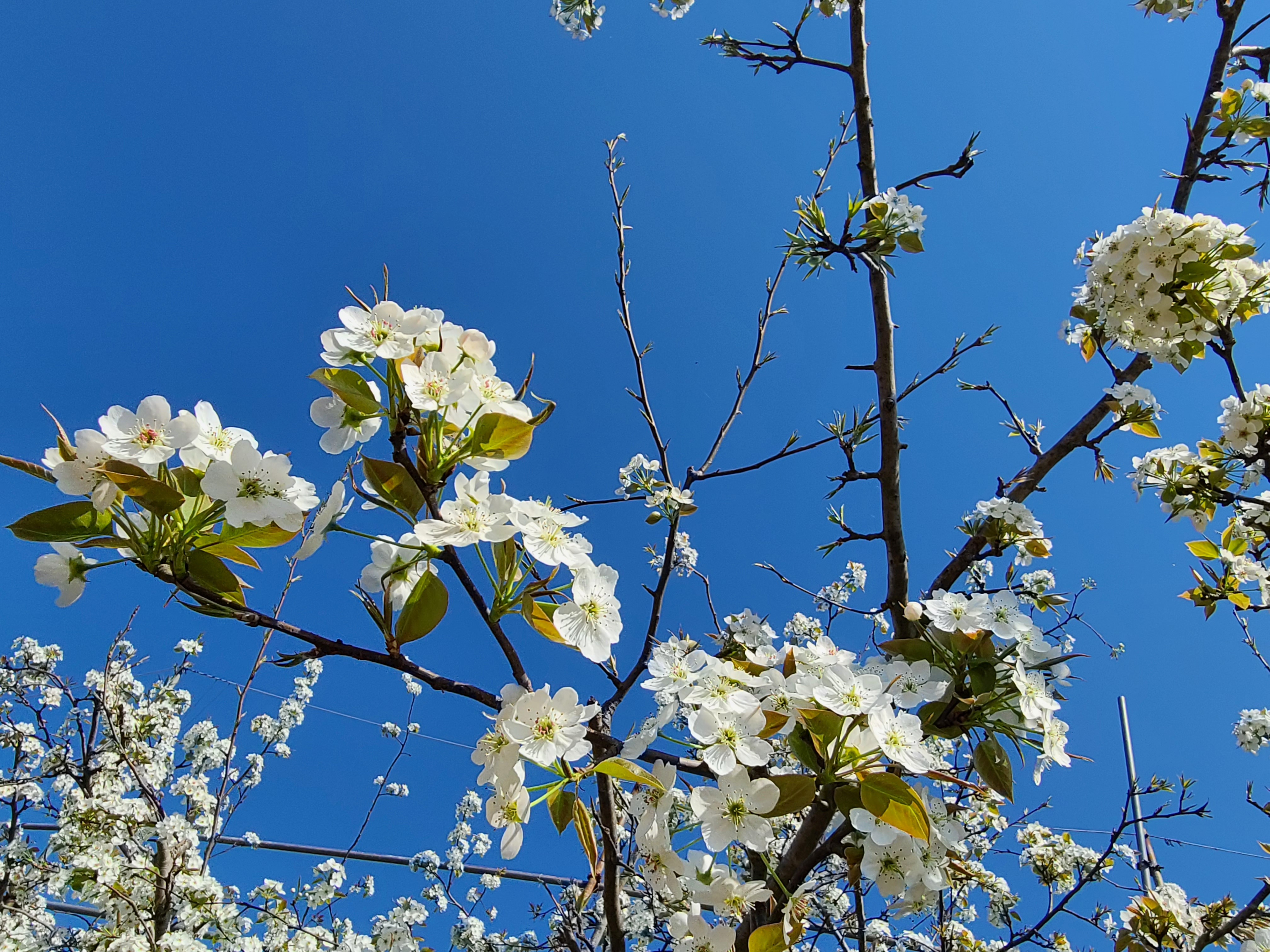 배 과수원 가장자리에,가지치기 없이 높게 자란 배나무에 꽃들이 파란 하늘과 어우러져 너무 아름답다.