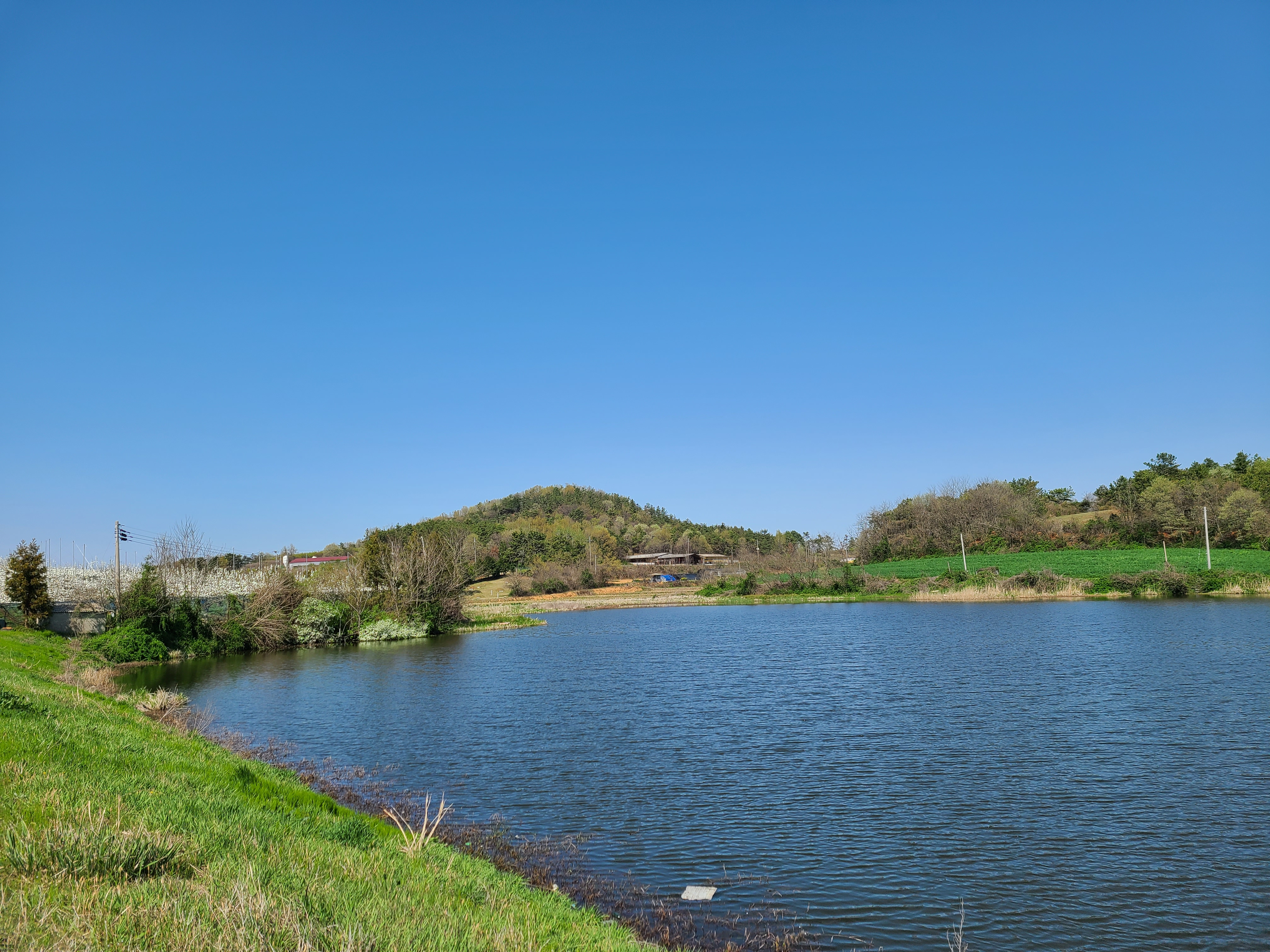날씨가 맑고 화창하니 저수지에 비친 초록빛 나무와 하늘색이 싱그럽다.